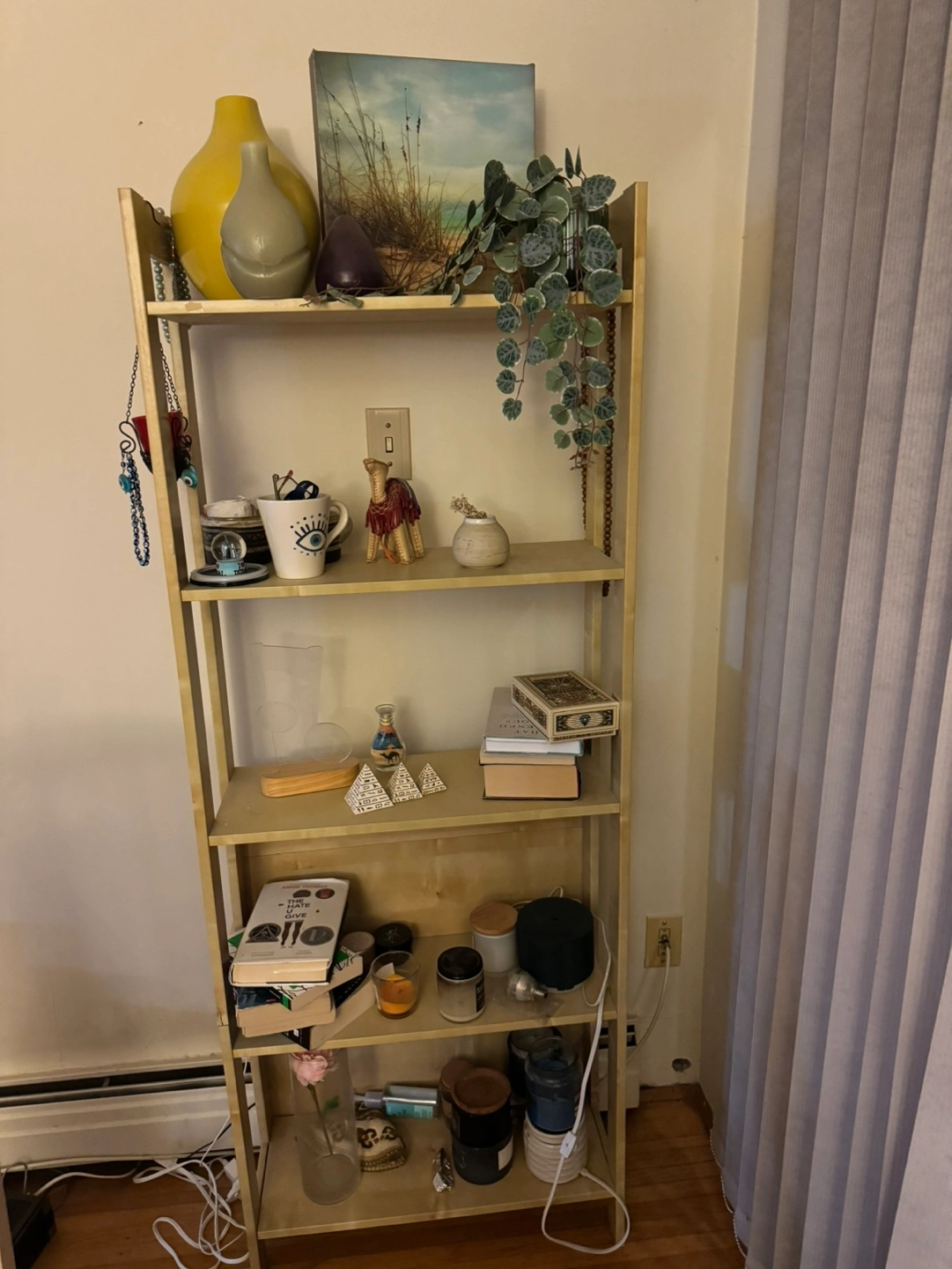 Aesthetic four-shelf wooden bookshelf, good condition! I’m moving so need to get rid of it soon.