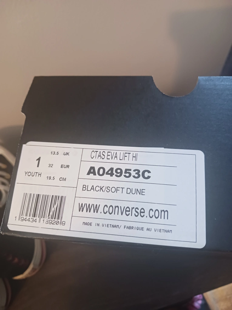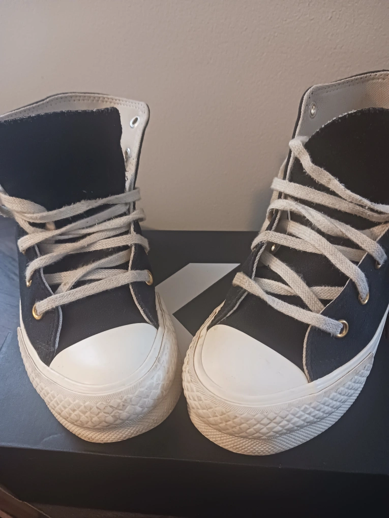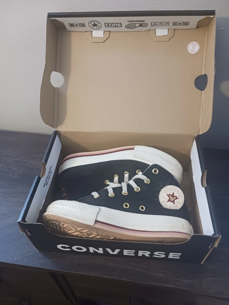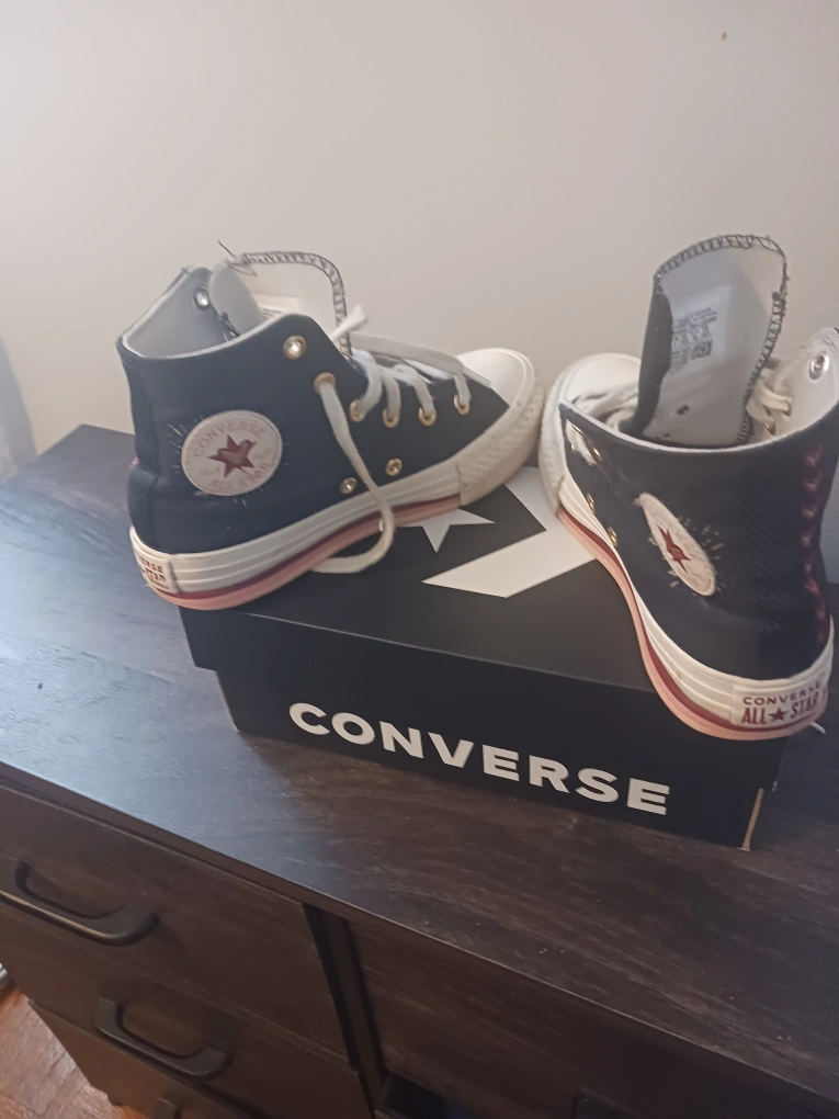 18Black canvas high-top sneakers with a pink trim and gold eyelets. They come with a white sole and are in excellent condition. They are size Youth 1. pick up Lawrence West & Black Creek Cash only