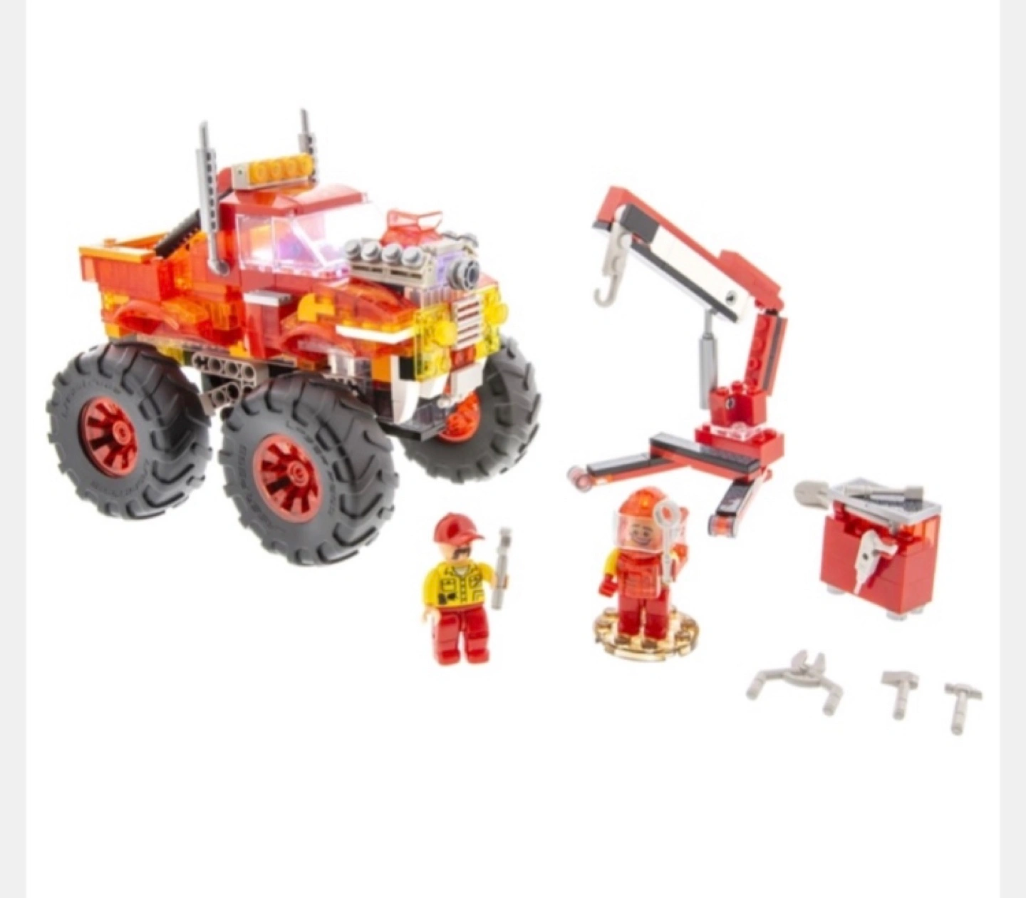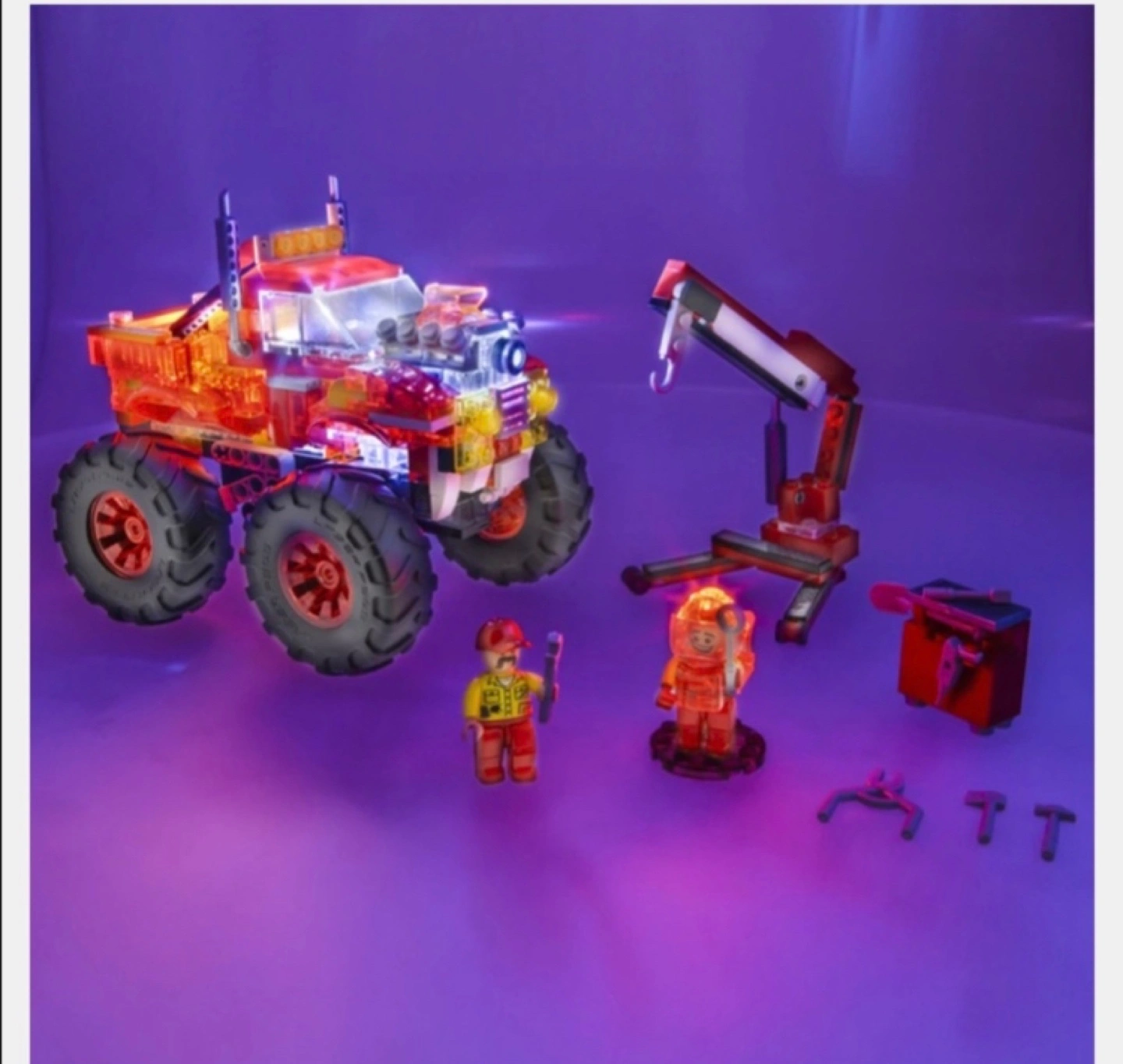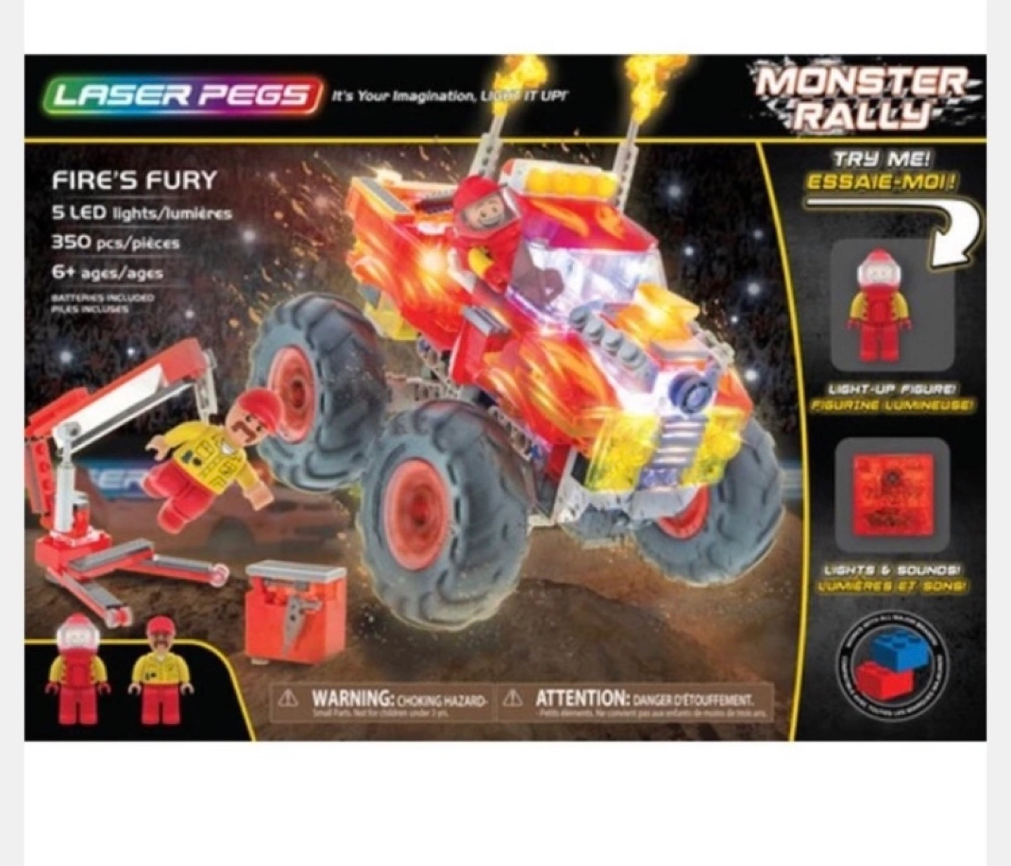 Crush the competition in this light up mega monster truck building set with working suspension and motion activated sound! Fire's Fury features mega-sized monster truck tires, removeable light up engine and motion activated sound effects! Simply tap the truck to start the engine and hear the roar!