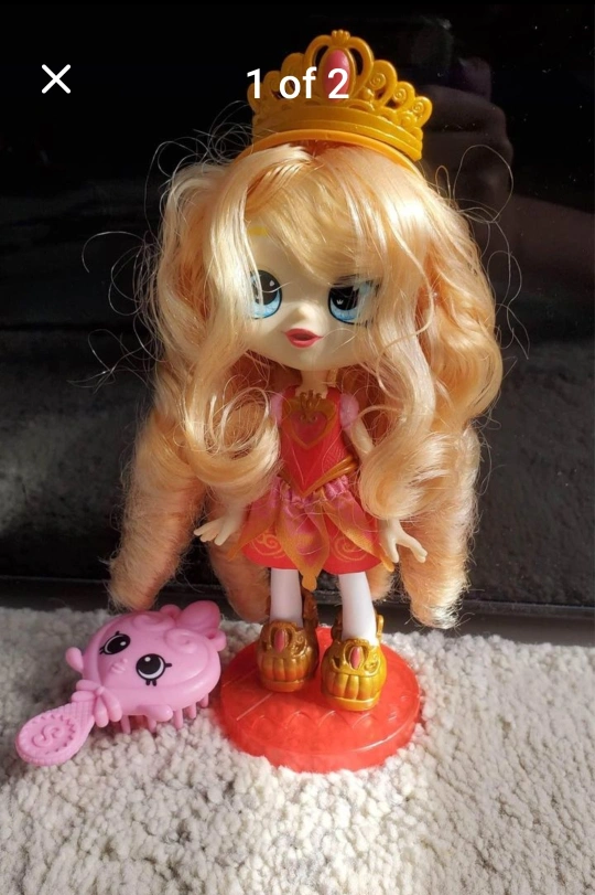 33Shopkins doll with long blonde hair, gold crown, wearing a red dress and gold shoes. Includes a pink hairbrush.