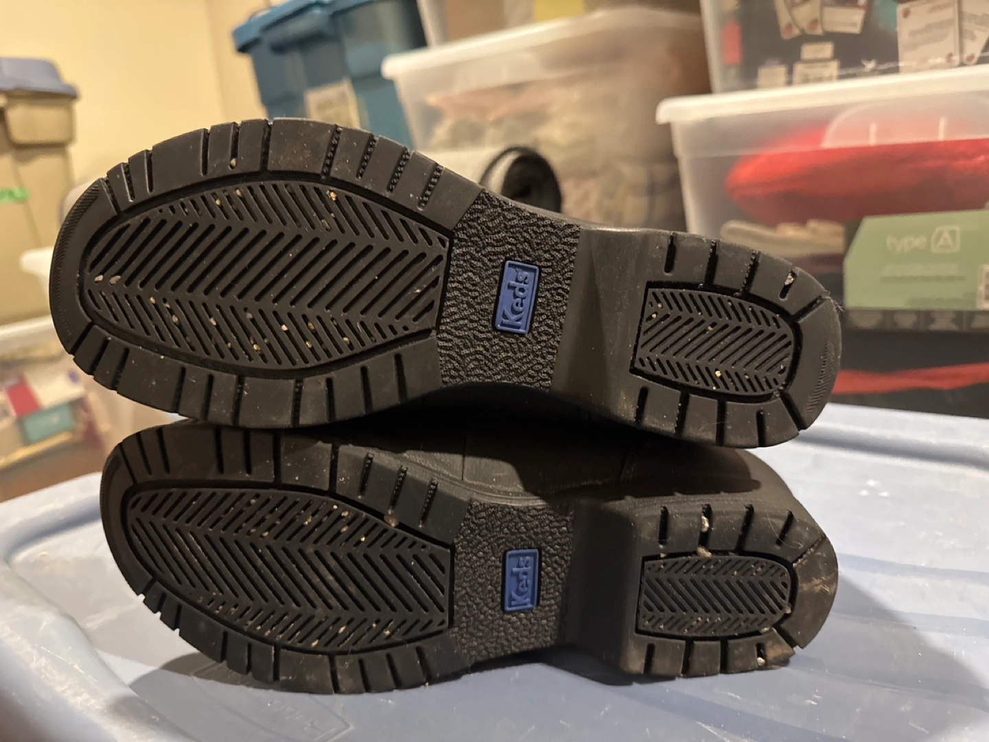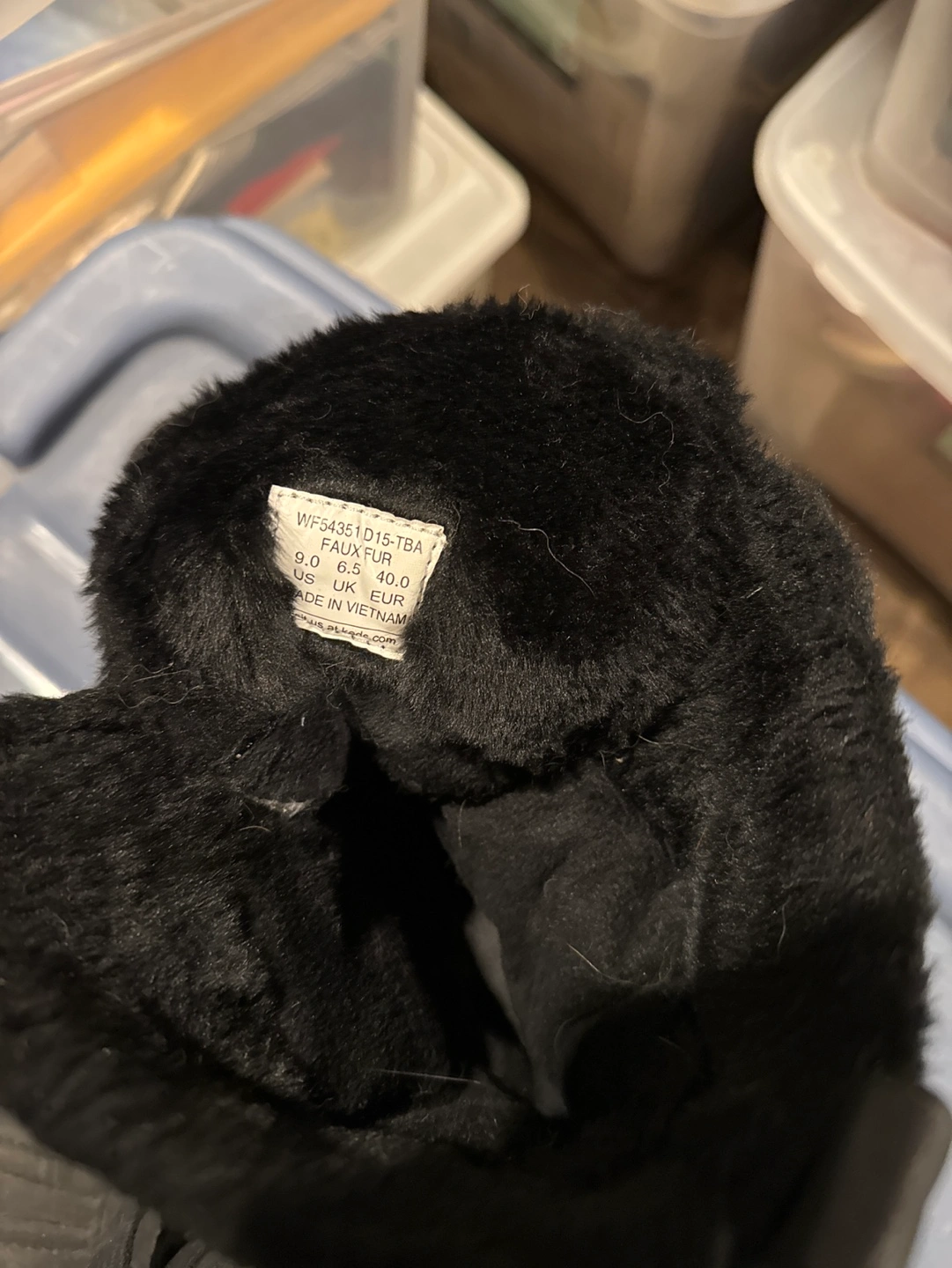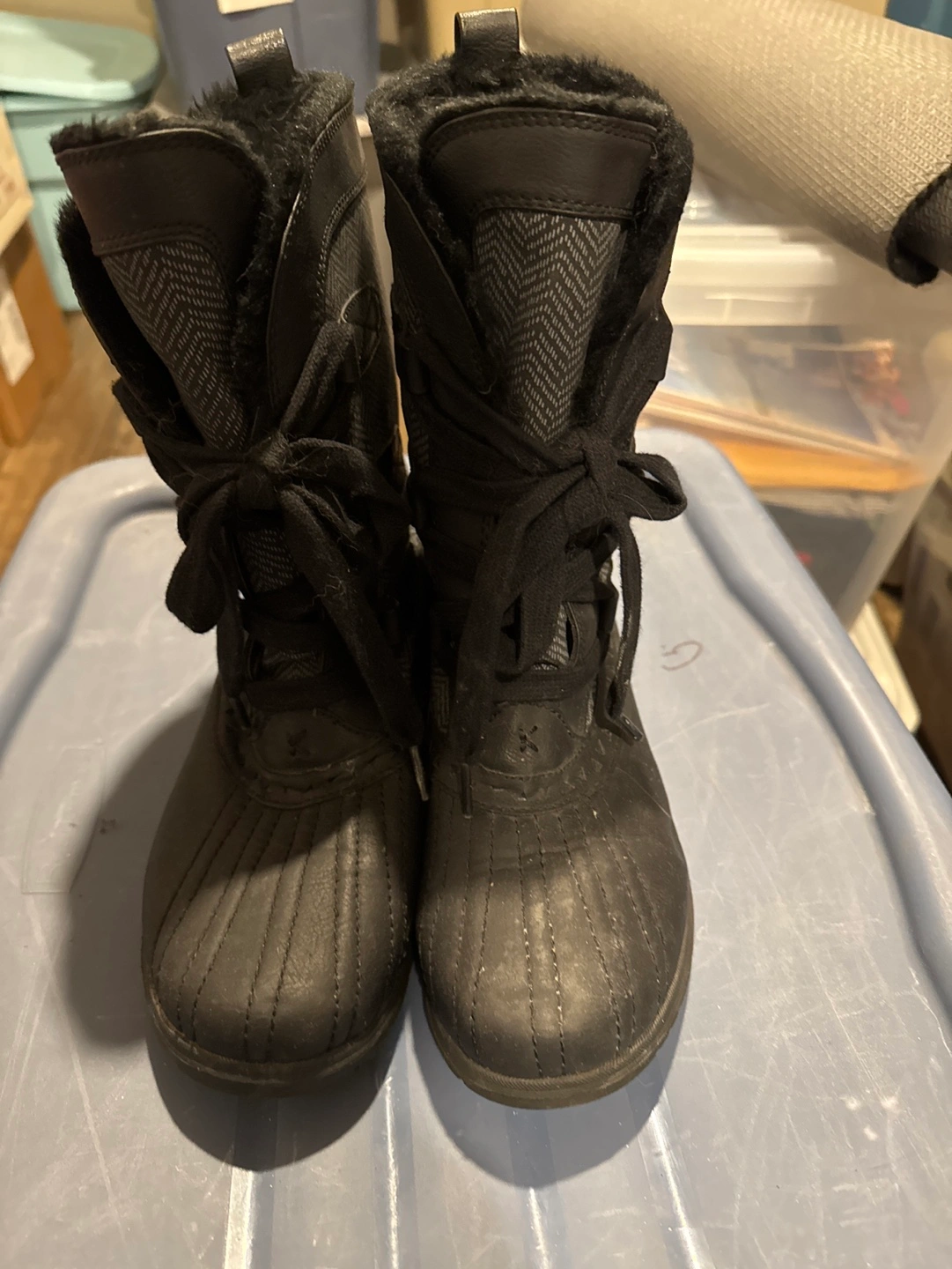 Black winter boots with a herringbone pattern. Lace-up style with a faux fur lining. Size 9.