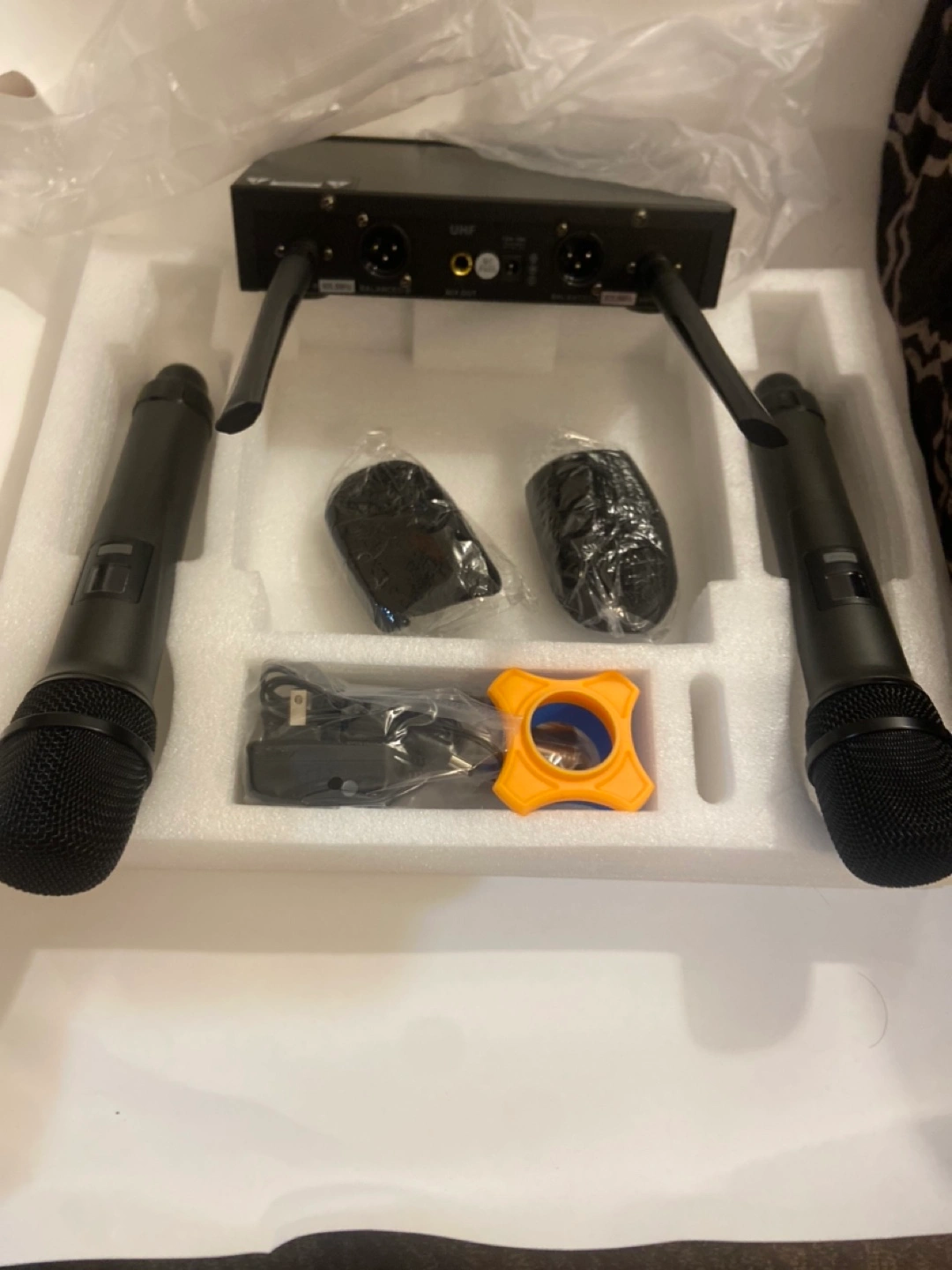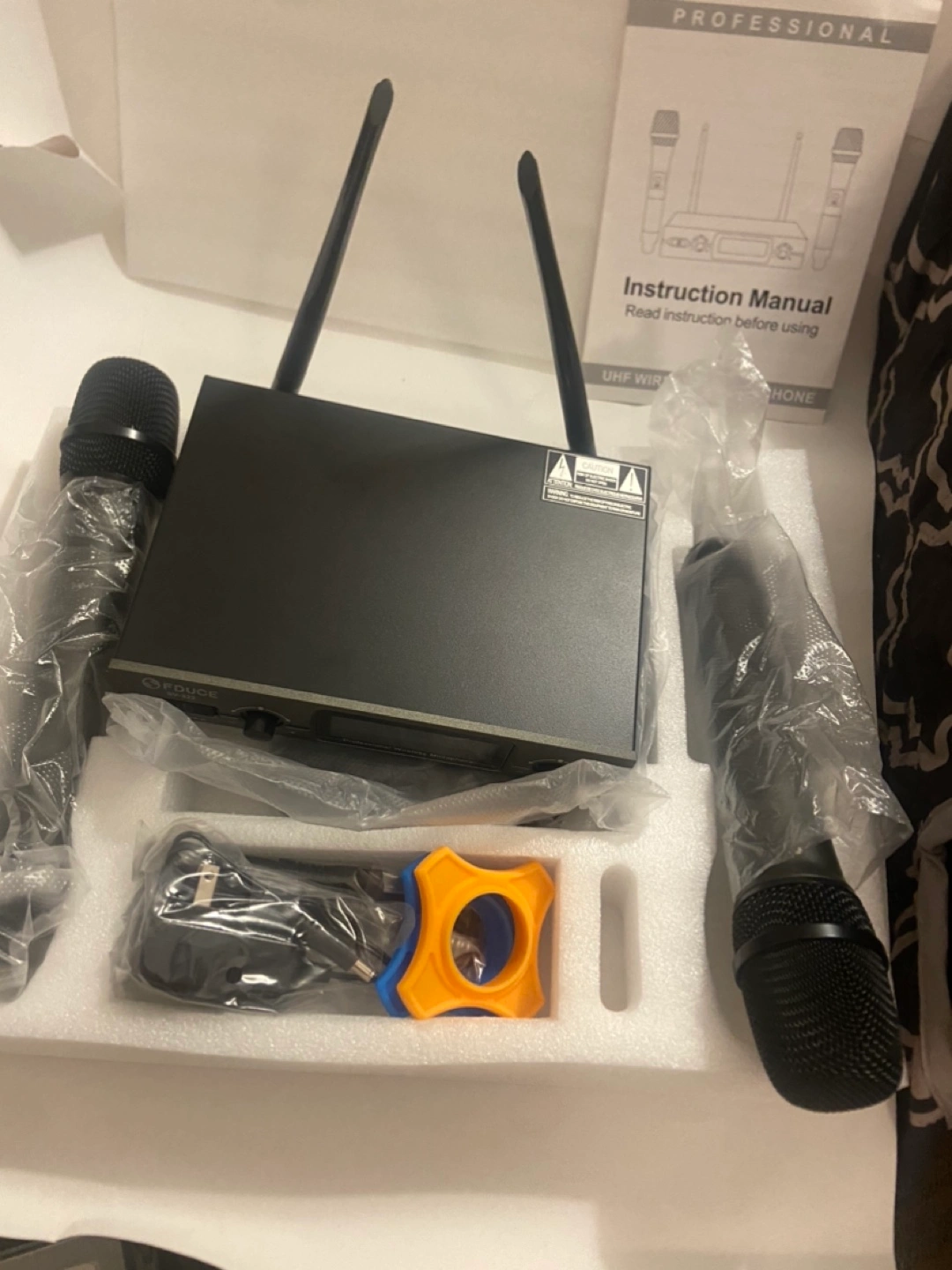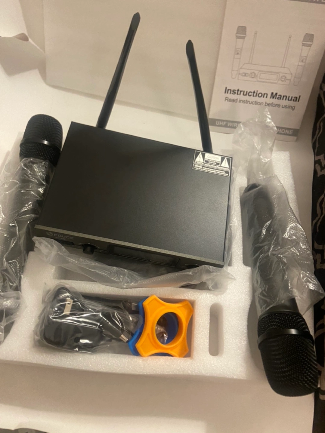 Wireless microphone system with two microphones, receiver, and accessories. New series.