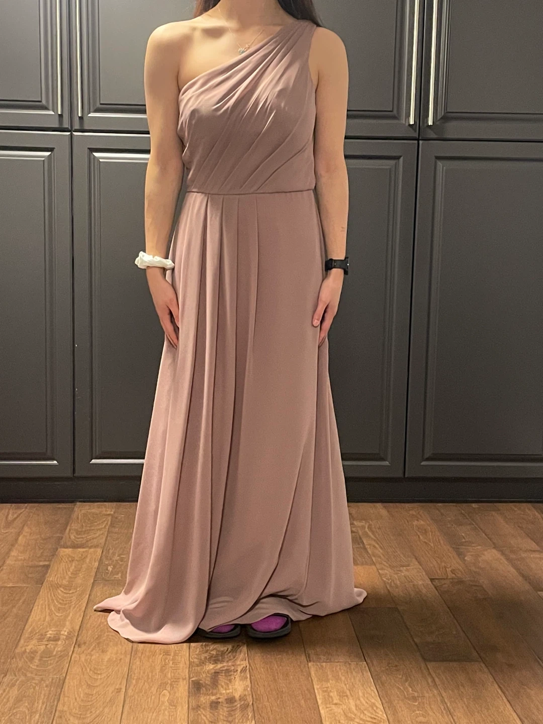 One-shoulder, long dress in a mauve colour. The dress has a flowing skirt and a ruched bodice. The dress is in new condition.