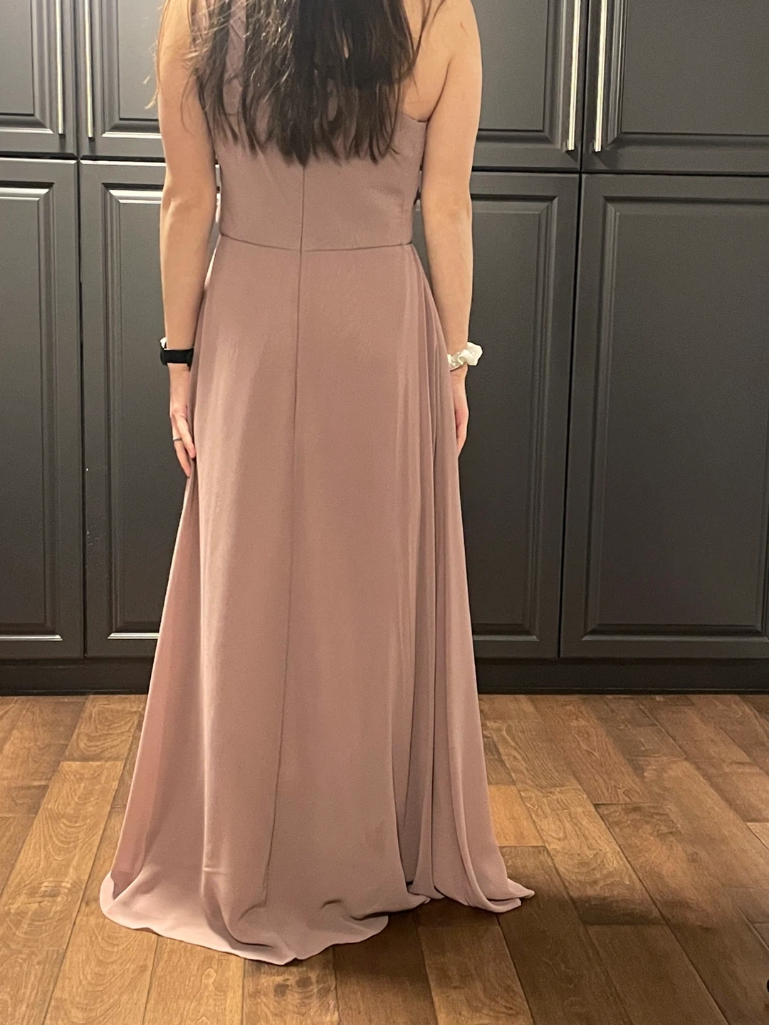 One-shoulder, long dress in a mauve colour. The dress has a flowing skirt and a ruched bodice. The dress is in new condition.