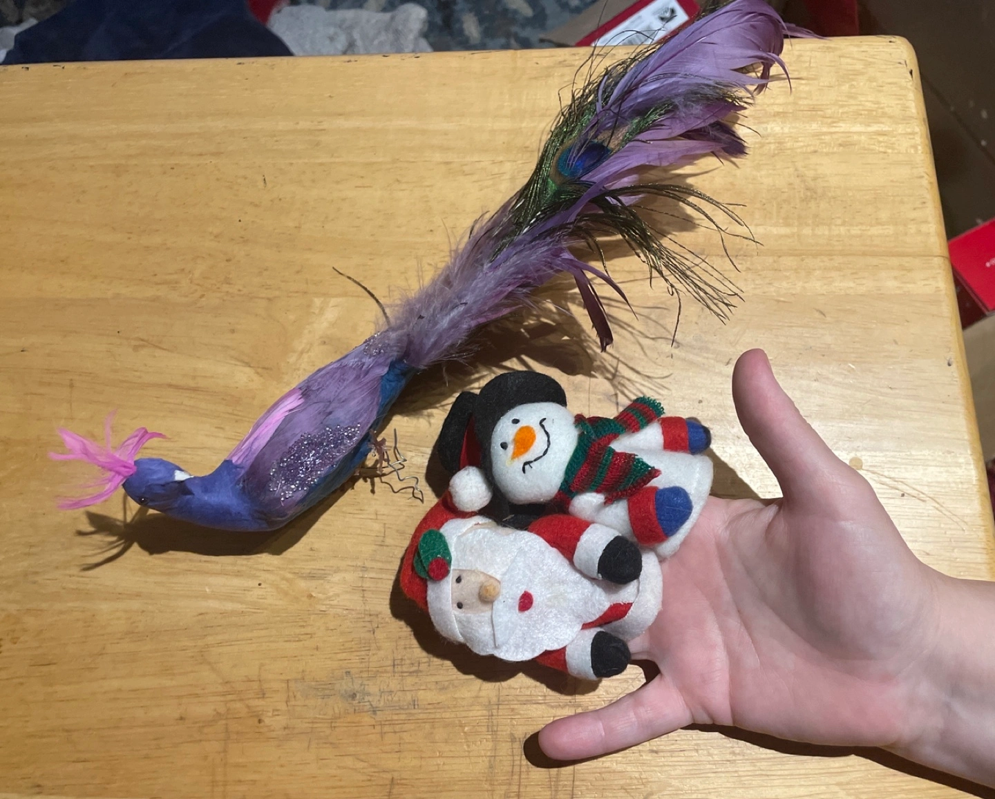 Three Christmas decorations: a purple peacock, and a snowman, and Santa Claus finger puppets. Great for a Christmas tree or a holiday centrepiece.
