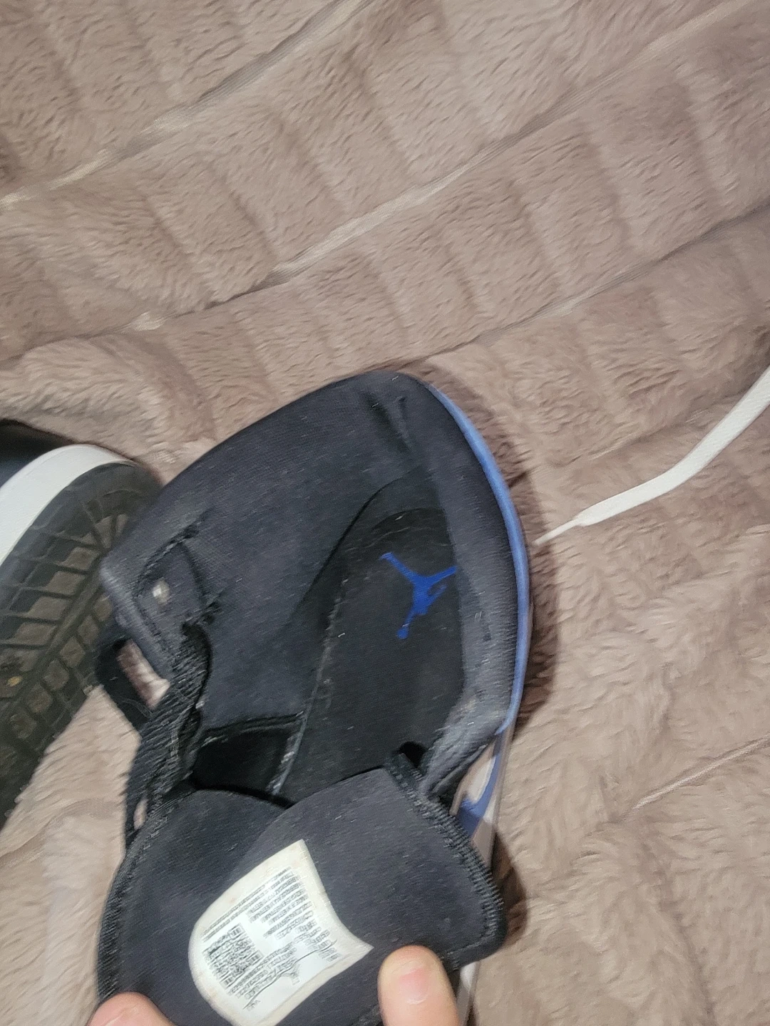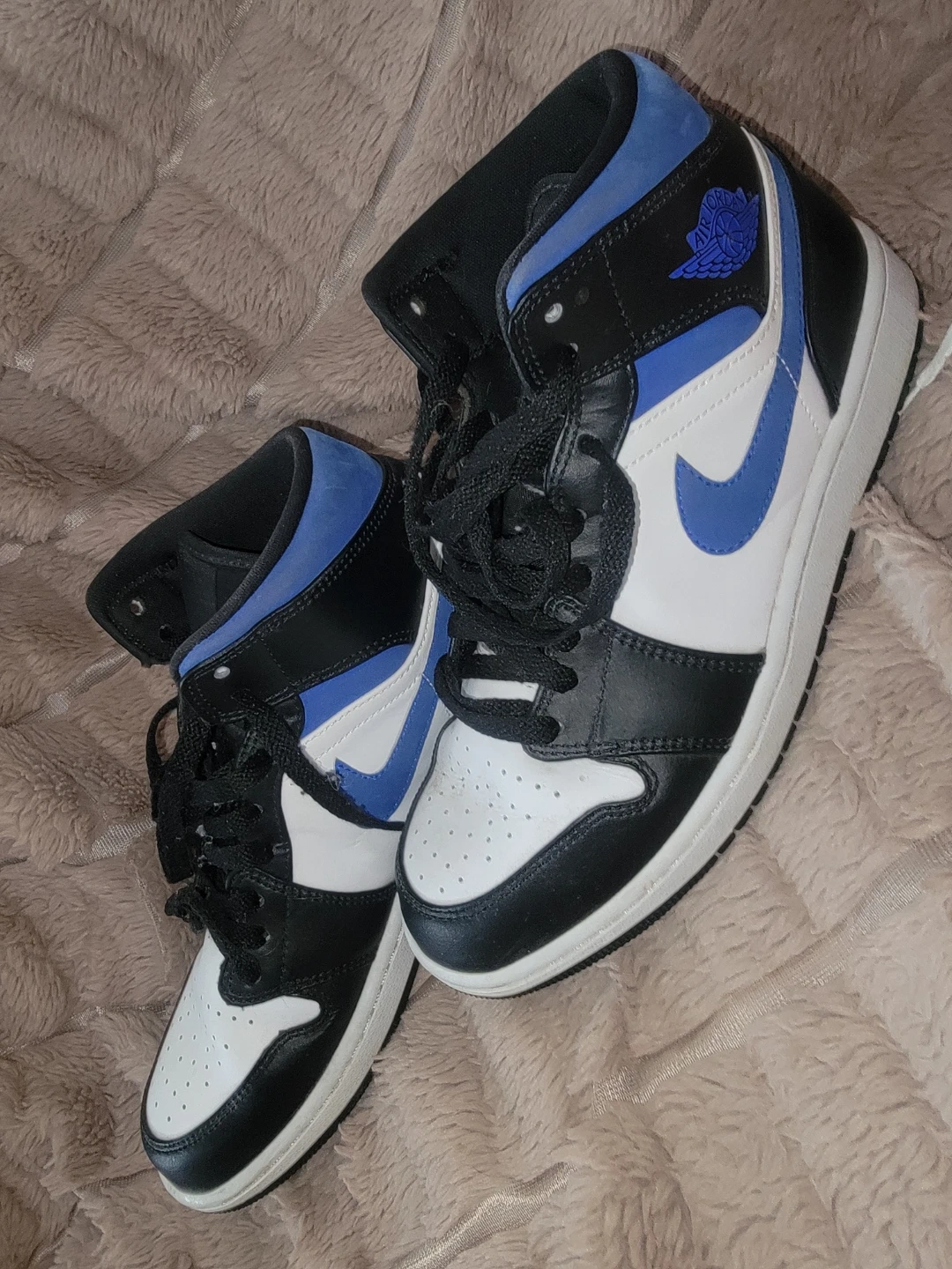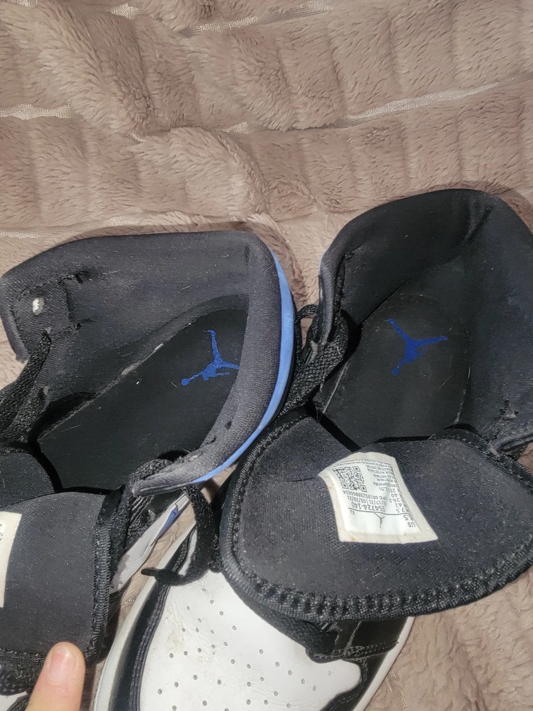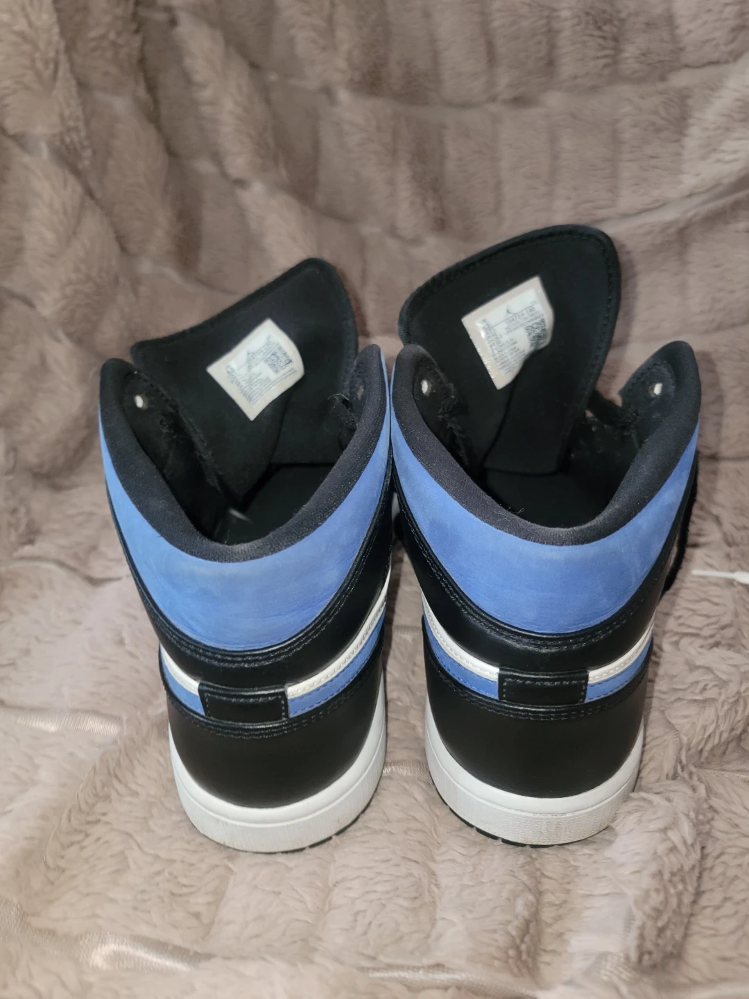 These are Nike Air Jordan 1 High OG sneakers. They feature a black, white, and blue colourway with a leather and suede construction. The iconic Jumpman logo is visible on the tongue and insole. This classic silhouette is perfect for sneaker enthusiasts and everyday wear.
