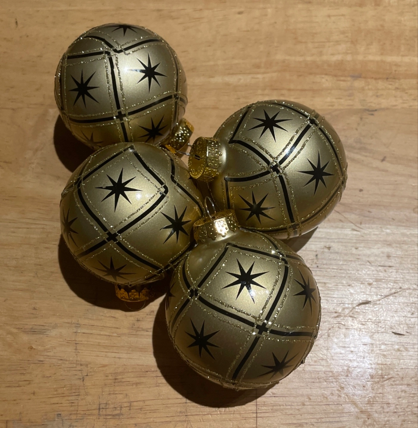 Set of four plastic Christmas ornaments. Gold colour with black stars.