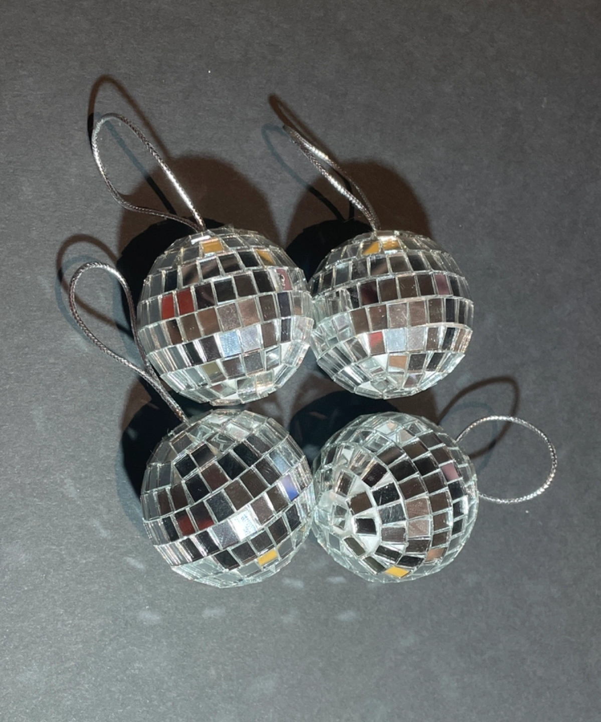 Set of 4 small disco ball ornaments. Perfect for a party or to add some sparkle to your Christmas tree.