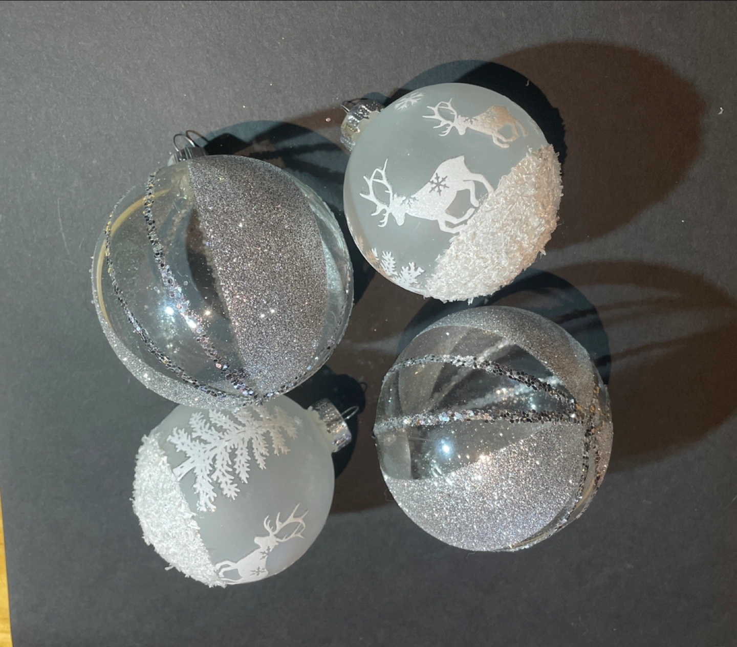 Set of 4 glassChristmas ornaments. Silver and white with glitter and various designs.