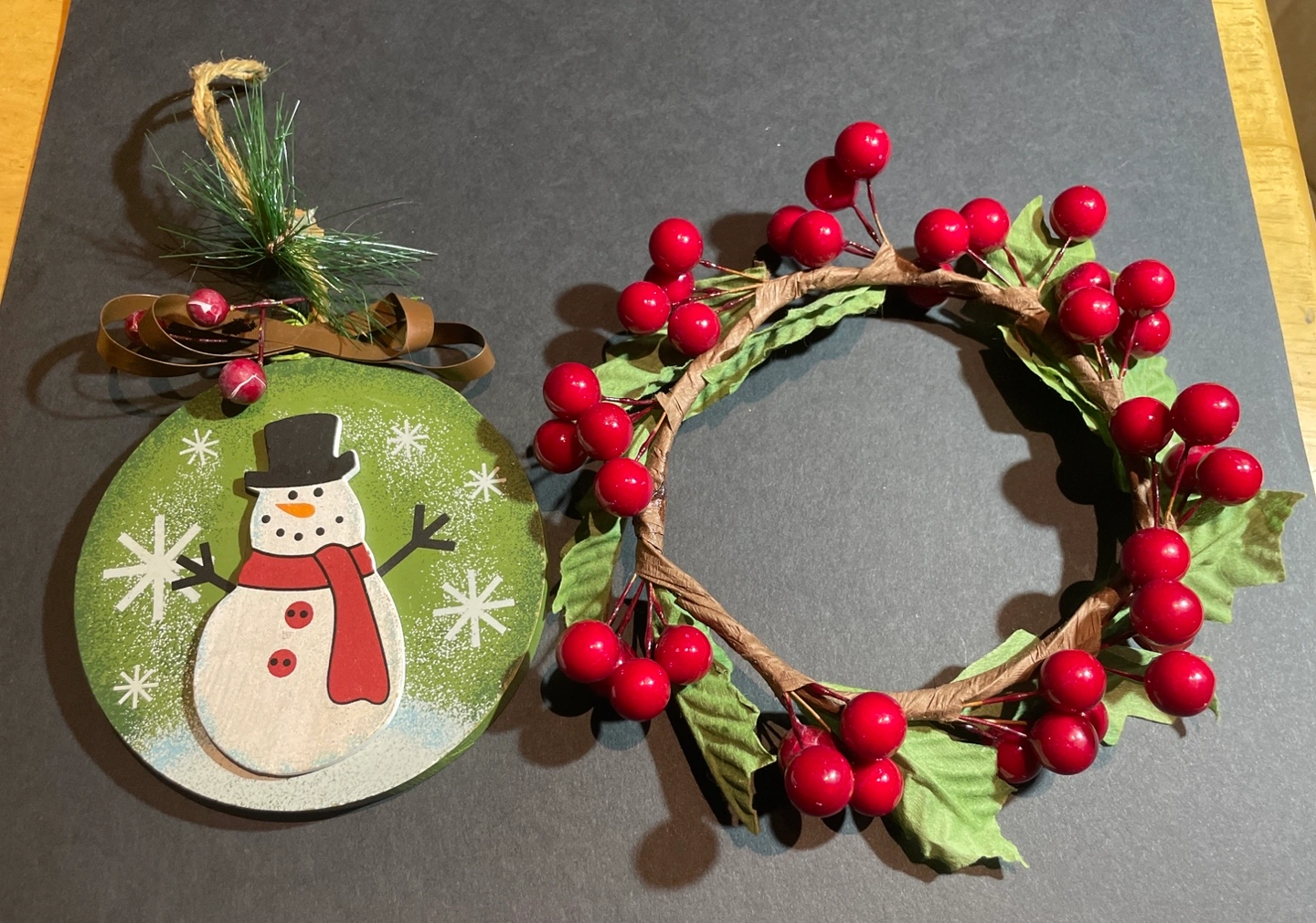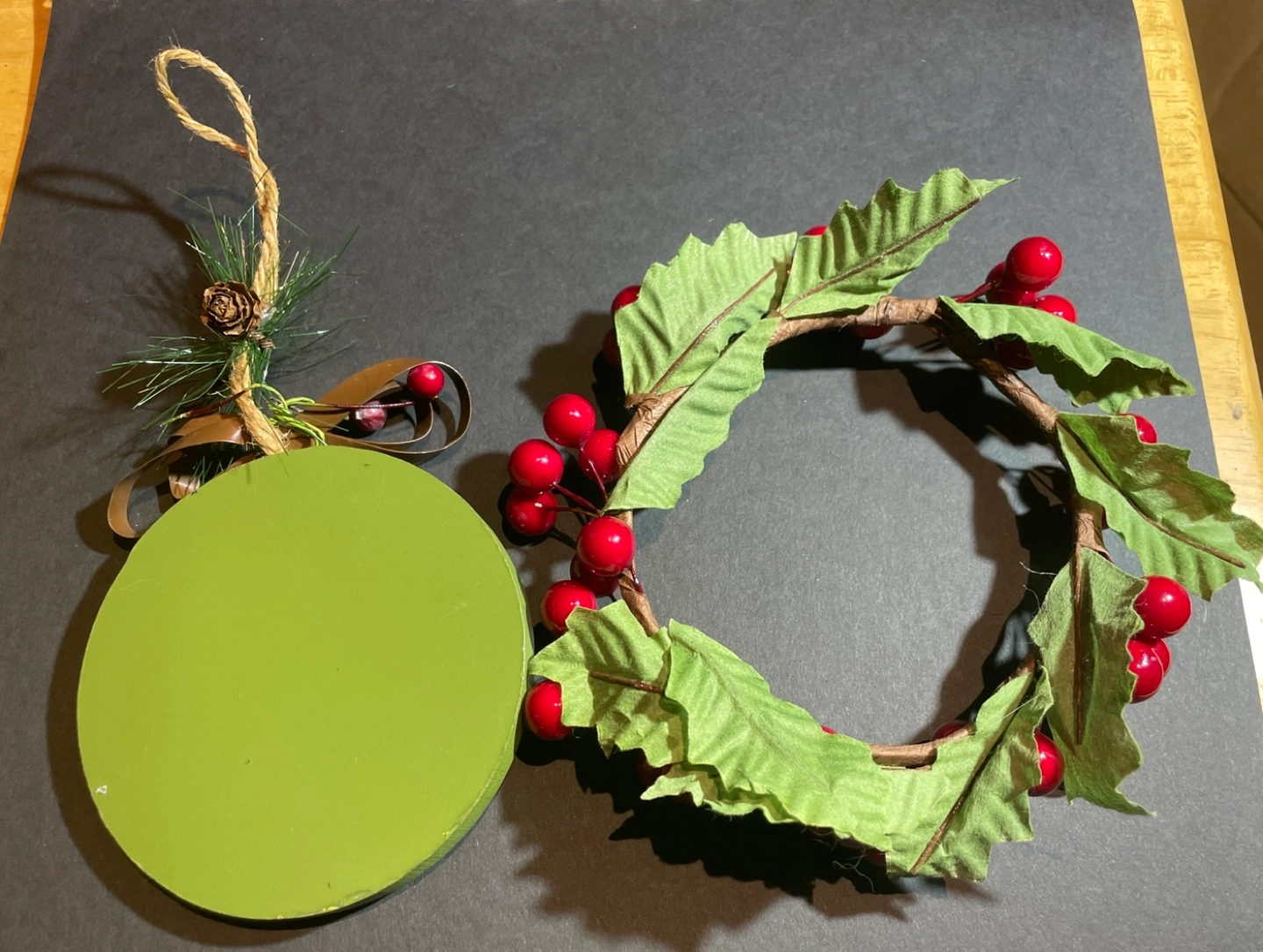 A set of two Christmas decorations, one ornament and one wreath, with a green base and red berries.