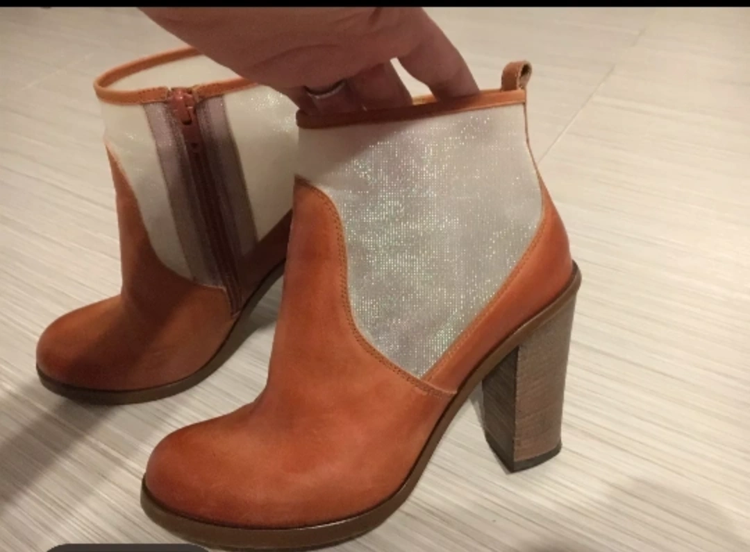 Brown leather ankle boots with a block heel and a zipper detail. They are made of genuine leather and have a mesh panel on the side.