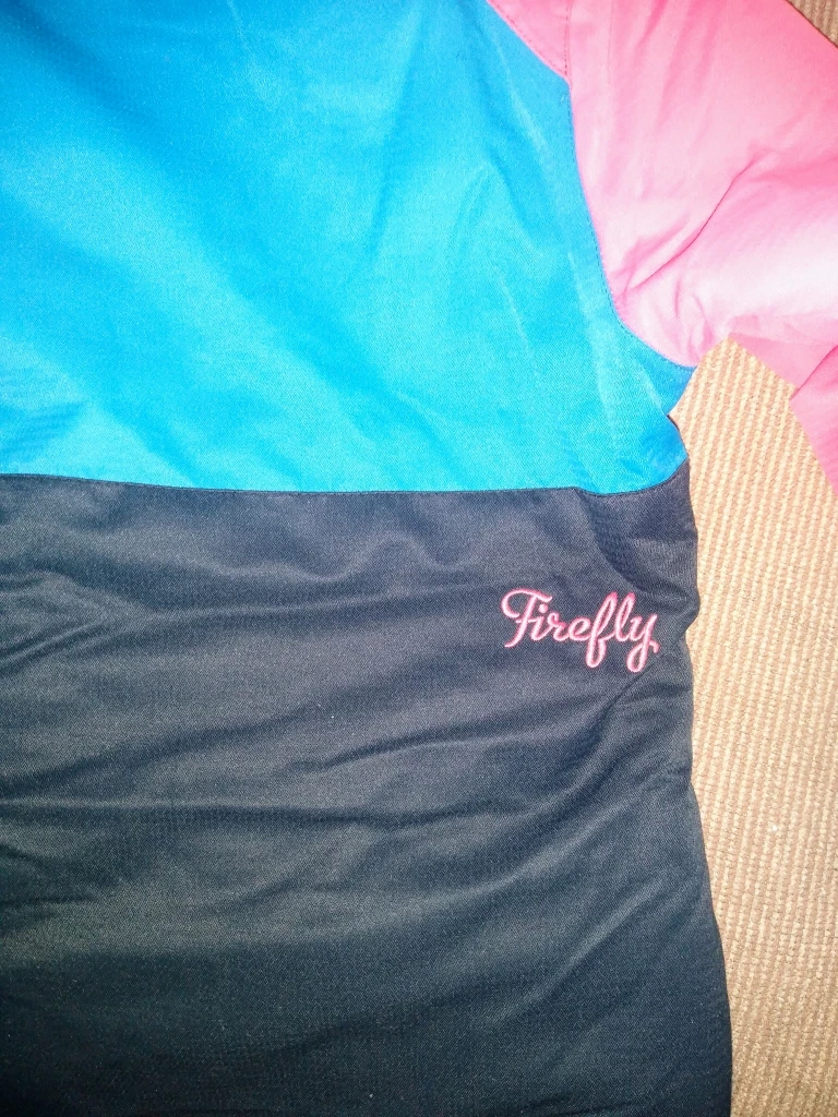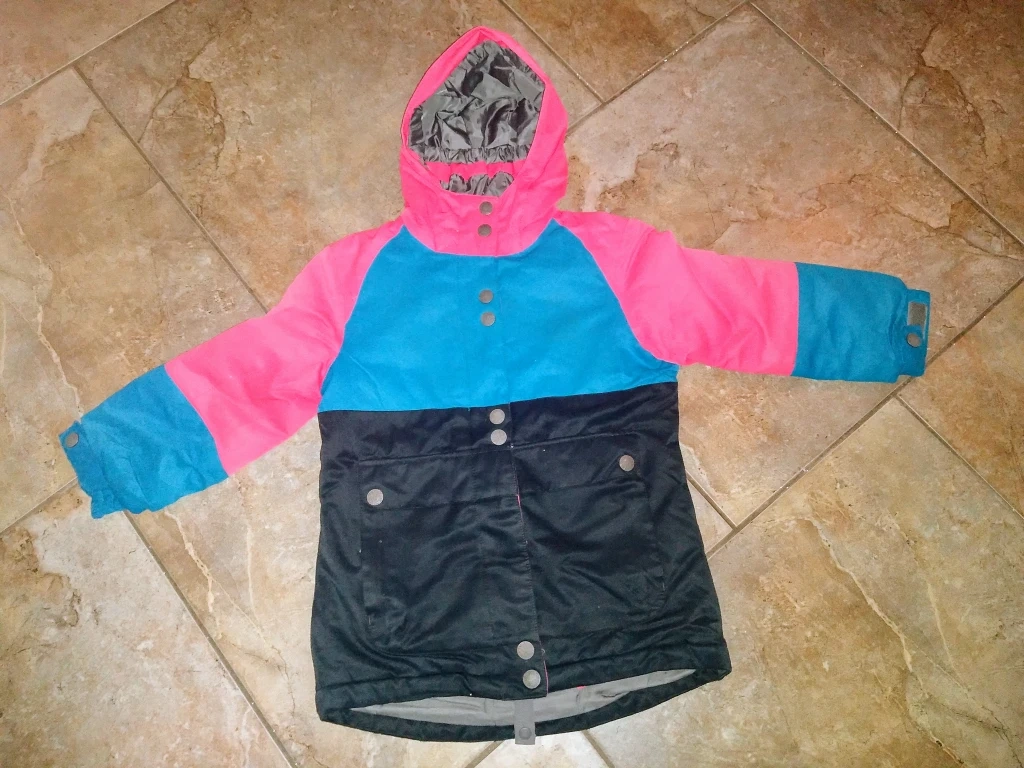 Child's winter coat with a black, pink, and blue color scheme. Has an adjustable hood and snaps for attaching to snowpants if desired. Also has zippered and snap closure outside pockets as well as inside pockets. Used for only one season and in great condition.
