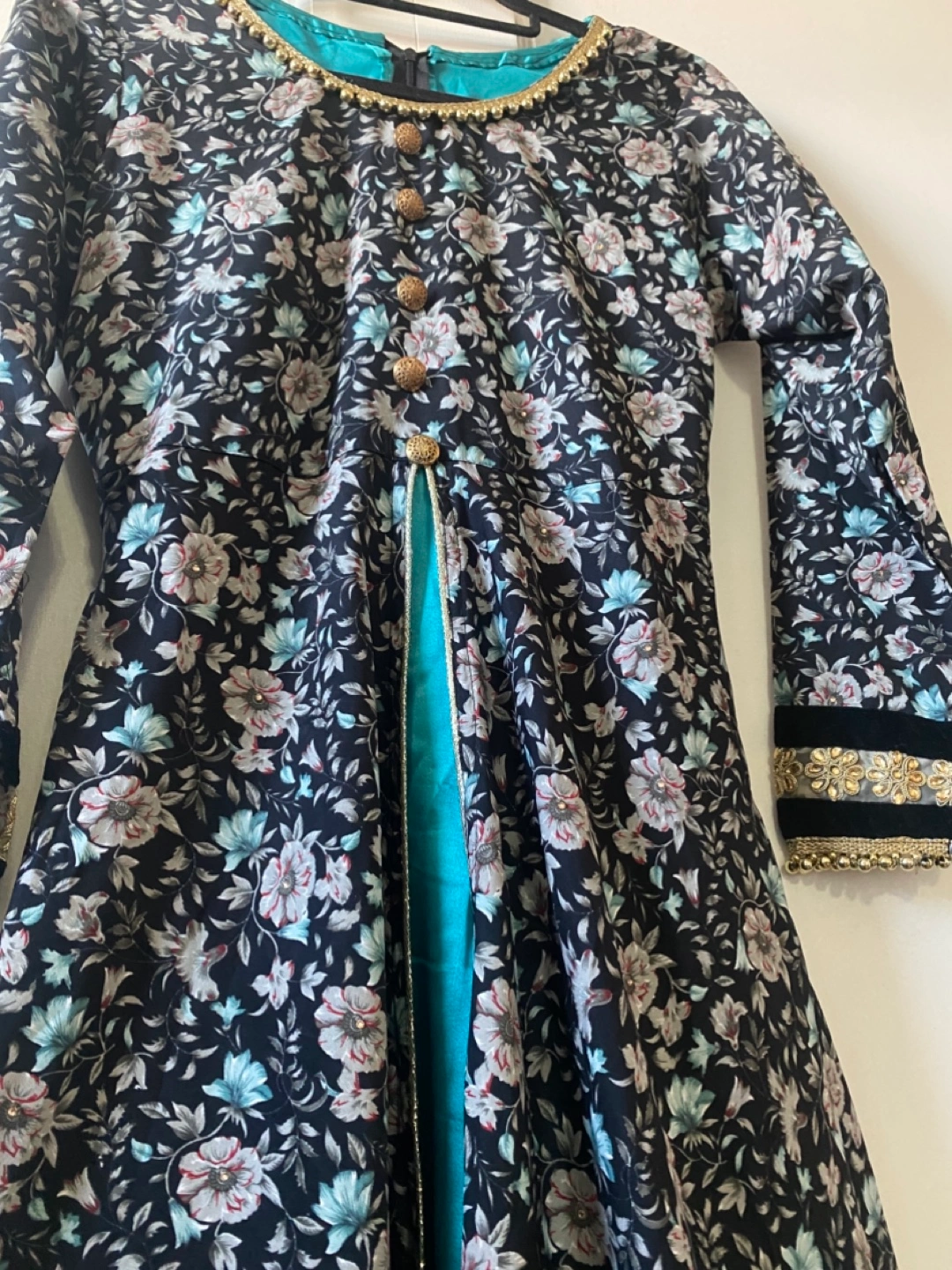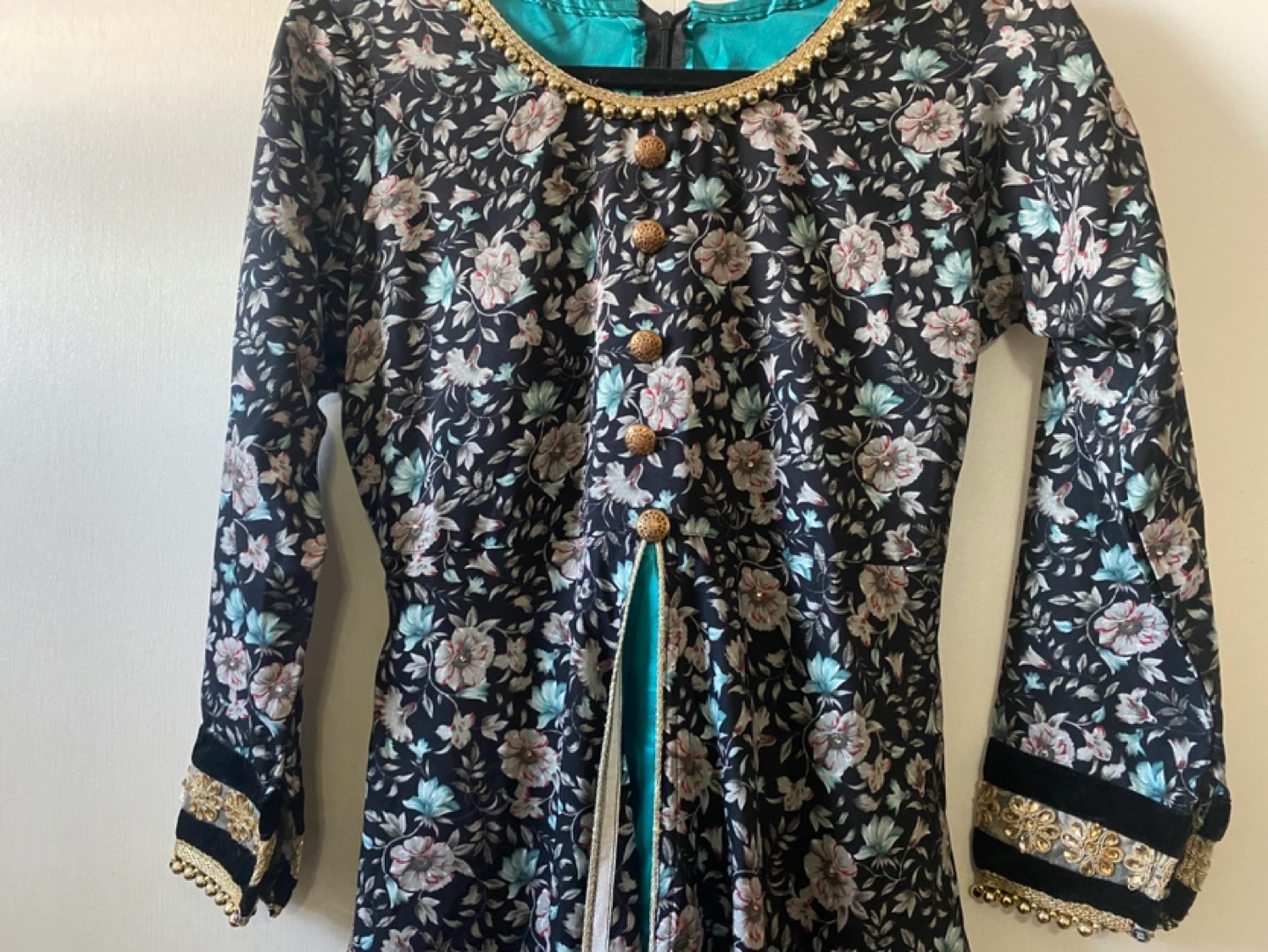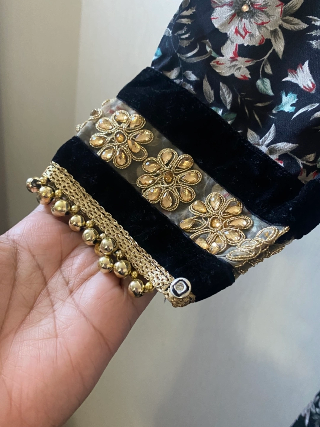 Long sleeve, black with floral print, blue satin lining. Has gold trim and buttons. Gold beads and velvet on the sleeves.
