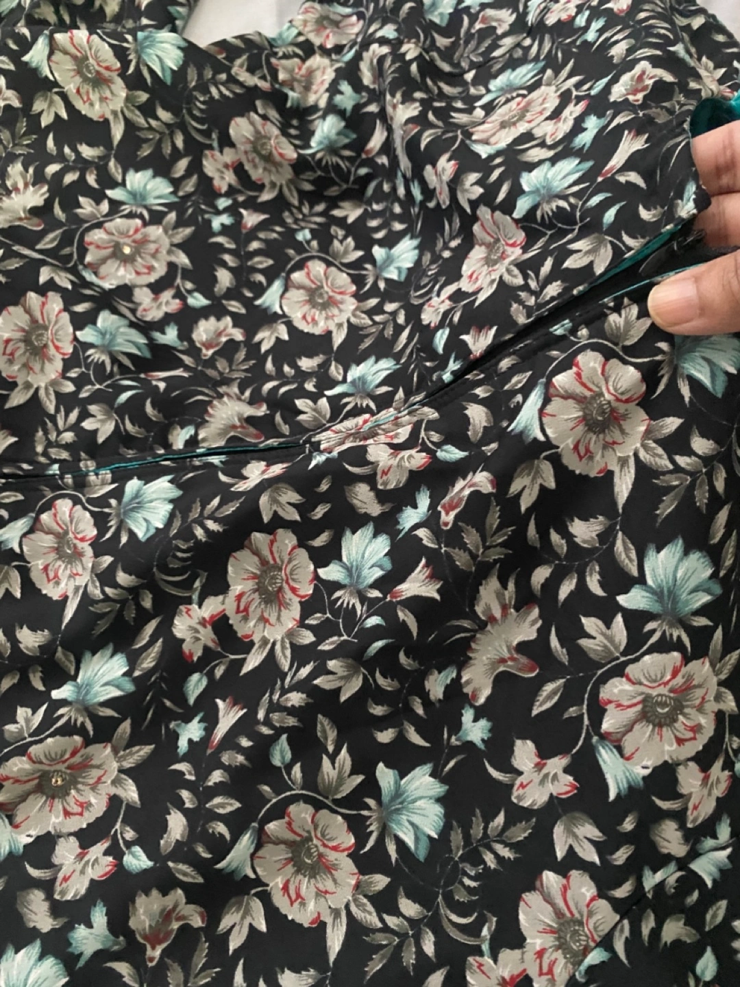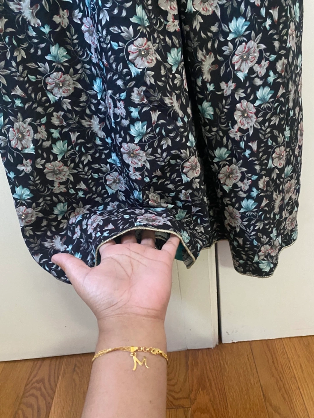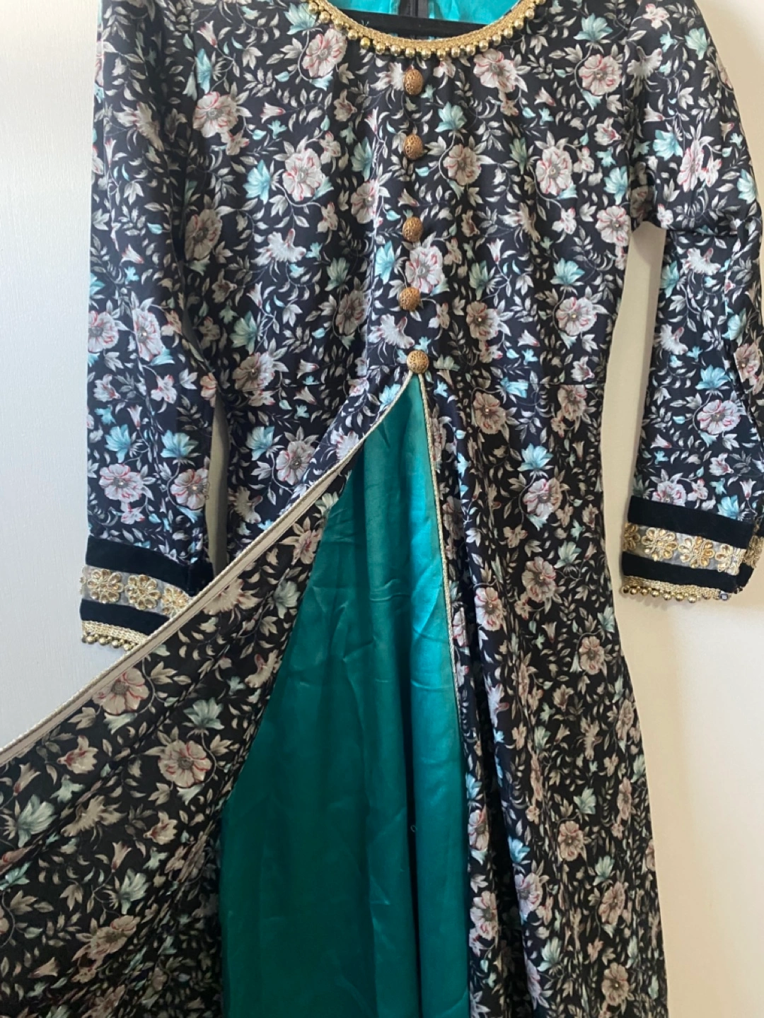 Long sleeve, black with floral print, blue satin lining. Has gold trim and buttons. Gold beads and velvet on the sleeves.