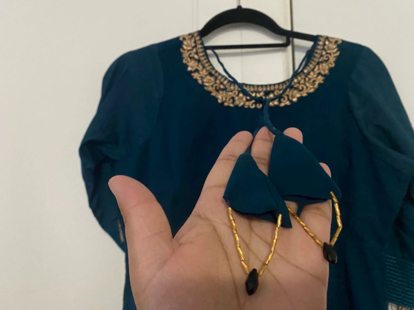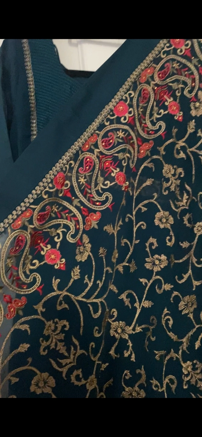 Teal Pakistani suit with gold embroidery. Comes with a matching dupatta with gold embroidery and a red floral design. The suit has a round neck and 3/4 sleeves. The dupatta has a delicate pattern. Perfect for special occasions.