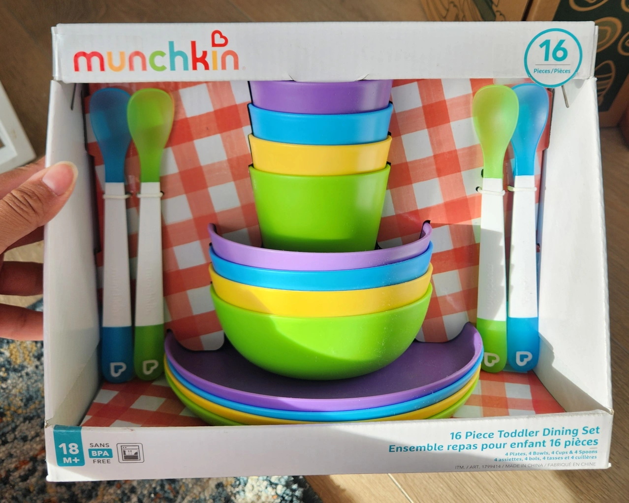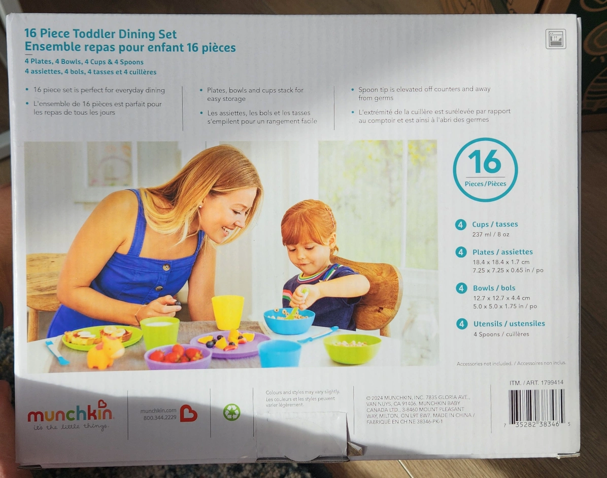 Brand new in box 16 Piece Toddler Dining Set. Includes 4 plates, 4 bowls, 4 cups and 4 spoons. Plates, bowls and cups stack for easy storage.