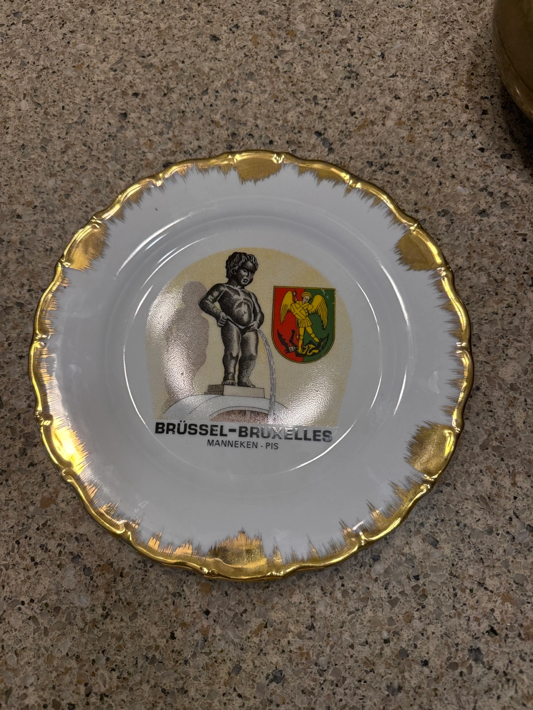 96Small souvenir plate with a gold rim, depicting the Manneken Pis statue in Brussels. Made in Belgium.