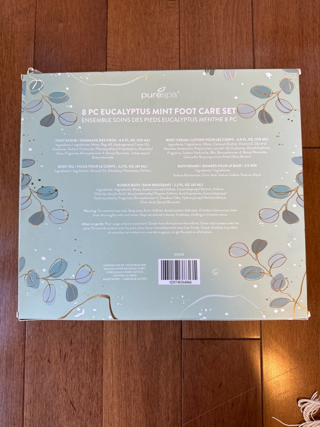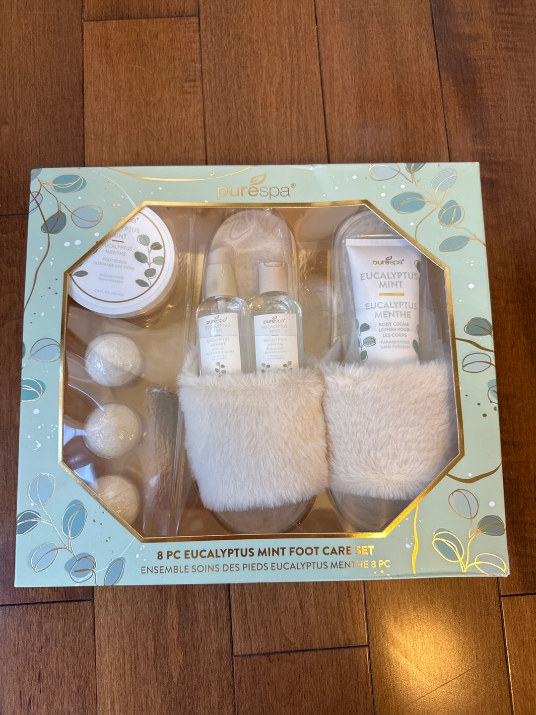 968 piece set. Includes foot scrub, body cream, lotion, bath salts, bubble bath, and slippers.