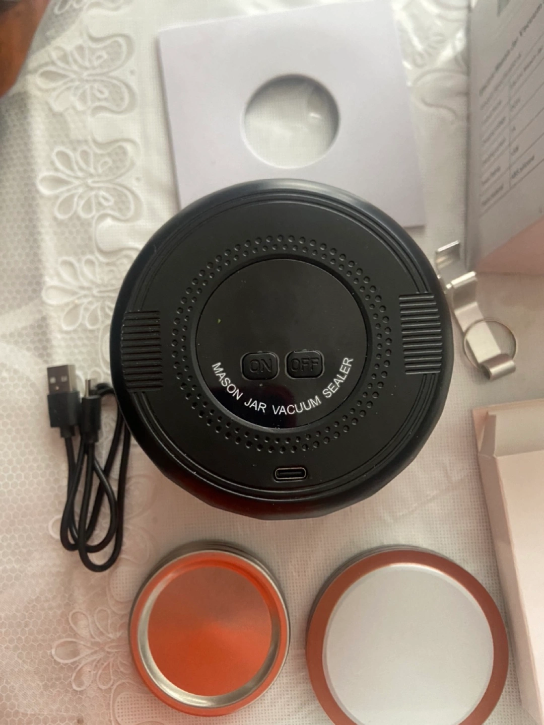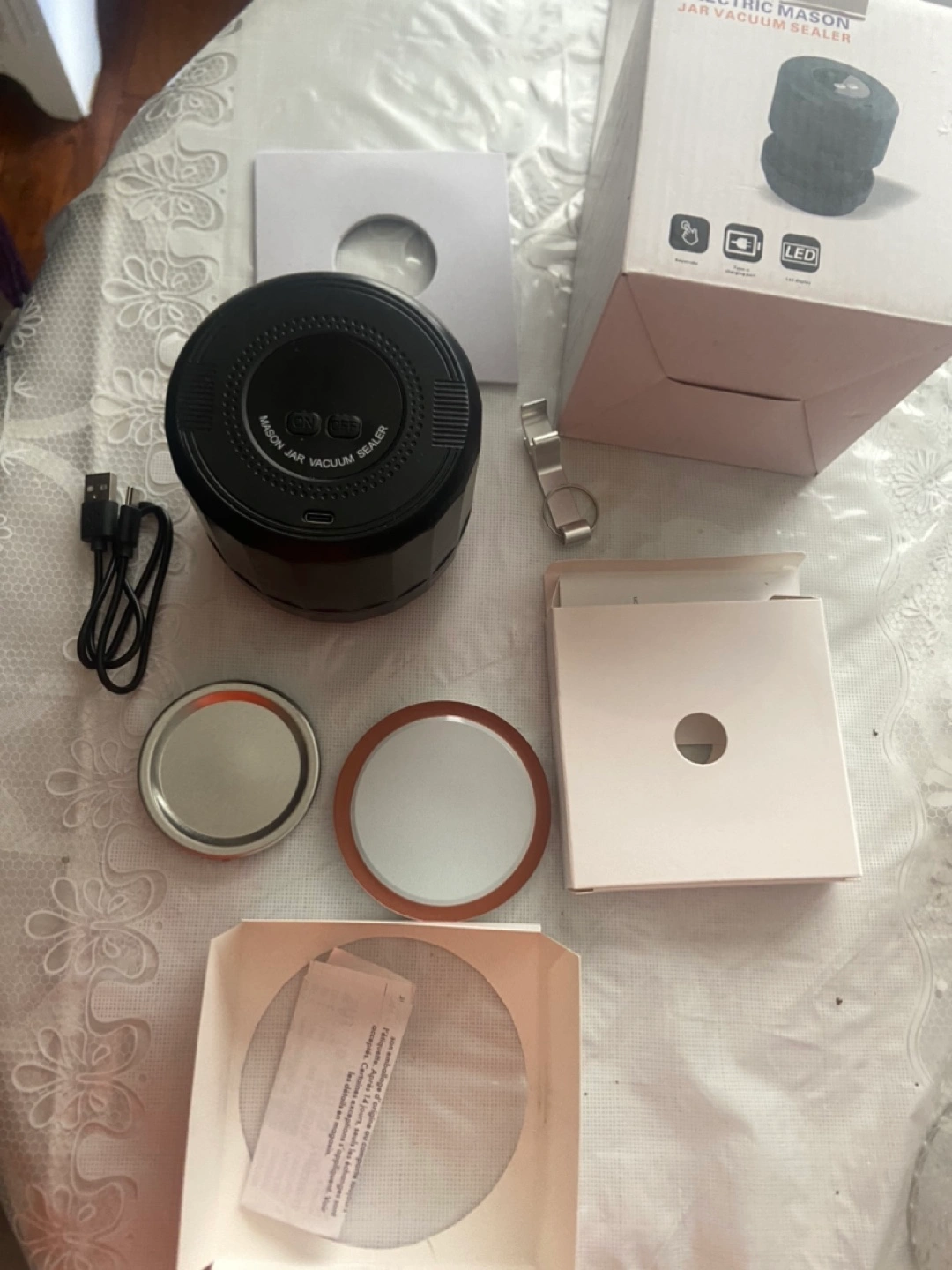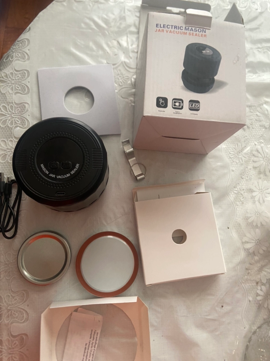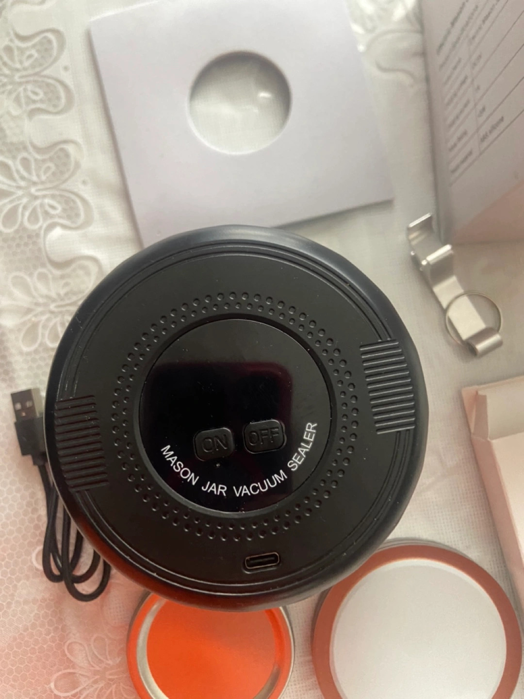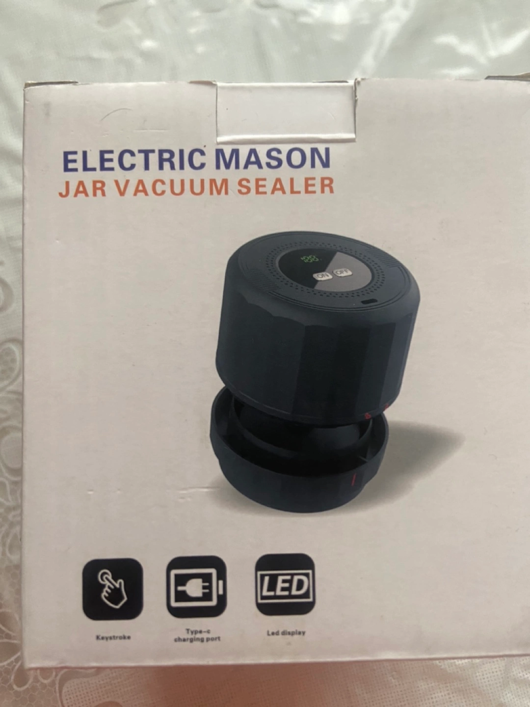 Electric Mason Jar Vacuum Sealer with LED display, charging port and keystroke function. Comes with charging cable and lids.