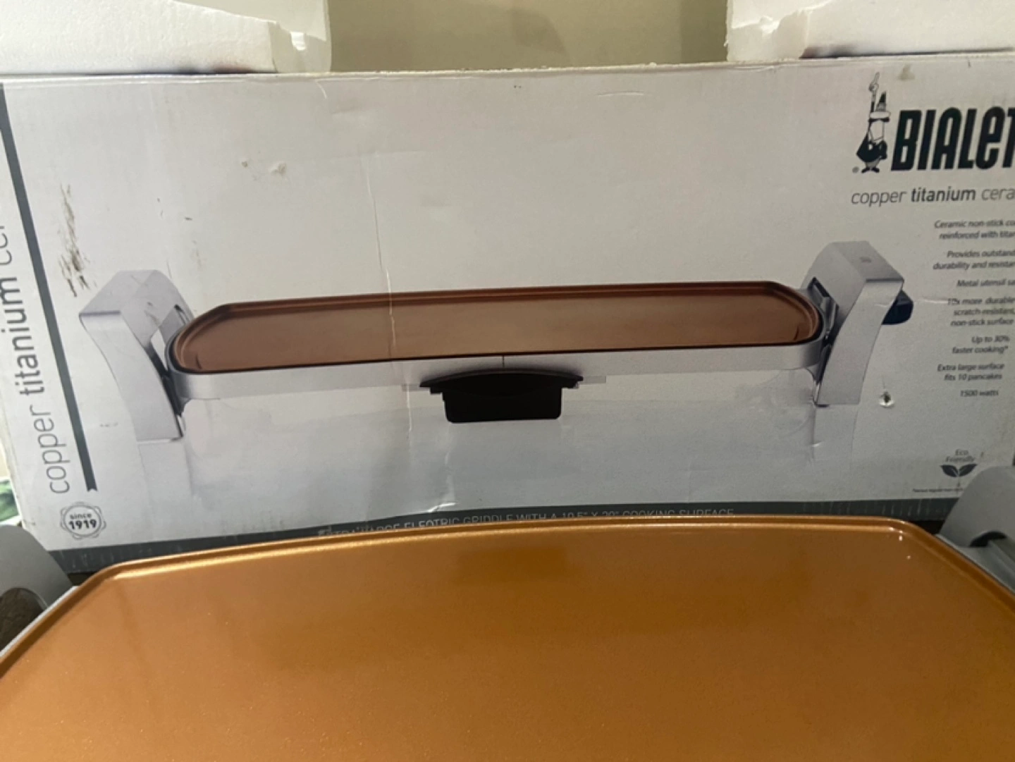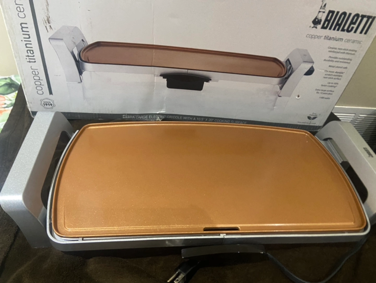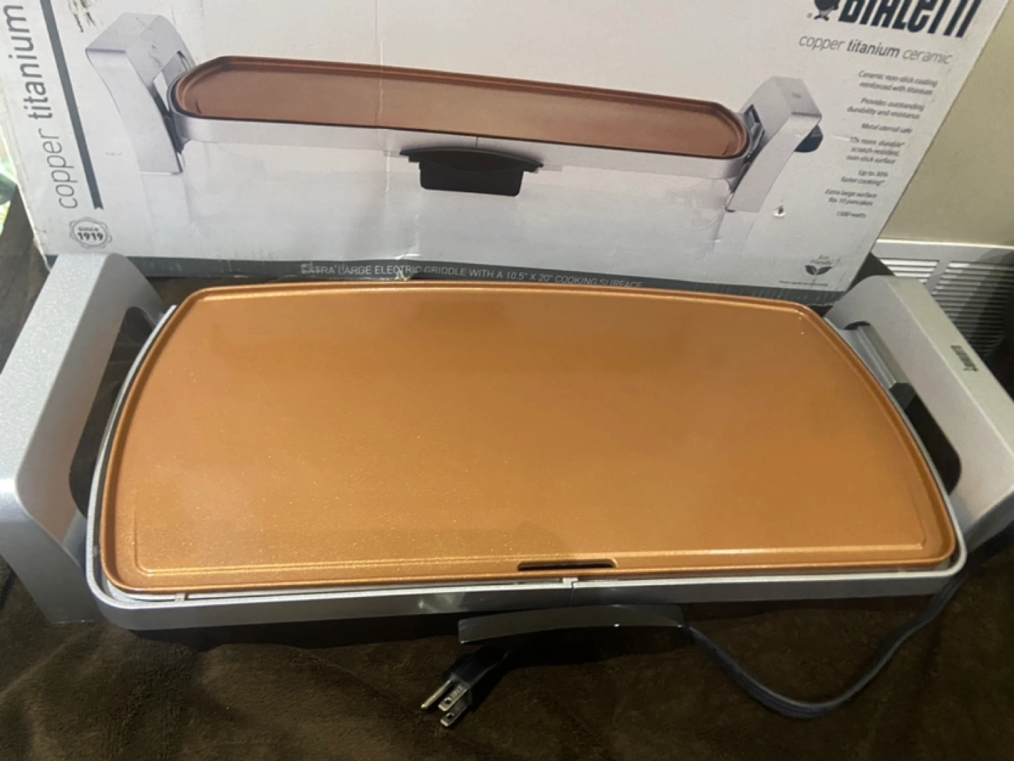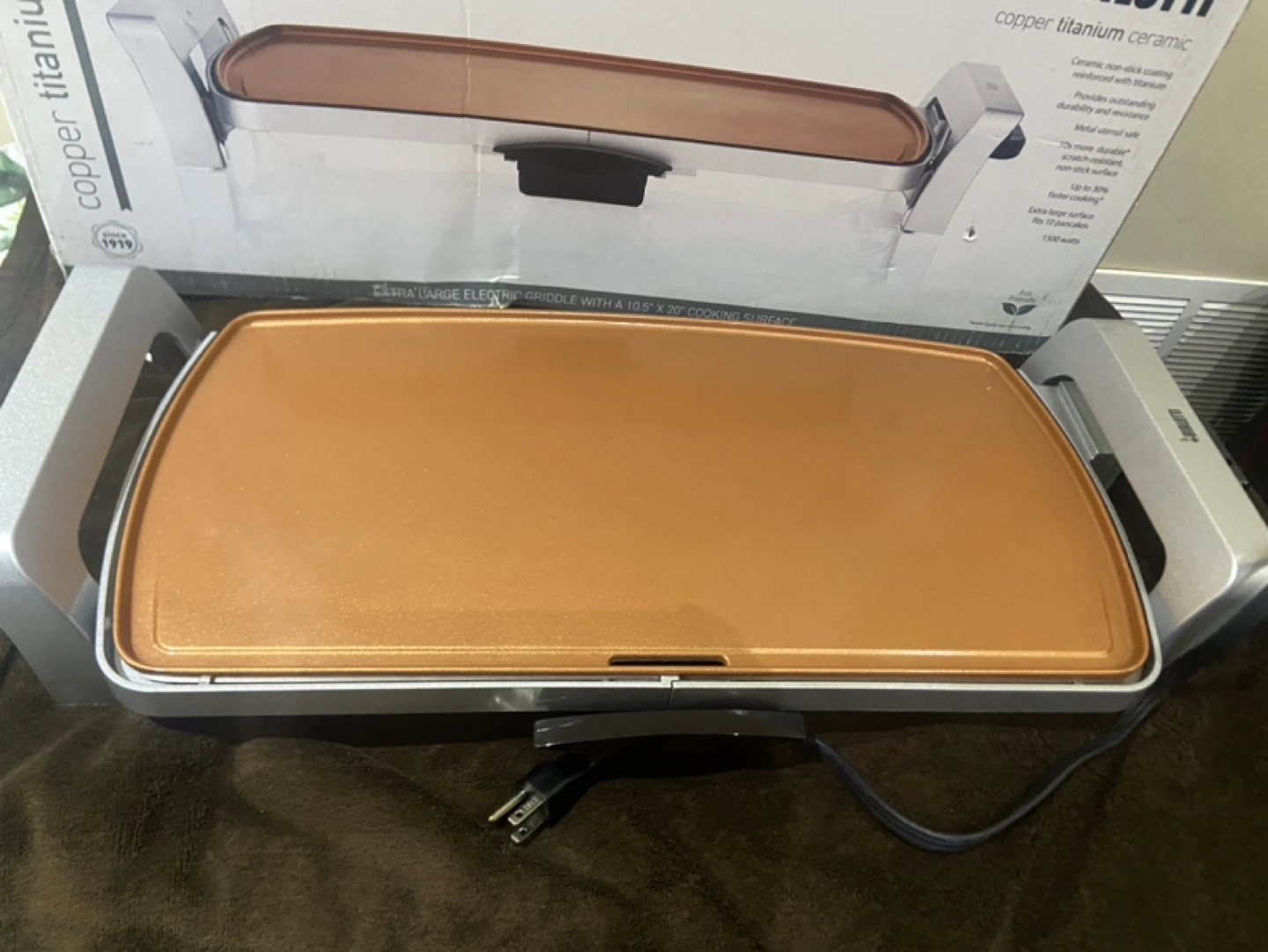 Copper titanium ceramic griddle. Large electric griddle with a 18.5 x 20” cooking surface.