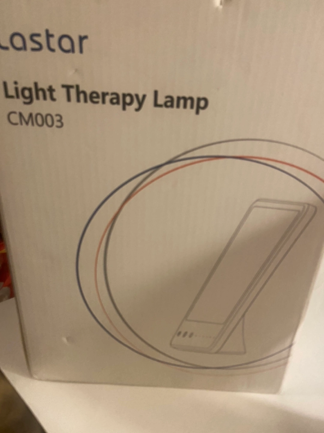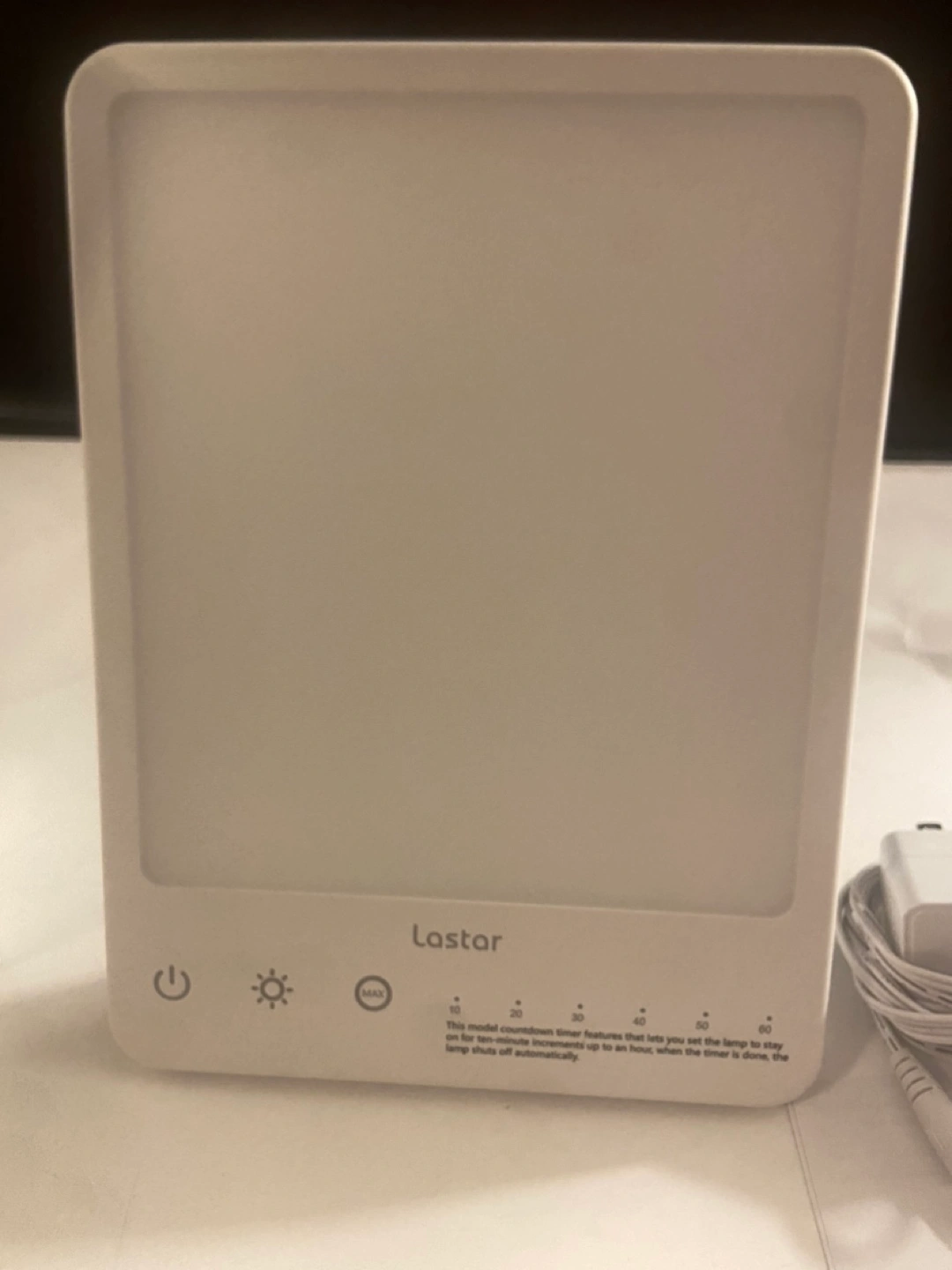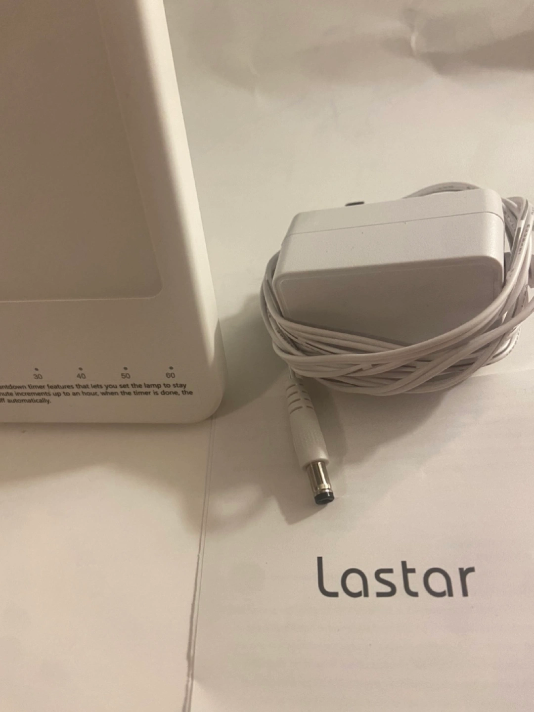 Light therapy lamp, white. Includes power adapter. Timer feature lets you set the lamp to stay on for ten-minute increments up to an hour.