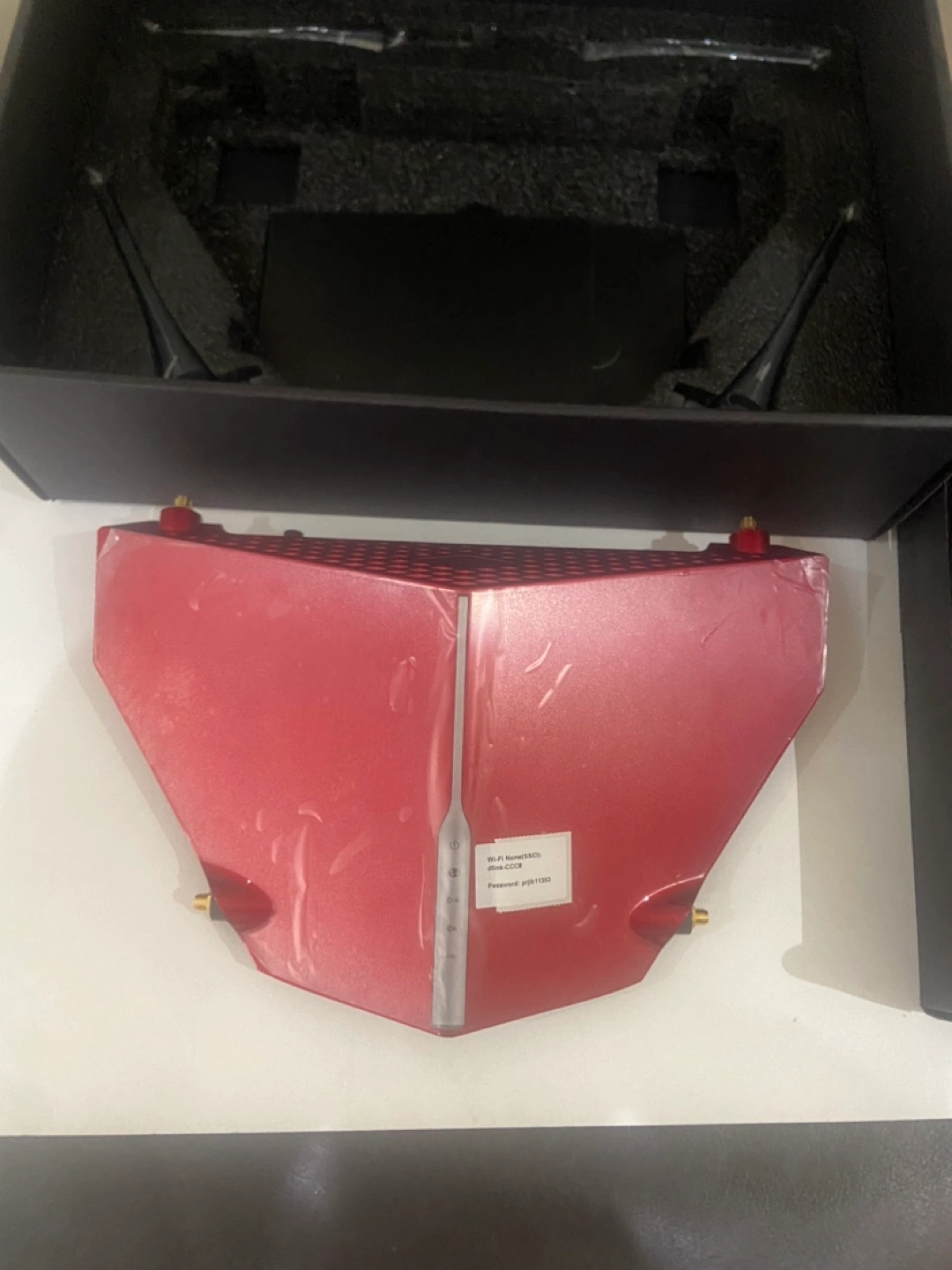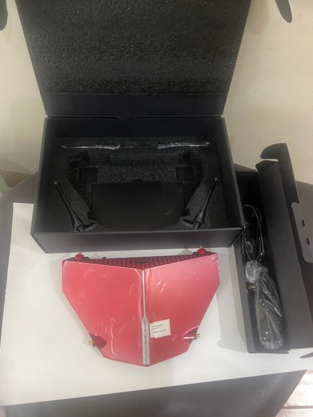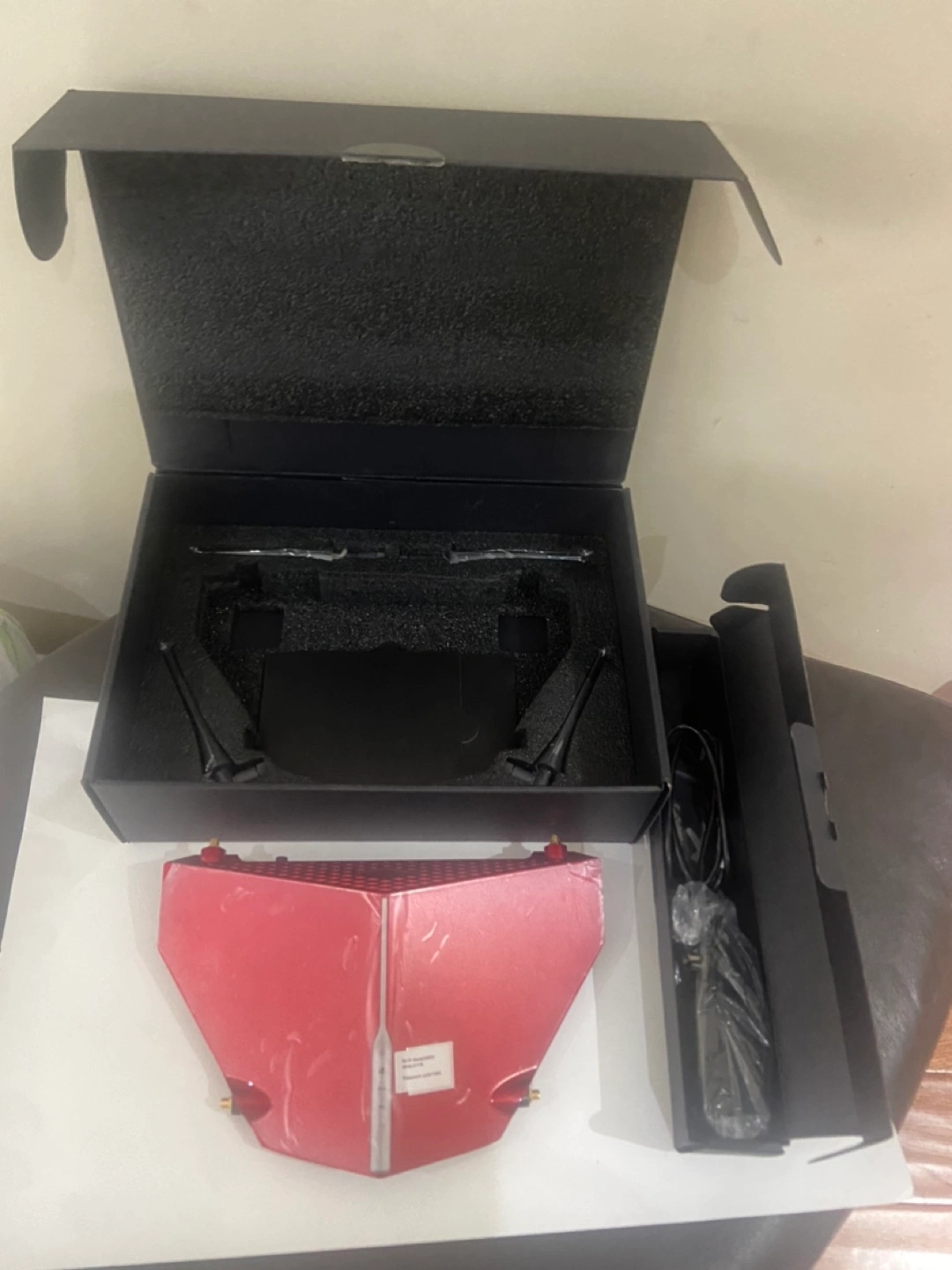 Includes box, power adapter, and router. Red in colour.
