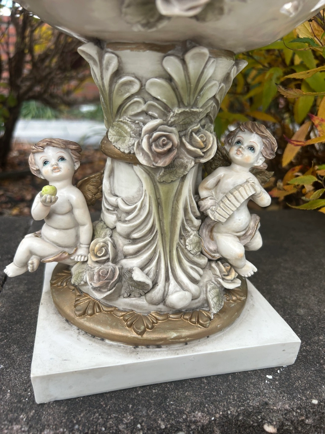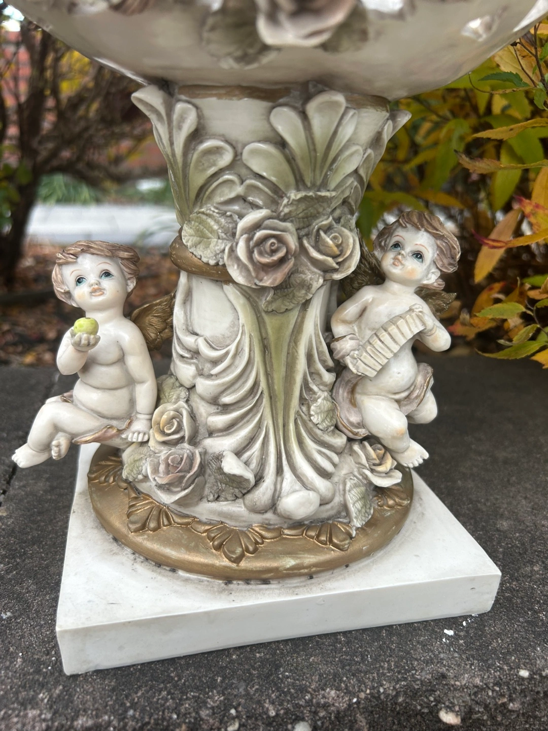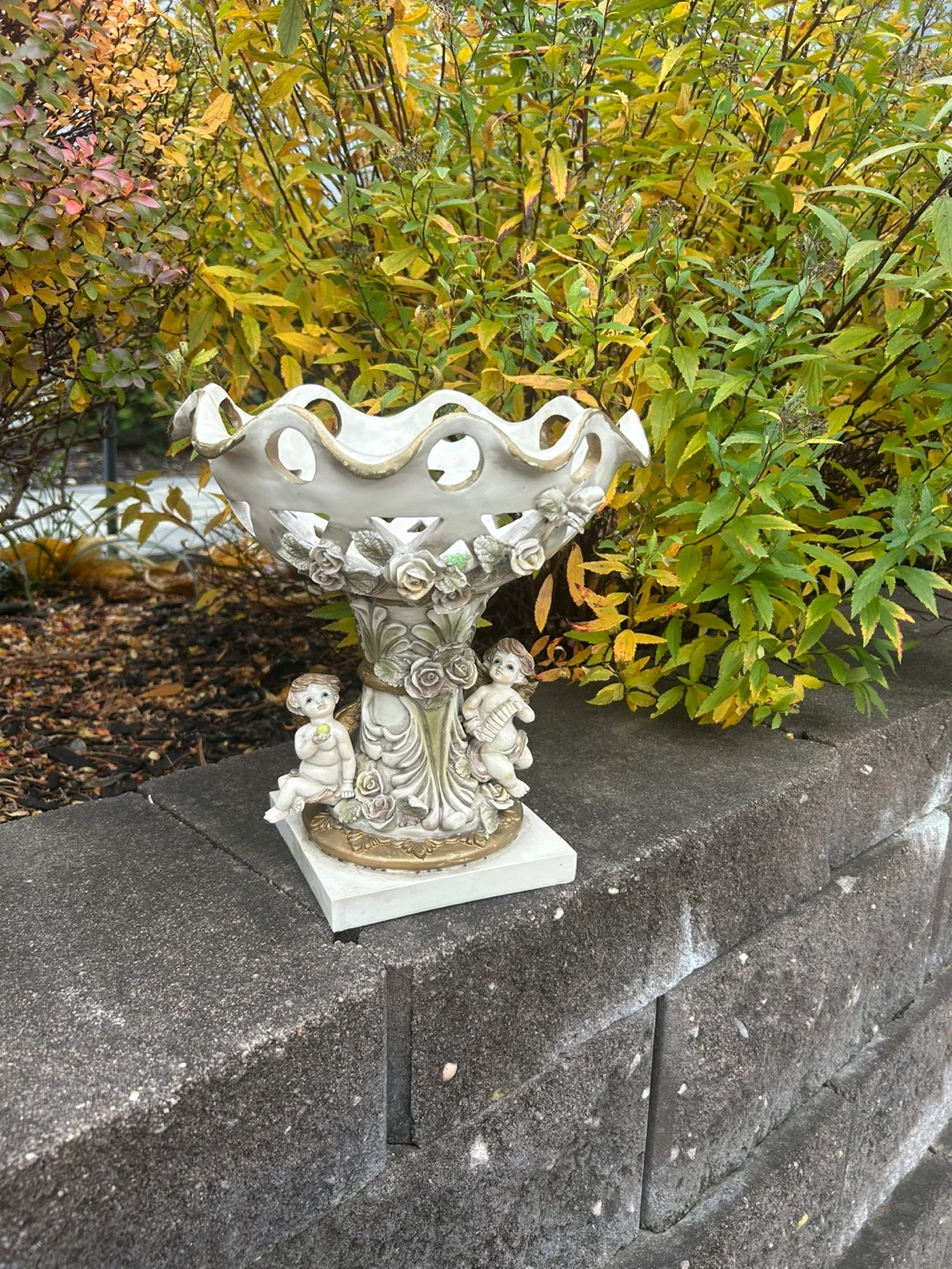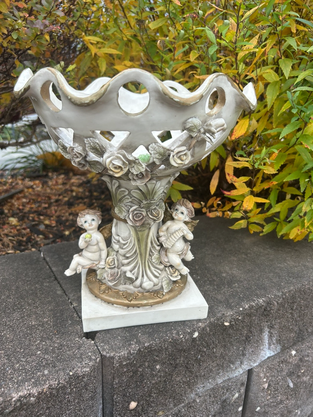 White porcelain centerpiece with two cherubs and a bowl with intricate details. The bowl has decorative cutouts and the base is decorated with roses and a gold trim.