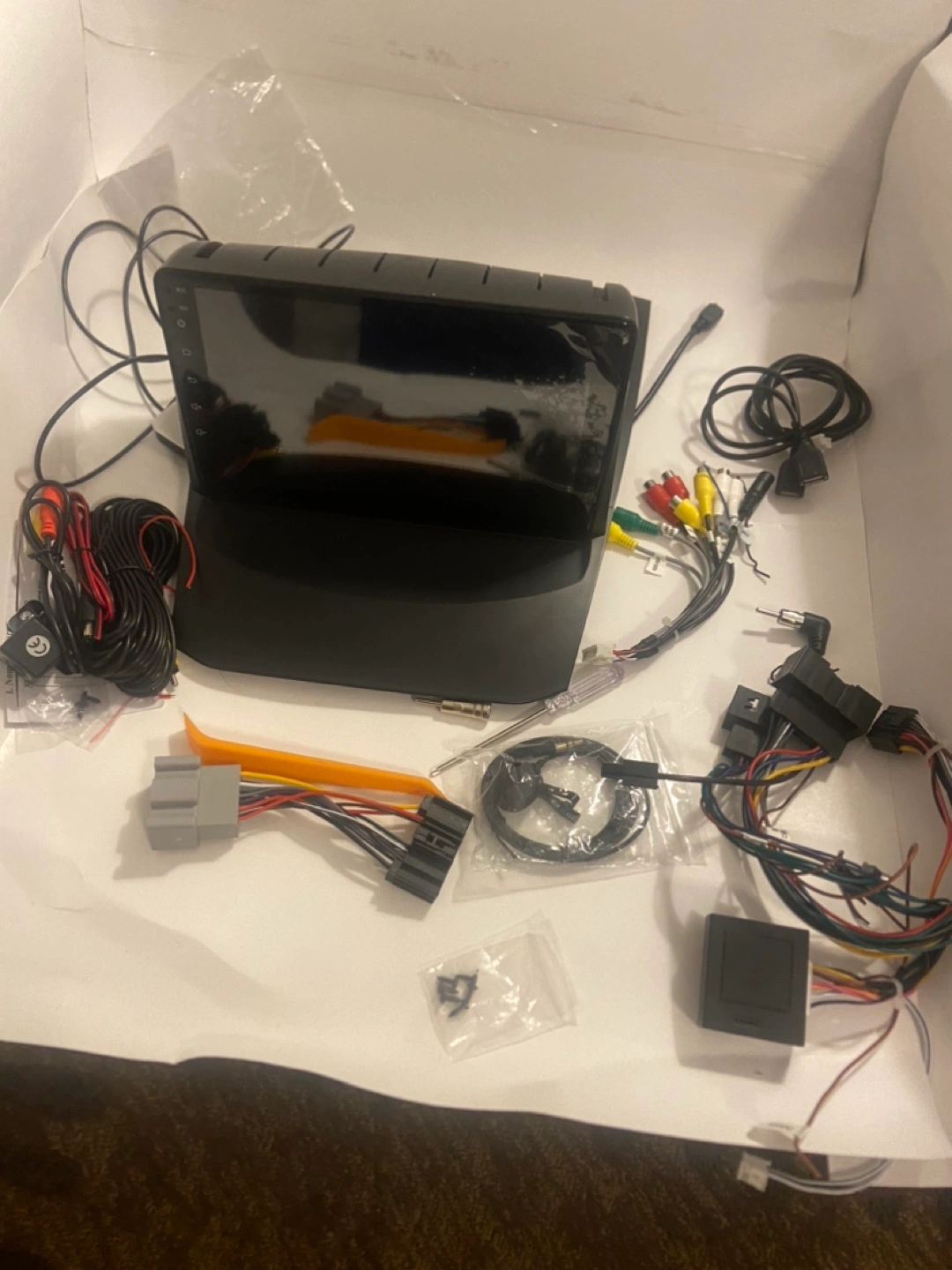 Car stereo with navigation, Bluetooth, and other features. Includes all wiring harnesses and accessories. Never installed. Includes instructions.
