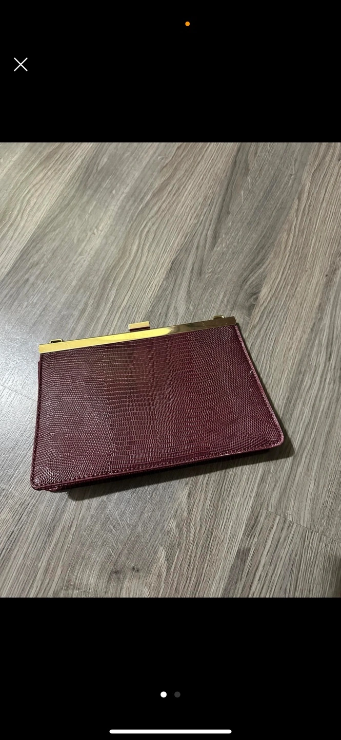 1000+Small burgundy clutch with a gold clasp. It has a textured, snakeskin-like finish.