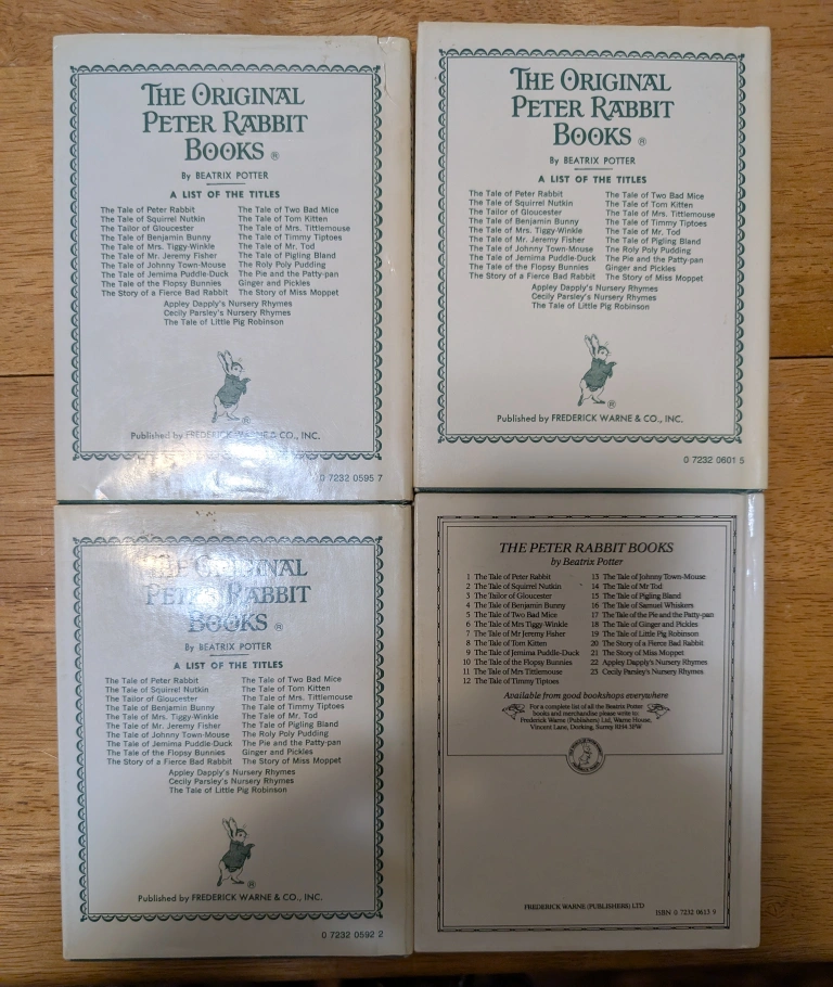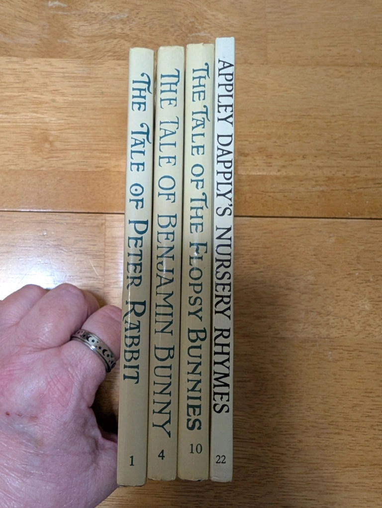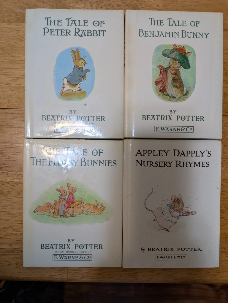 1764 little hardcover Beatrix Potter books. The Tale of Peter Rabbit, The Tale of Benjamin Bunny, The Tale of the Flopsy Bunnies, and Appley Dapply's Nursery Rhymes. All books are hardcover. 3 have paper jackets. In good condition. Purchased in the '80s when my boys were little. All 4/$5 NOW FOR FREE