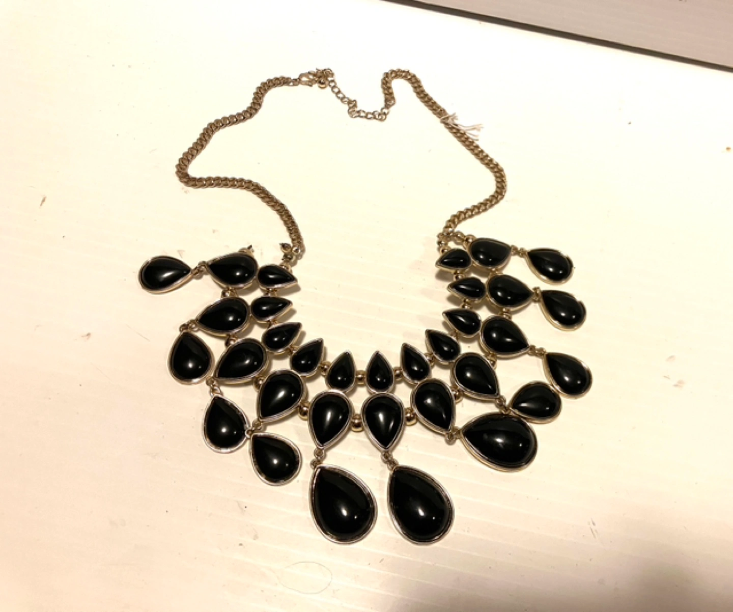 Gorgeous black plastic and gold tone metal 3 rows of teardrop shaped beads cascade vintage choker necklace. Lovely vintage gift for a woman