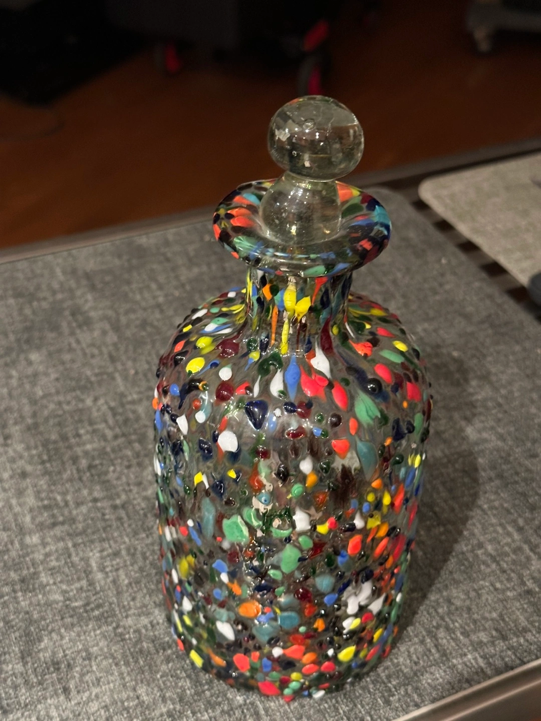 Glass bottle with colourful speckled design and a glass stopper. Made in Mexico. ๐ฒ๐ฝ beautiful artisan glassware . Have a few available.