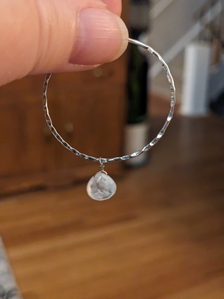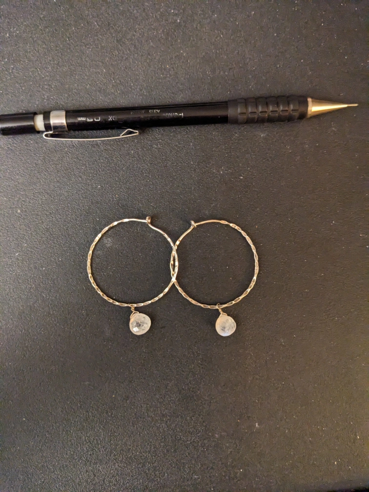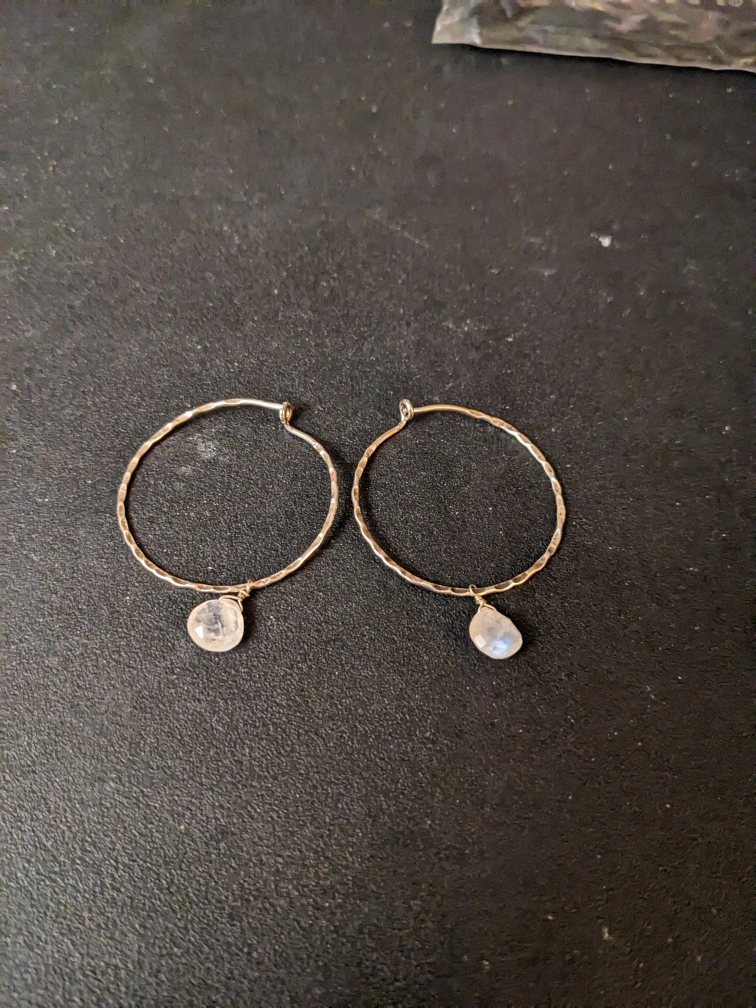 Silver hoops with small moonstone dangles. The hoops are hammered.