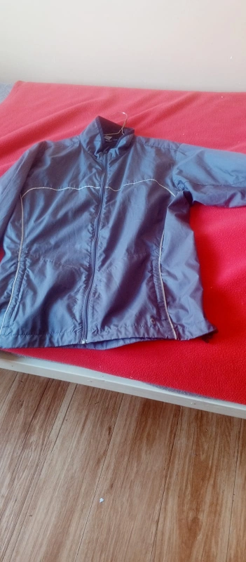 Grey running jacket with a zipper. Light and windproof. coffee mug and a jacket giving out for free