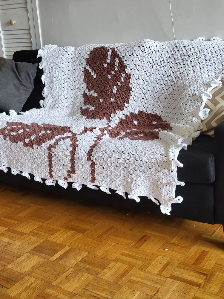 Hand-crocheted throw blanket with a large leaf design. White with brown accents. Excellent condition. Made with cotton yarn, crocheted technique used is corner to corner crochet which means I crocheted it on a diagonal instead of horizontal. It is heavy so it feels like a hug when you snuggle with it.