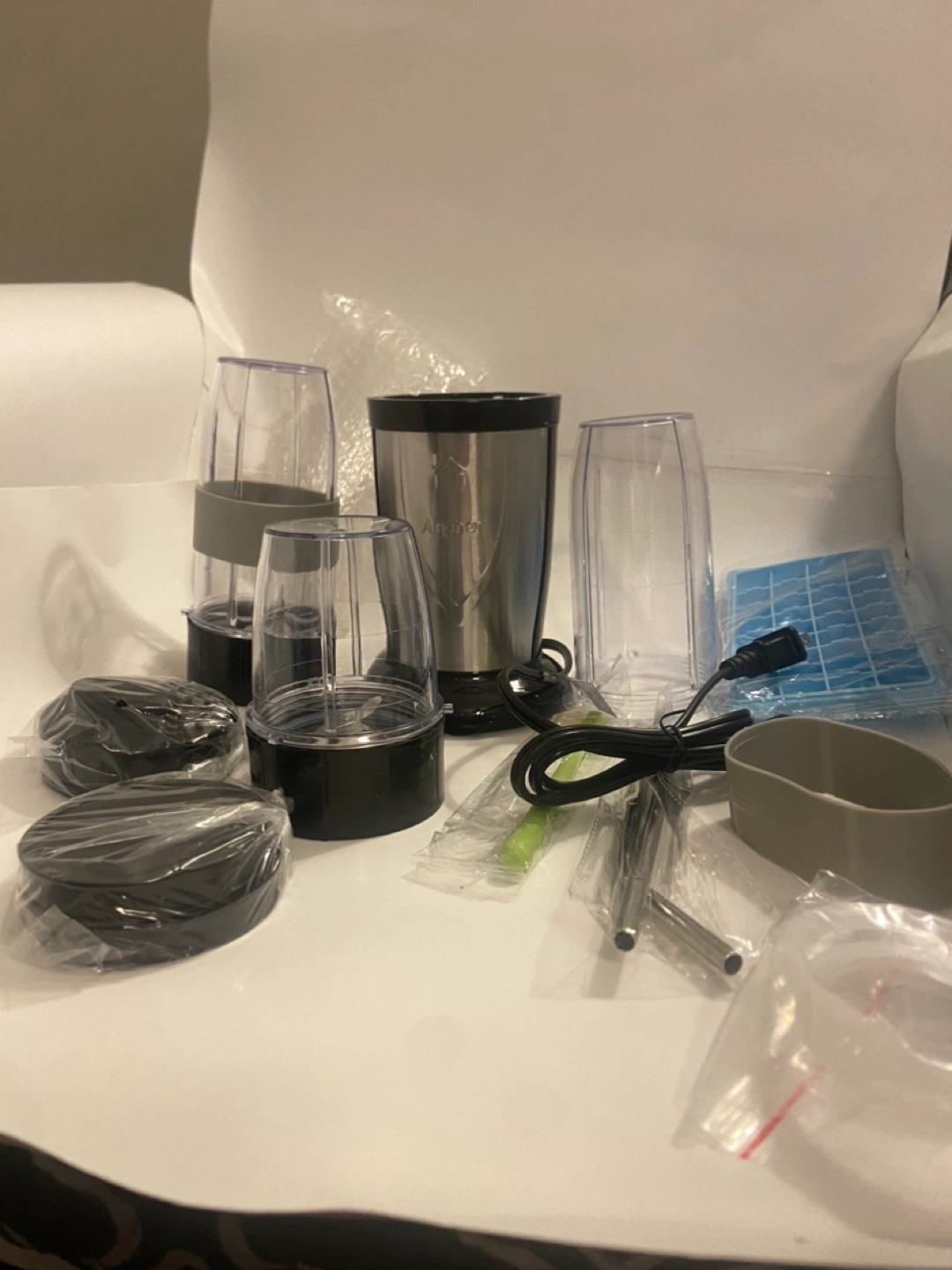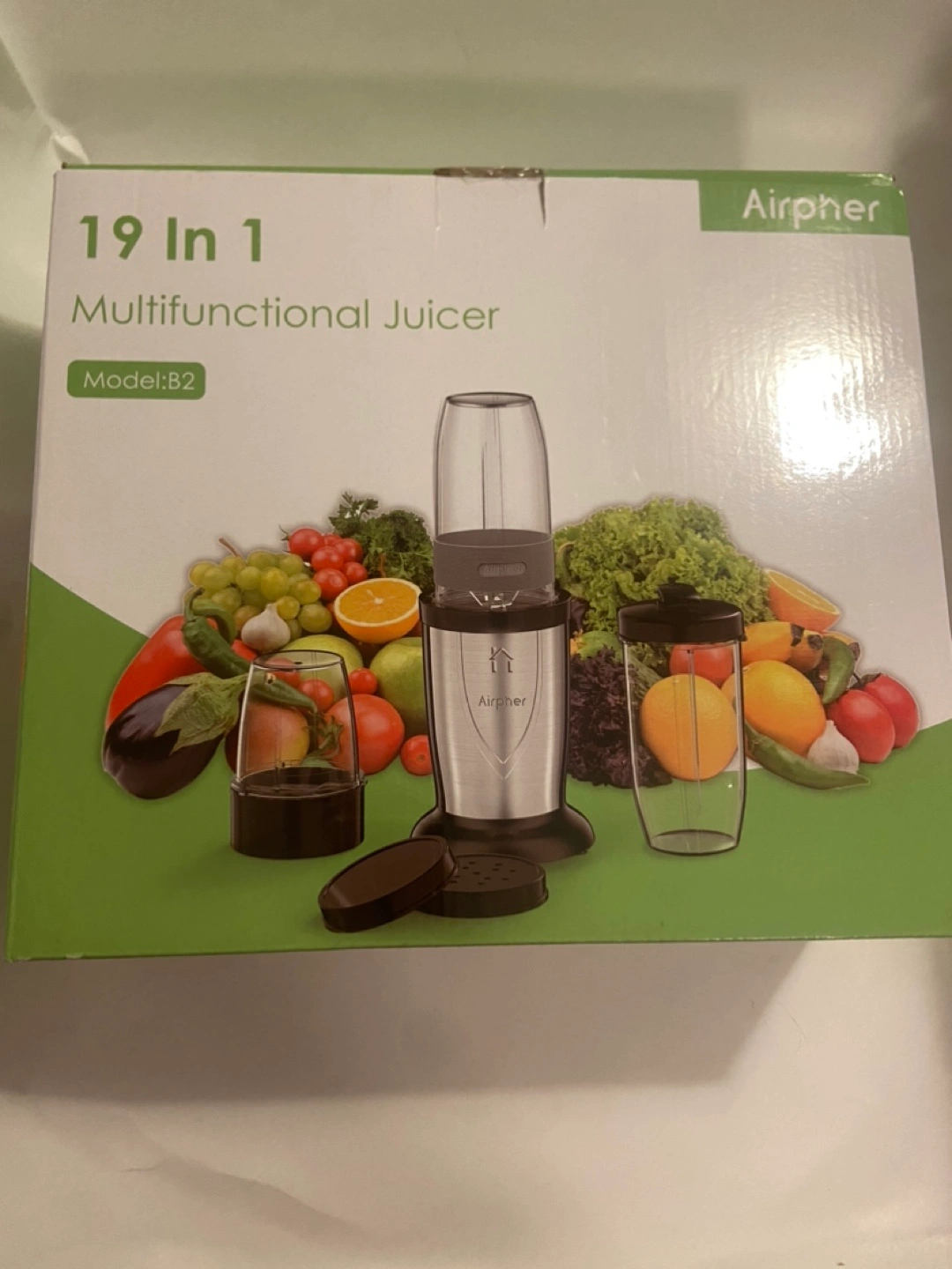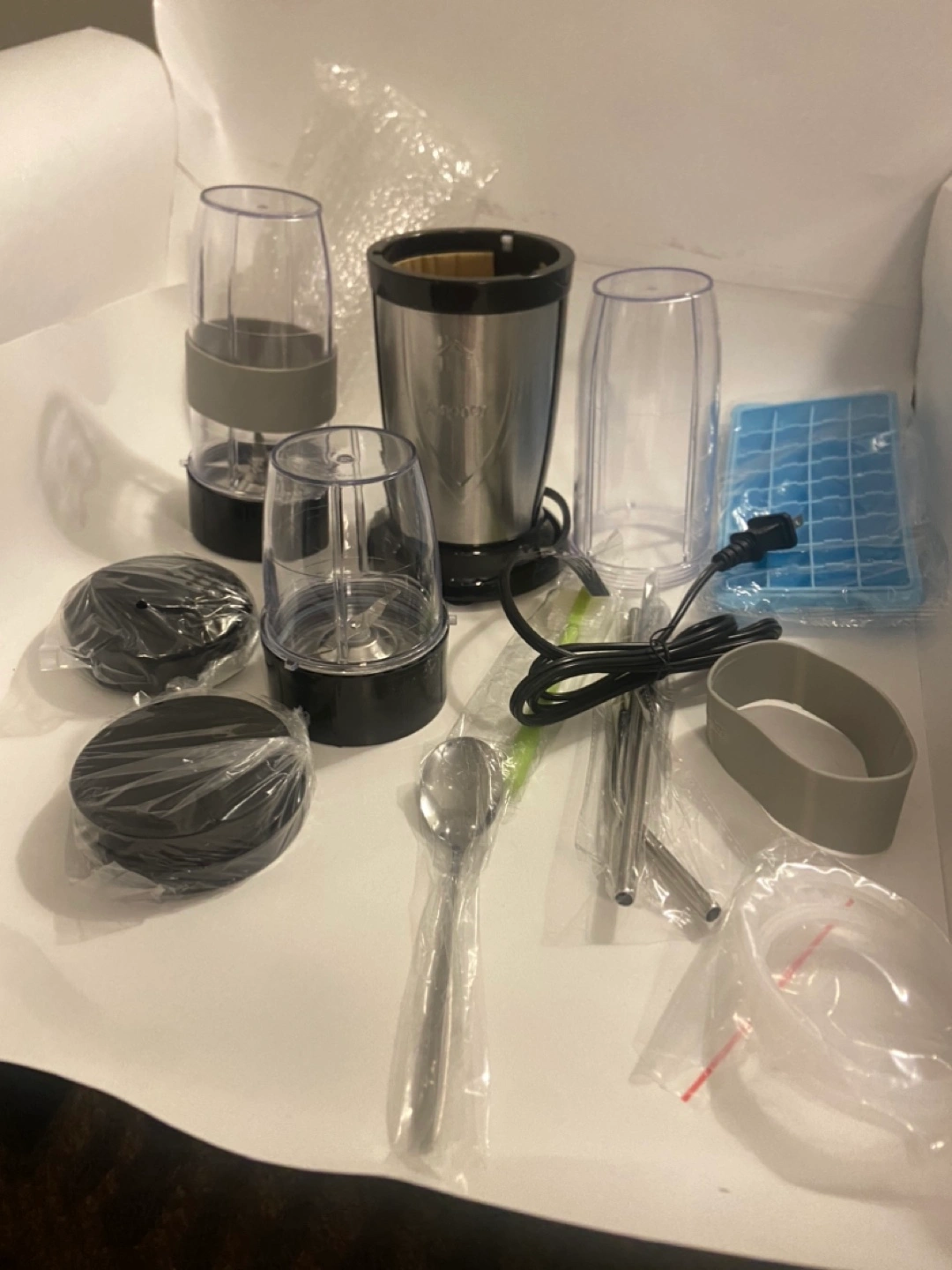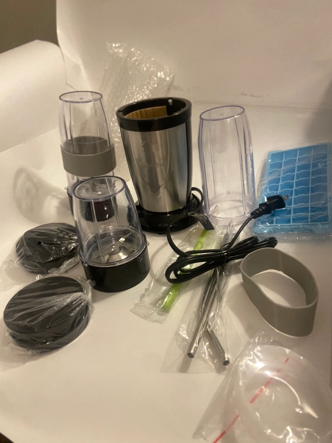 19 in 1 Multifunctional Juicer. Includes two cups, two lids, two straws, a spoon, a cord, a base unit, a ice cube tray, and a grey rubber band.