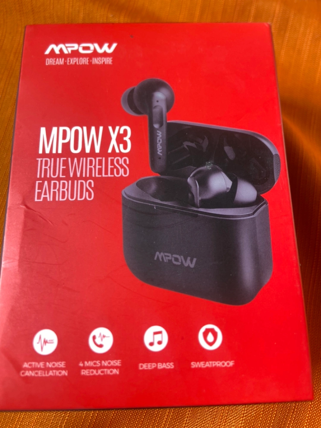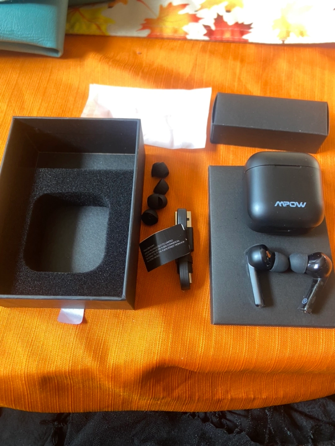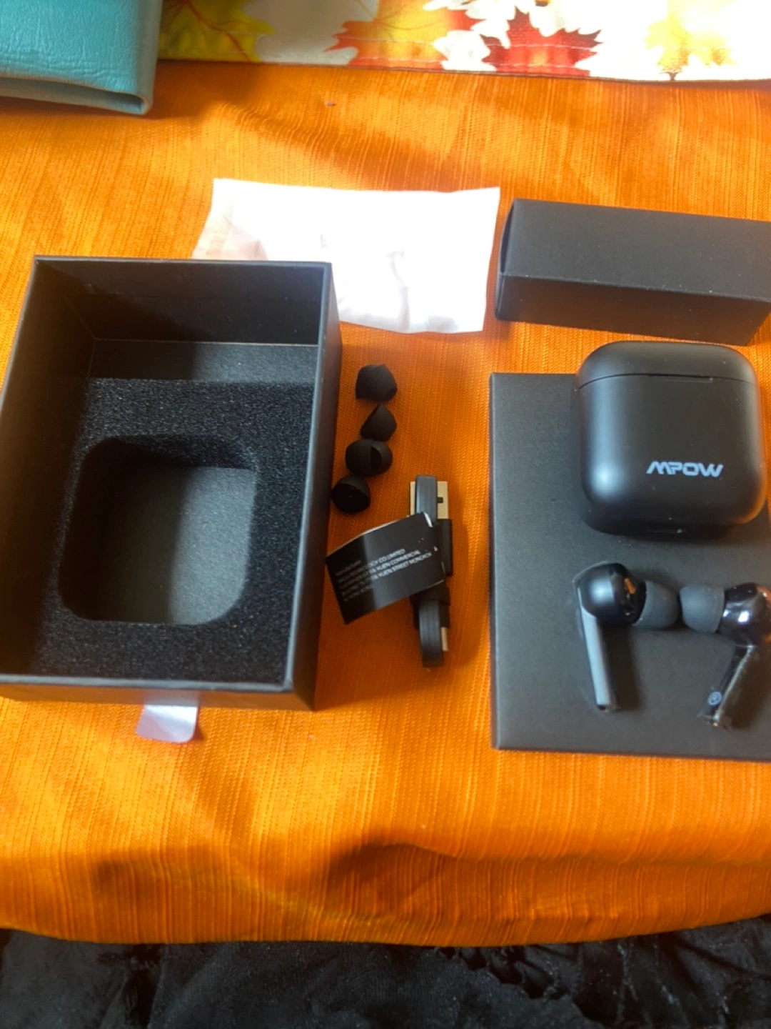 Wireless earbuds with active noise cancellation. Includes charging case, USB-C charging cable, and extra ear tips.