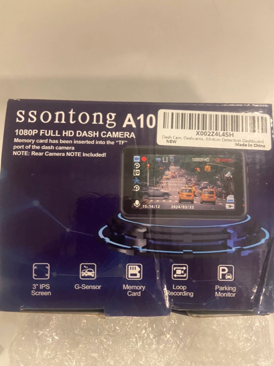Dash camera with 3 inch screen, G-sensor, memory card slot, loop recording, parking monitor. Includes rear camera. New.