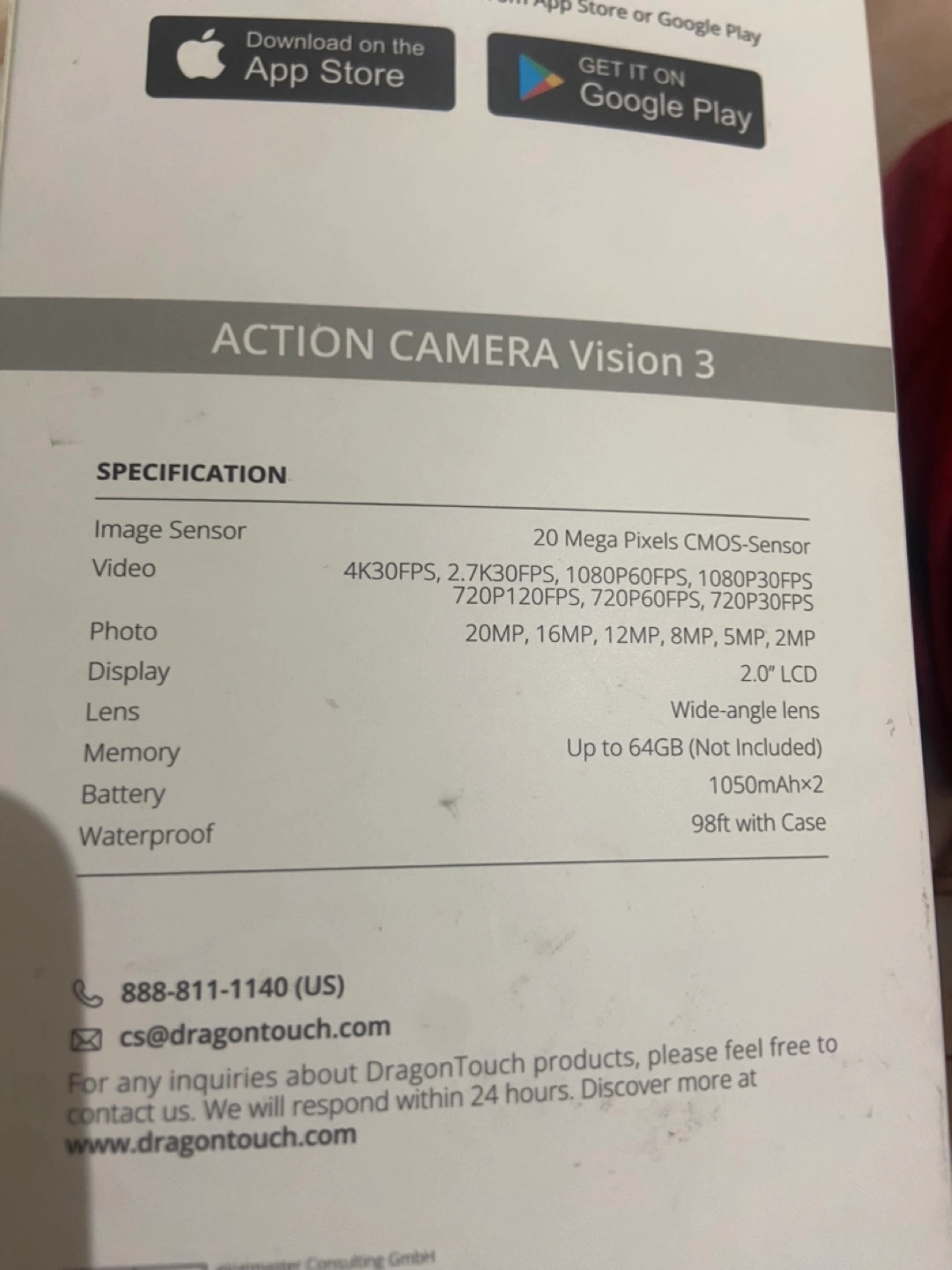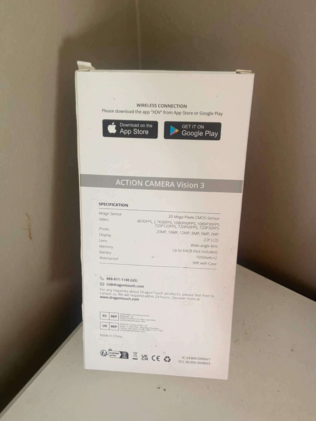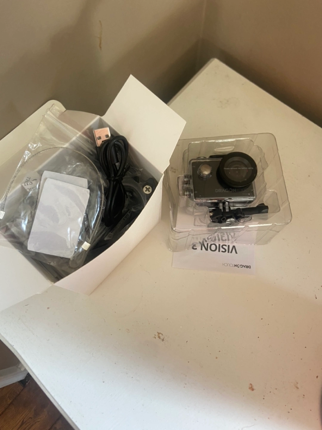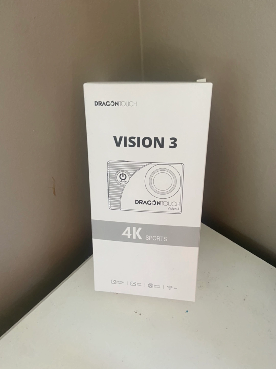 Action camera, includes case and accessories. 4K video, 20 MP photo, waterproof.
