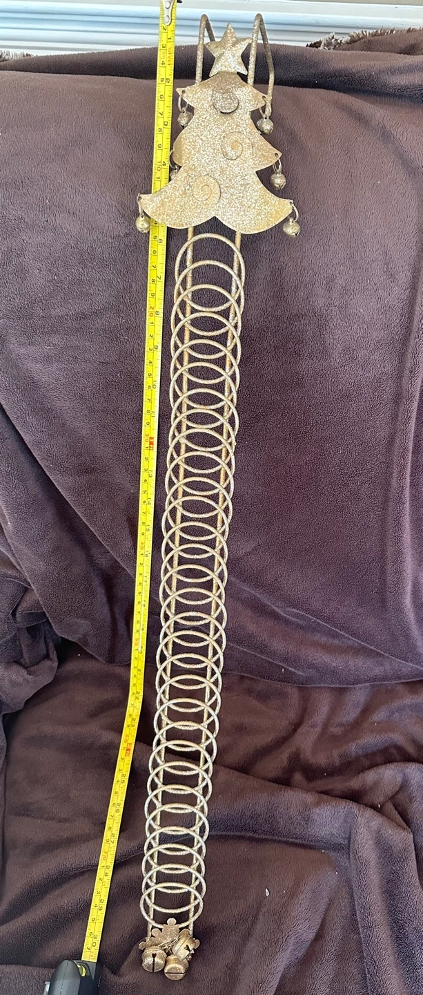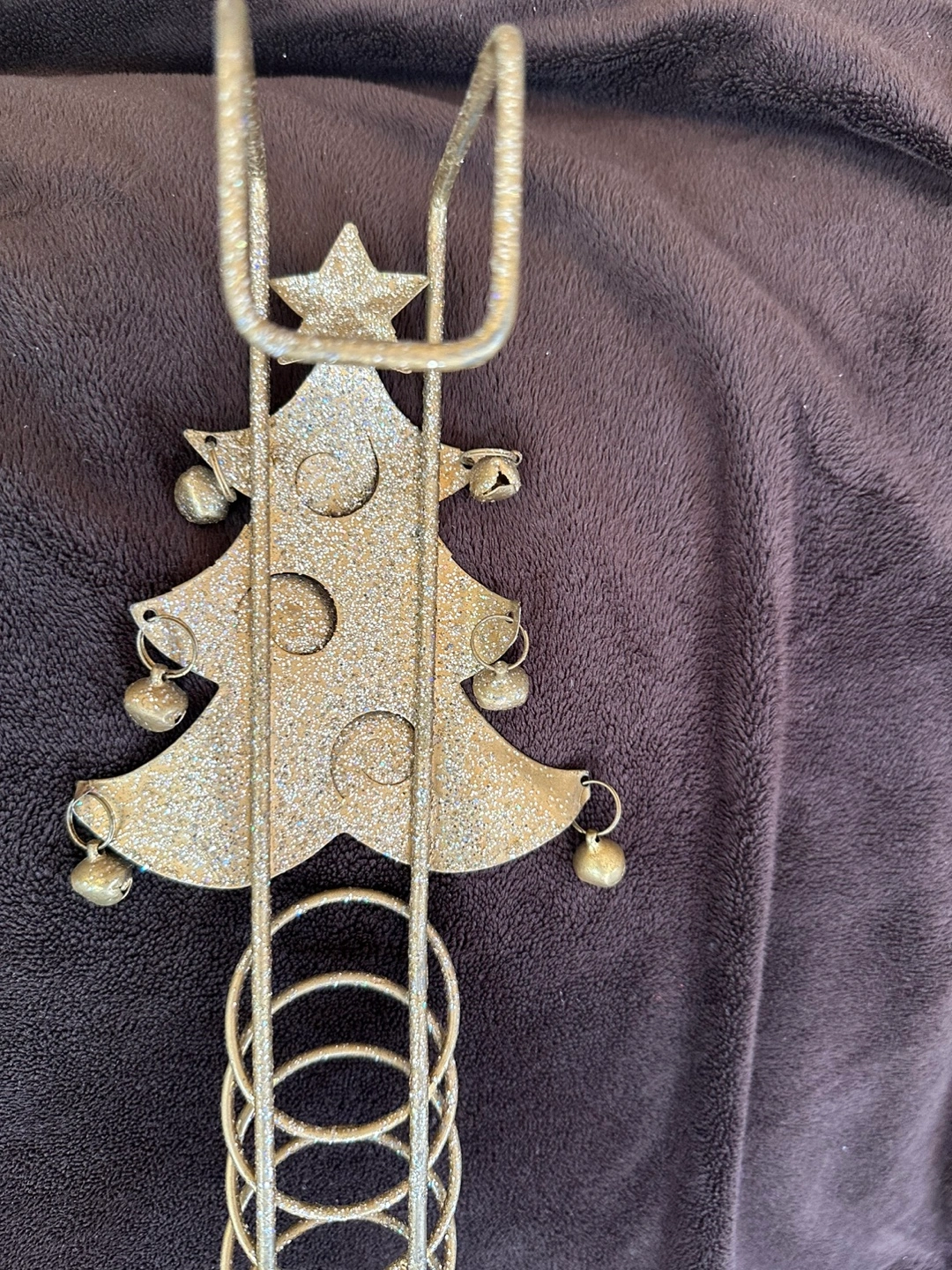 Metal golden ornament holder shaped like a Christmas tree. Holds approximately 24 ornaments. Has jingle bells on the tree.