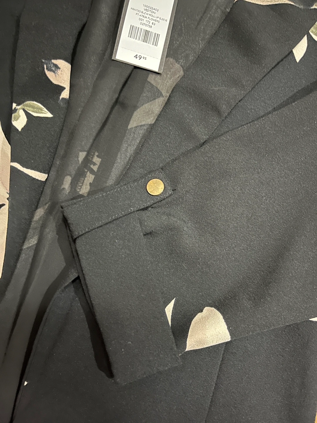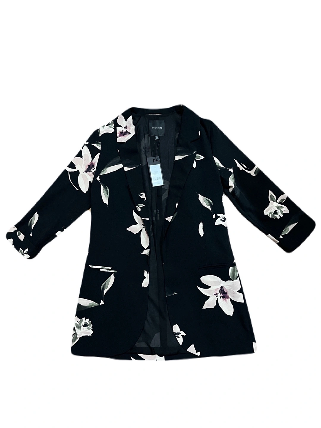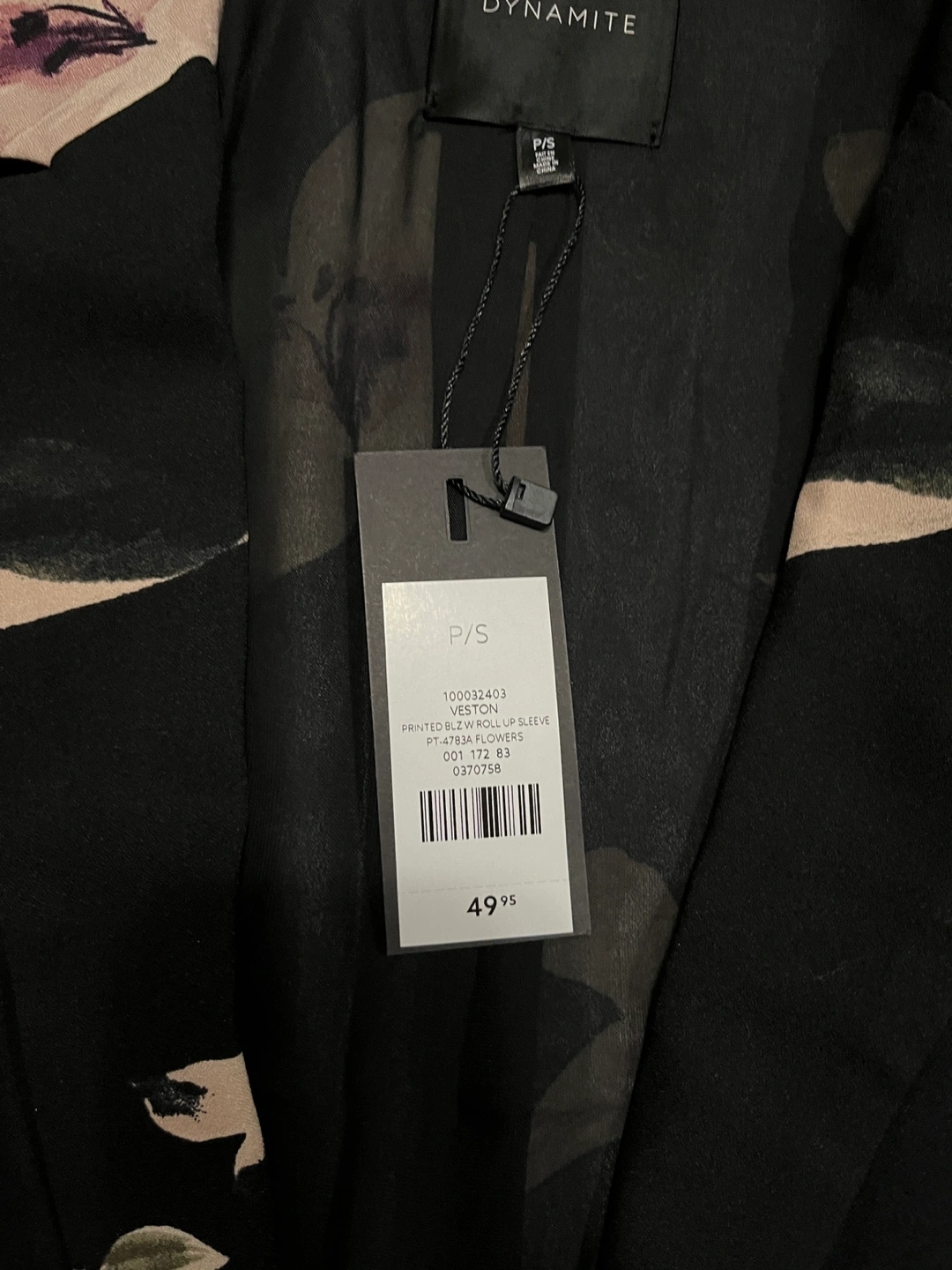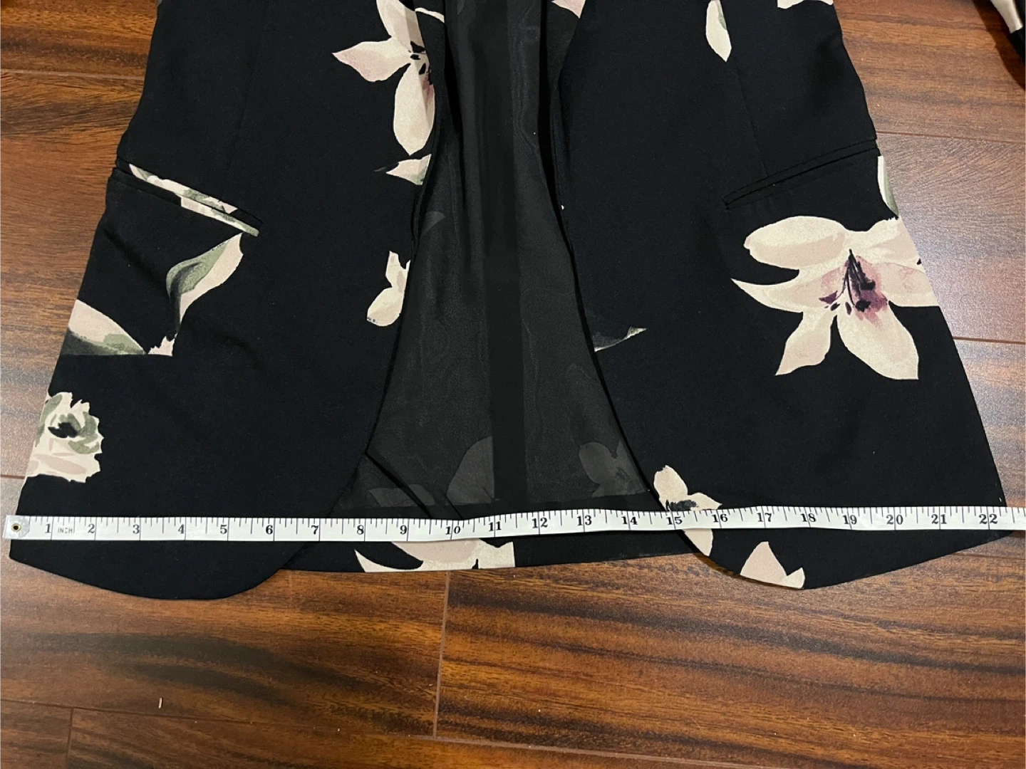 Brand new with tags. Women’s small Dynamite floral open blazer. Black with pale pink, cream and taupe florals. 3/4 sleeves with burnished gold buttons. Soft stretch fabric with a lightweight lining. Great for work or everyday wear.
