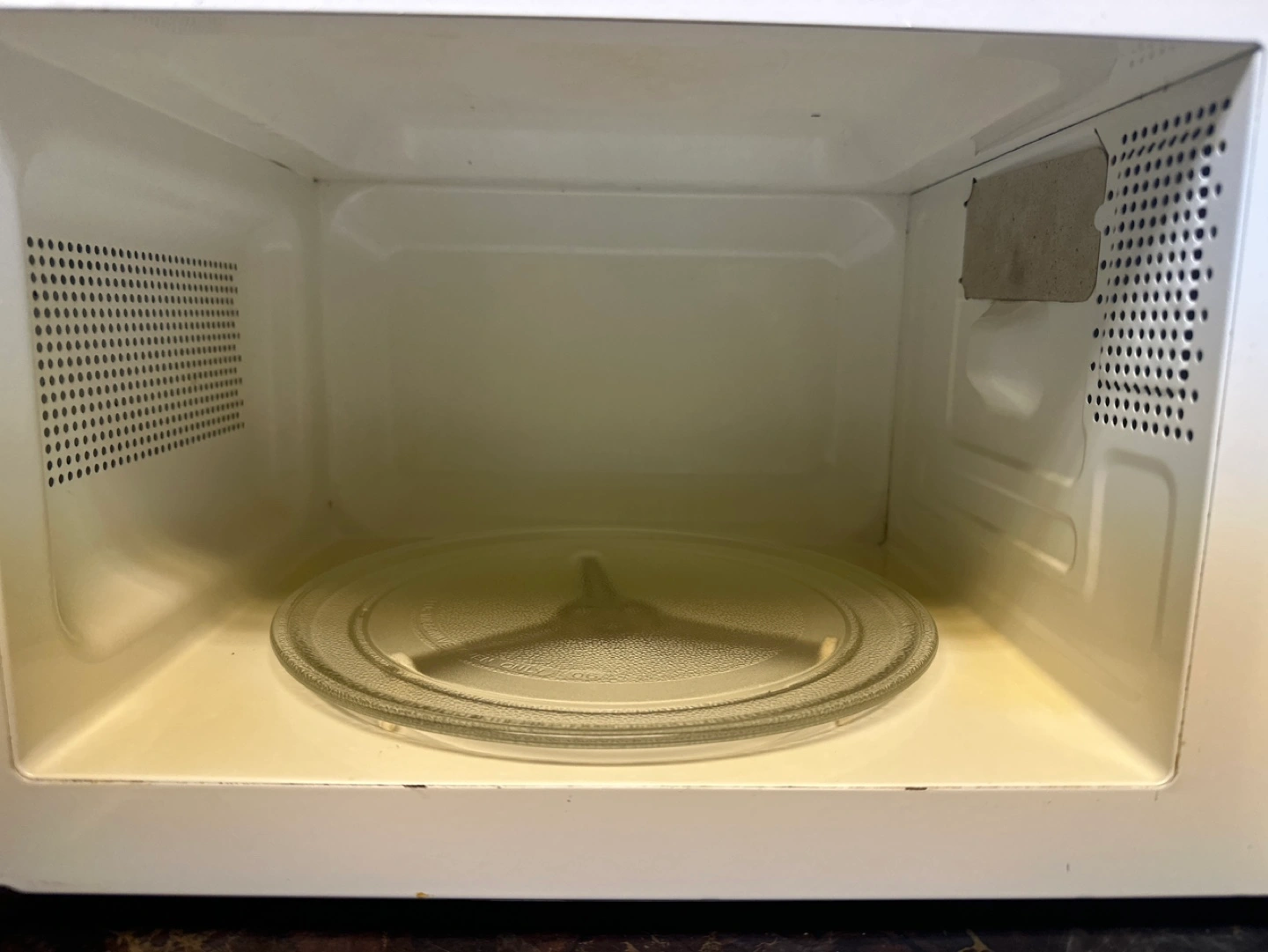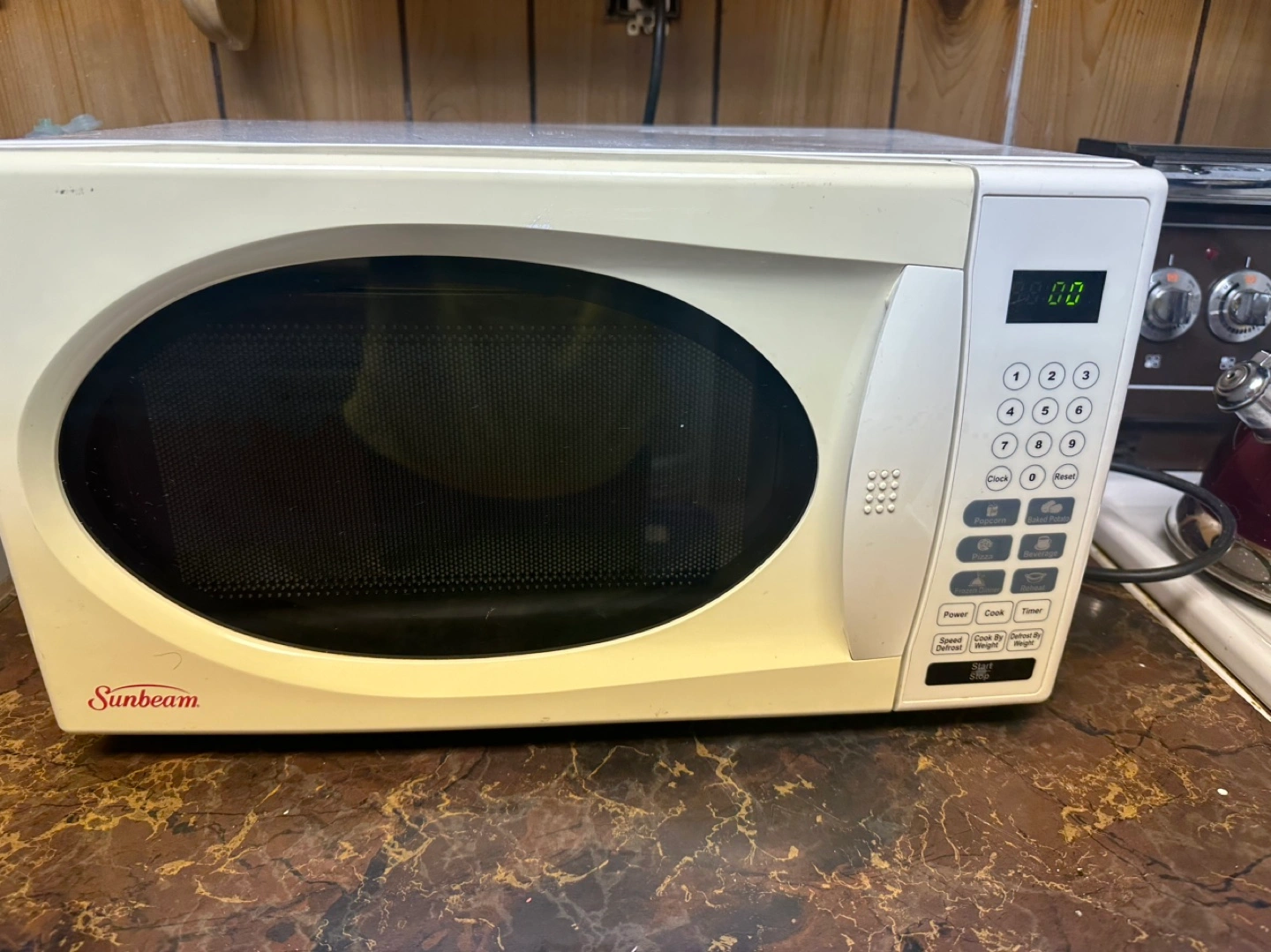 Used Sunbeam microwave, works great. Comes with turntable. Has some scuffs and marks. Just cleaned it inside it’s a little stained works well.