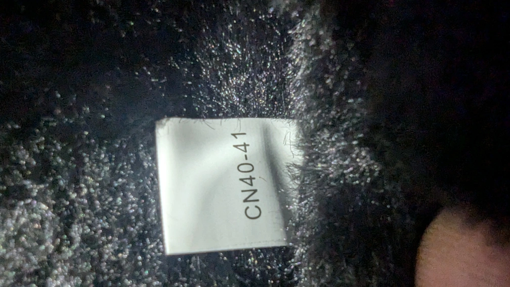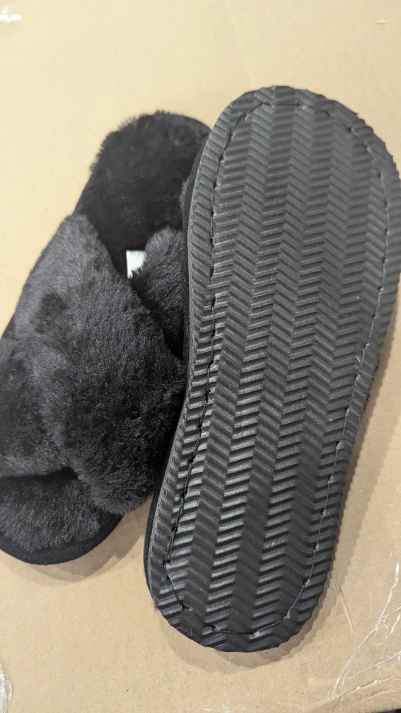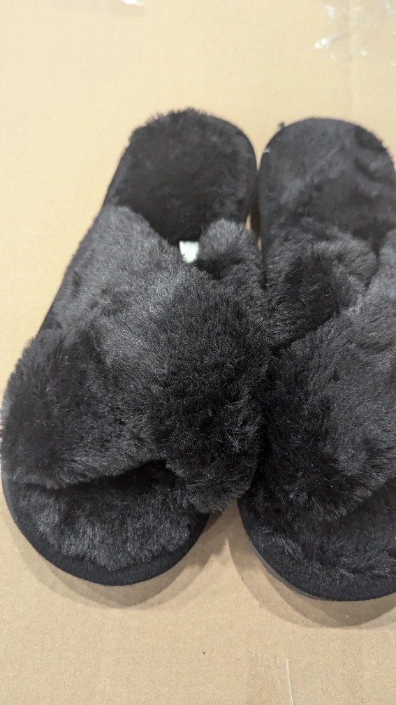 Black fuzzy slippers with a cross-strap design. Soft and comfortable. Size CN40-41