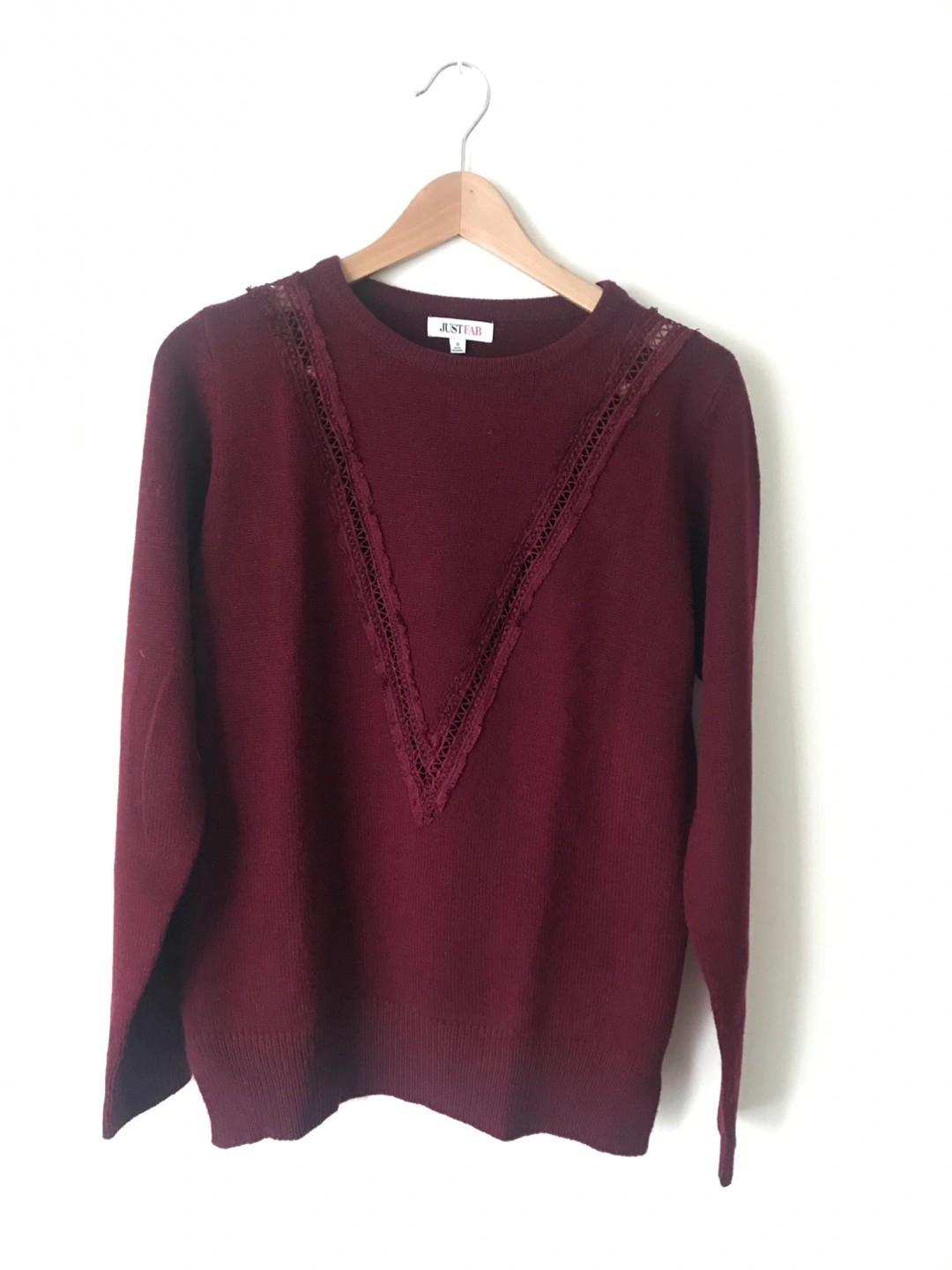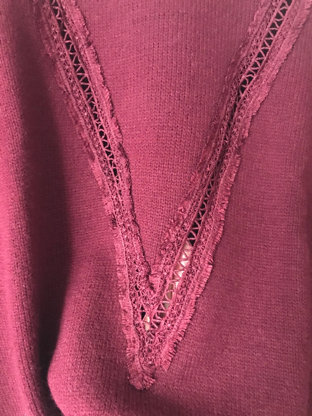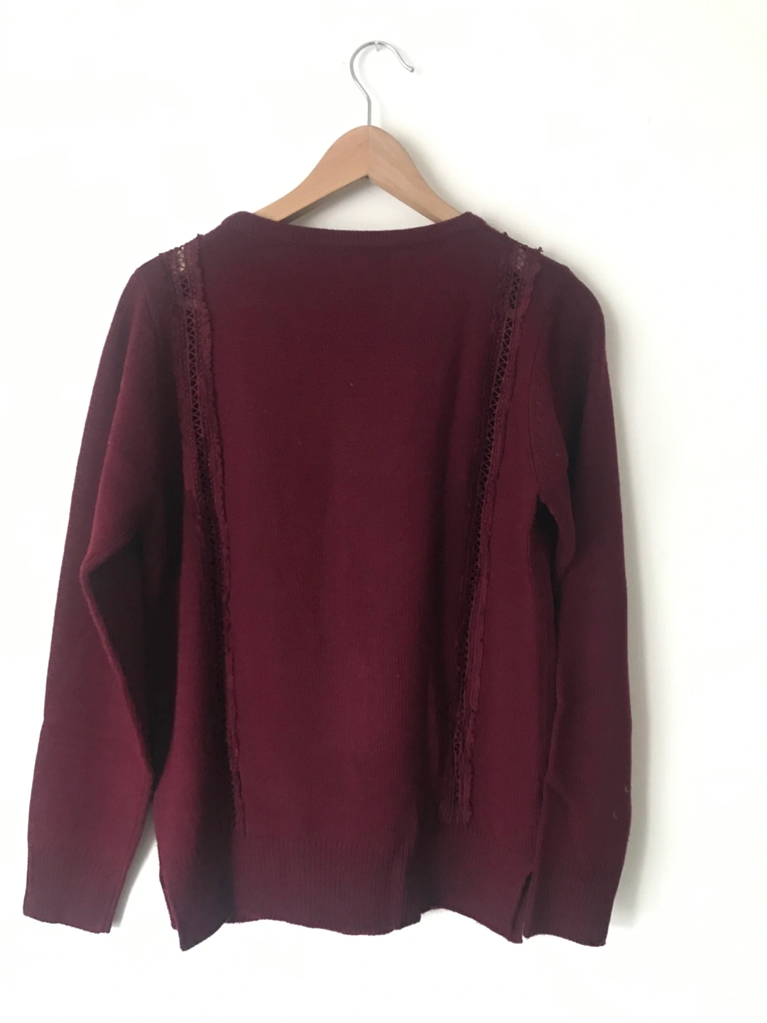 610Burgundy sweater with lace detail on the front and back. Long sleeves and a round neckline. Pick up only, Wilson Heights and Sheppard area