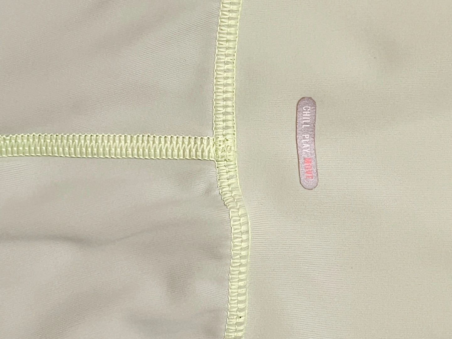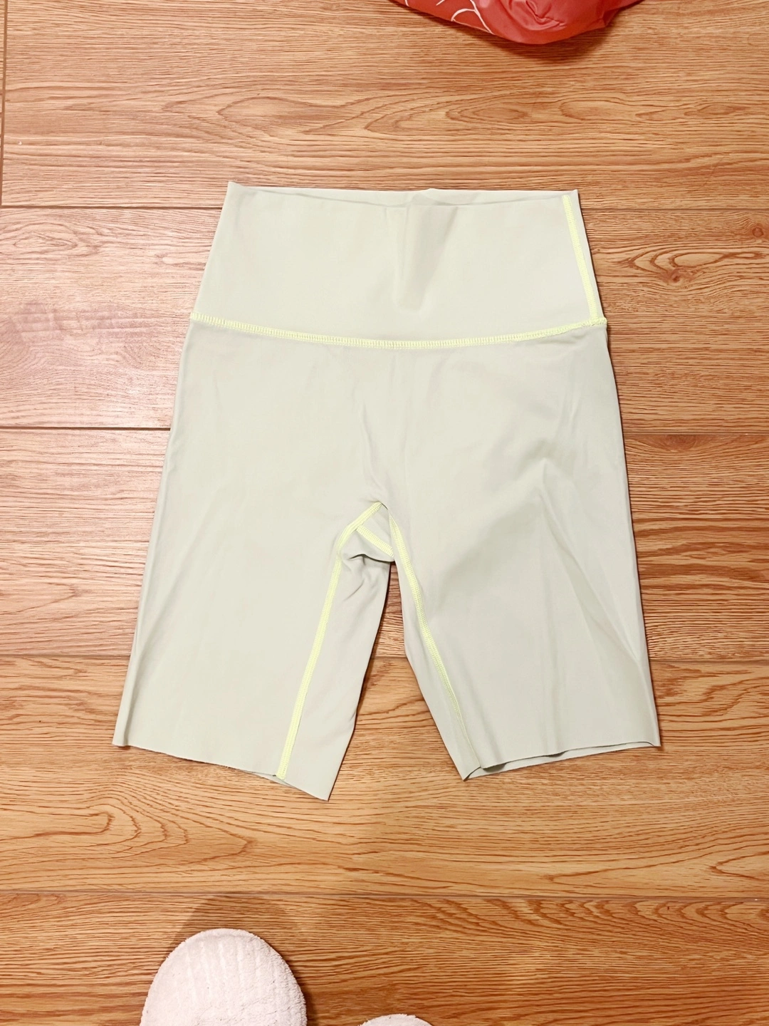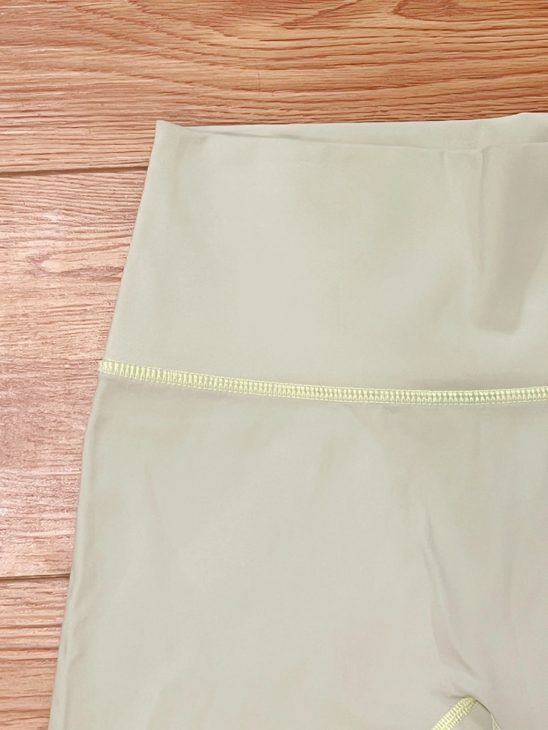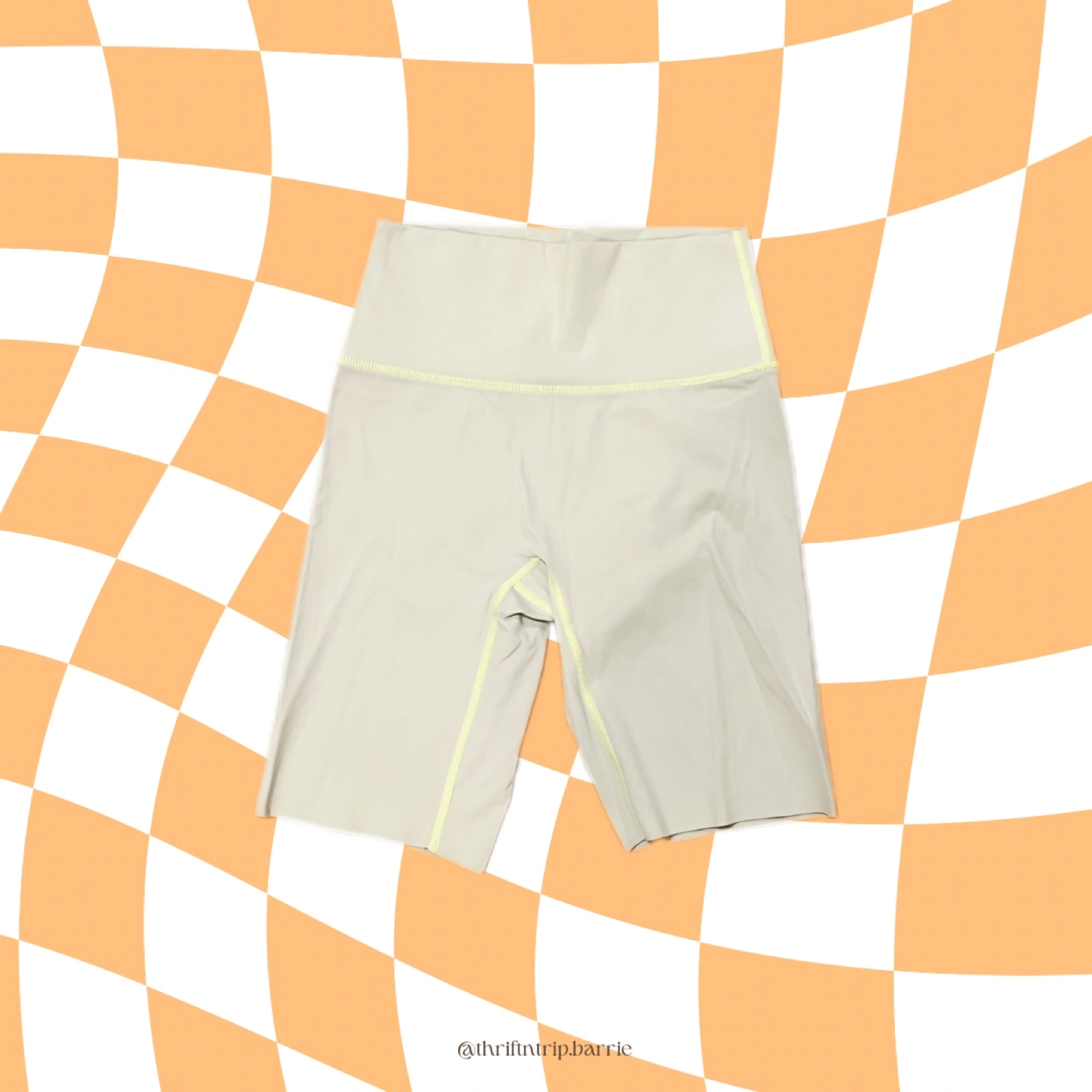 65High waisted bike shorts. Light green colour with neon yellow stitching. Size Medium.