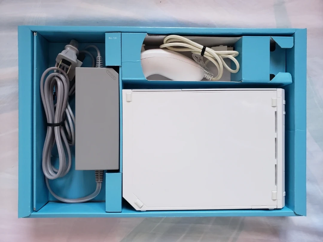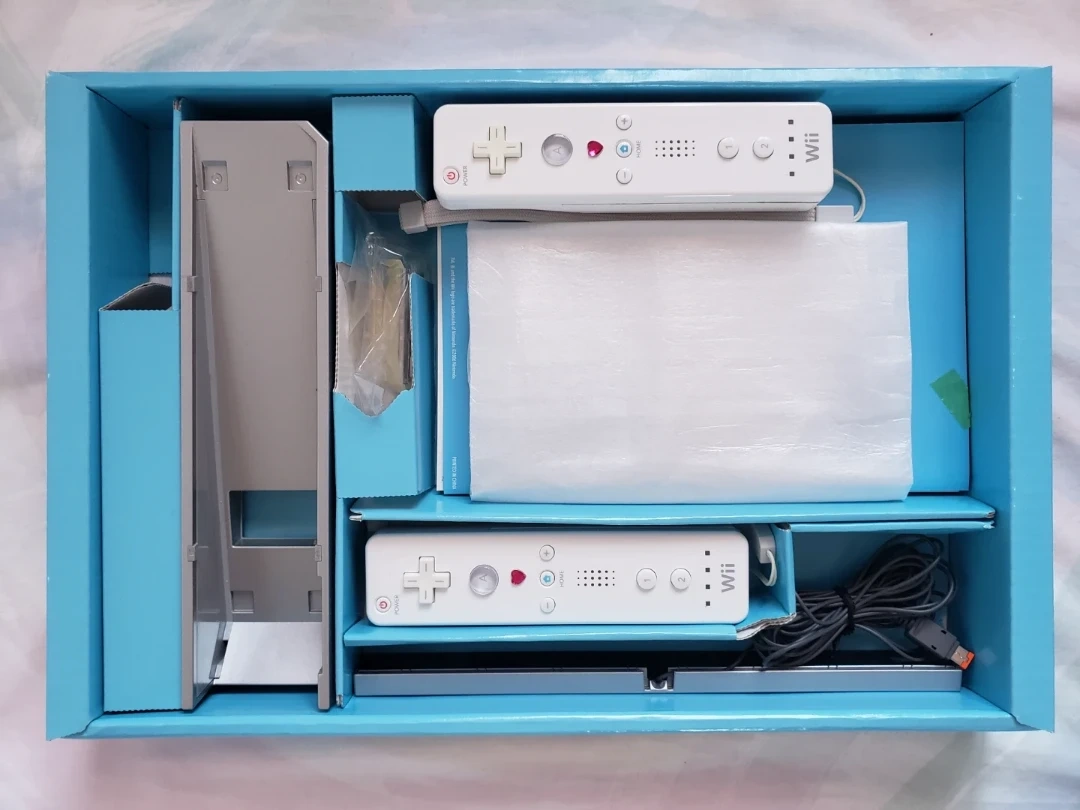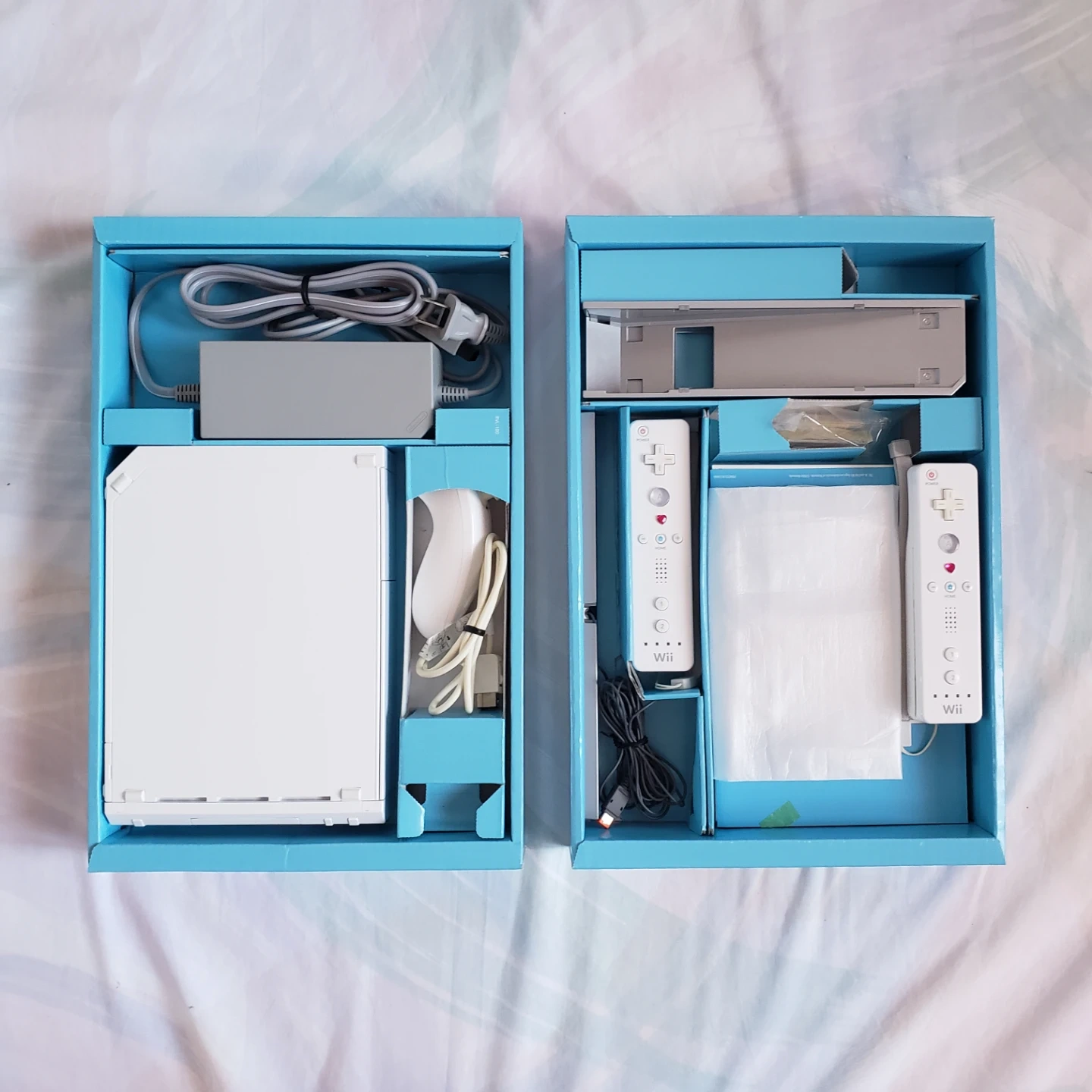 Console is in its original box with all accessories (power adapter, AV cables, sensor bar, stand, instructions manual, 2 Wii remotes, 1 nunchuk)
