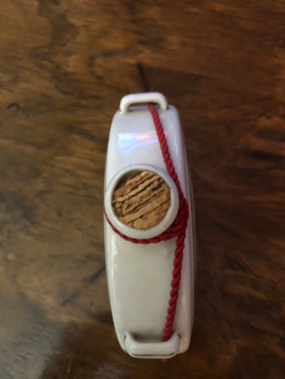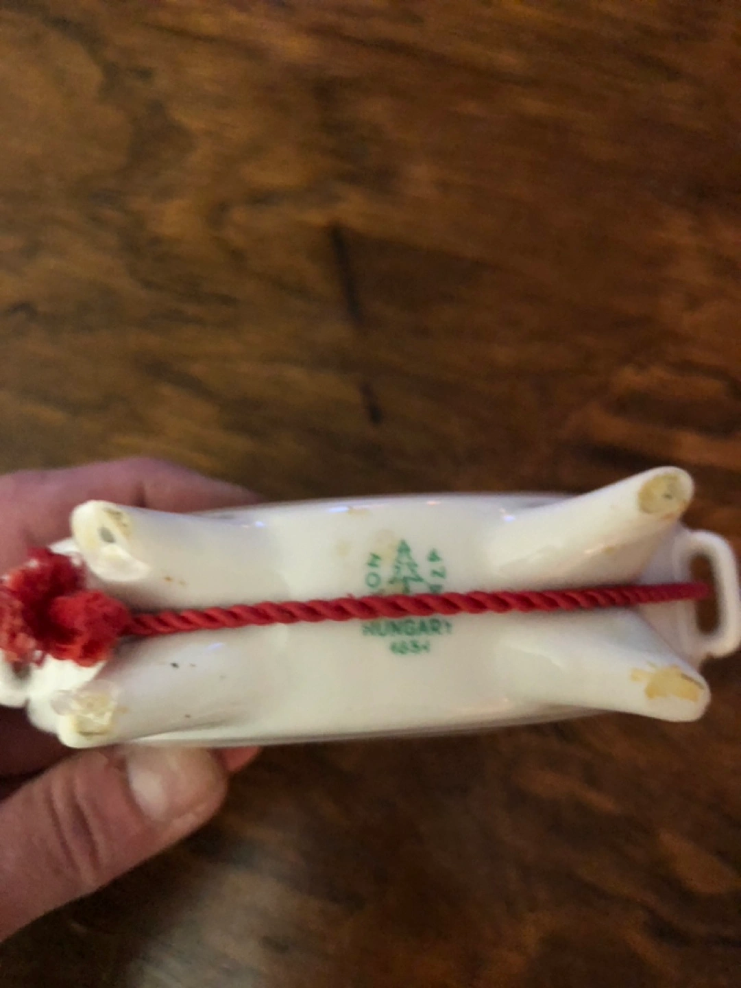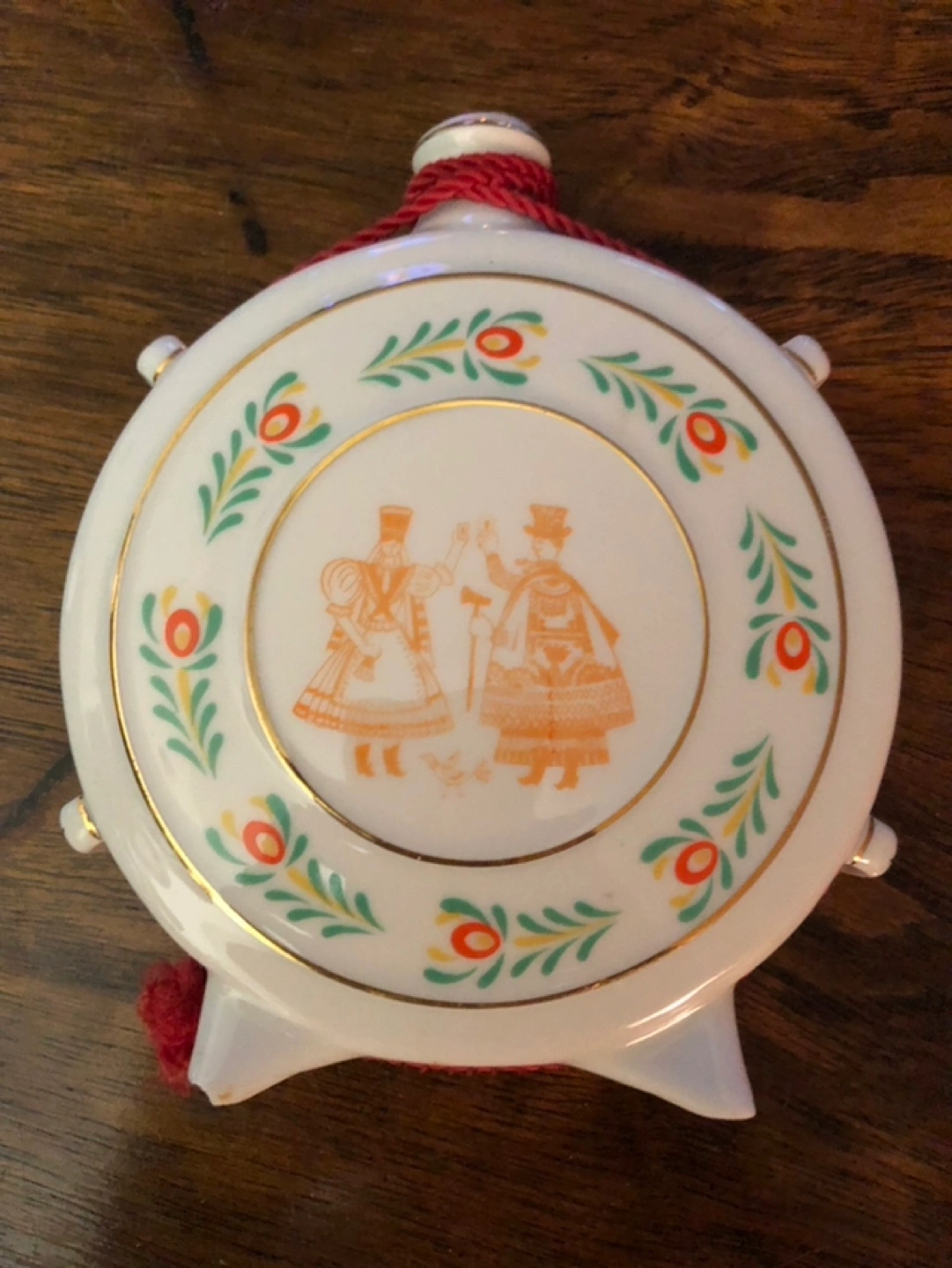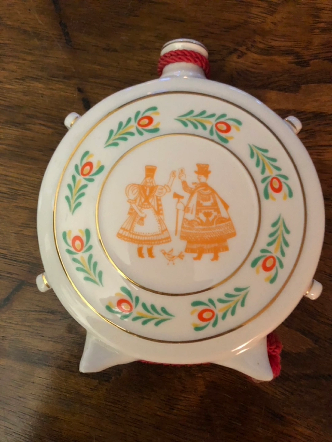 Vintage porcelain flask with cork top and red cord. Decorated with a scene of two people in traditional dress. Made in Hungary.