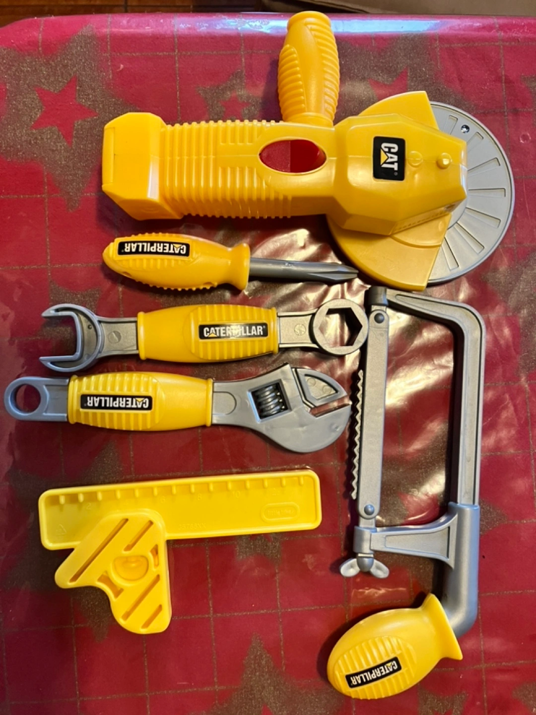 Caterpillar Set of toy tools, includes a saw, wrench, screwdriver, a tool with a blade, and a ruler. Yellow and grey plastic.