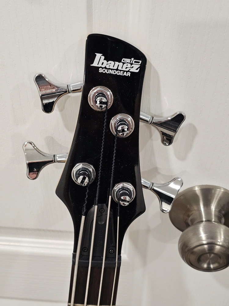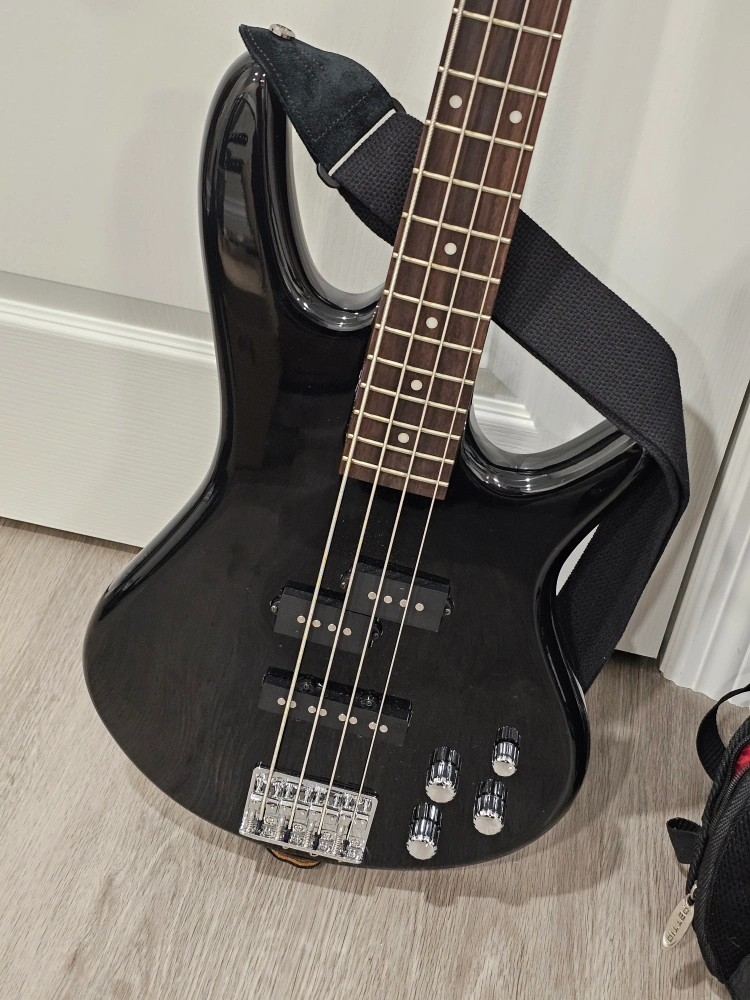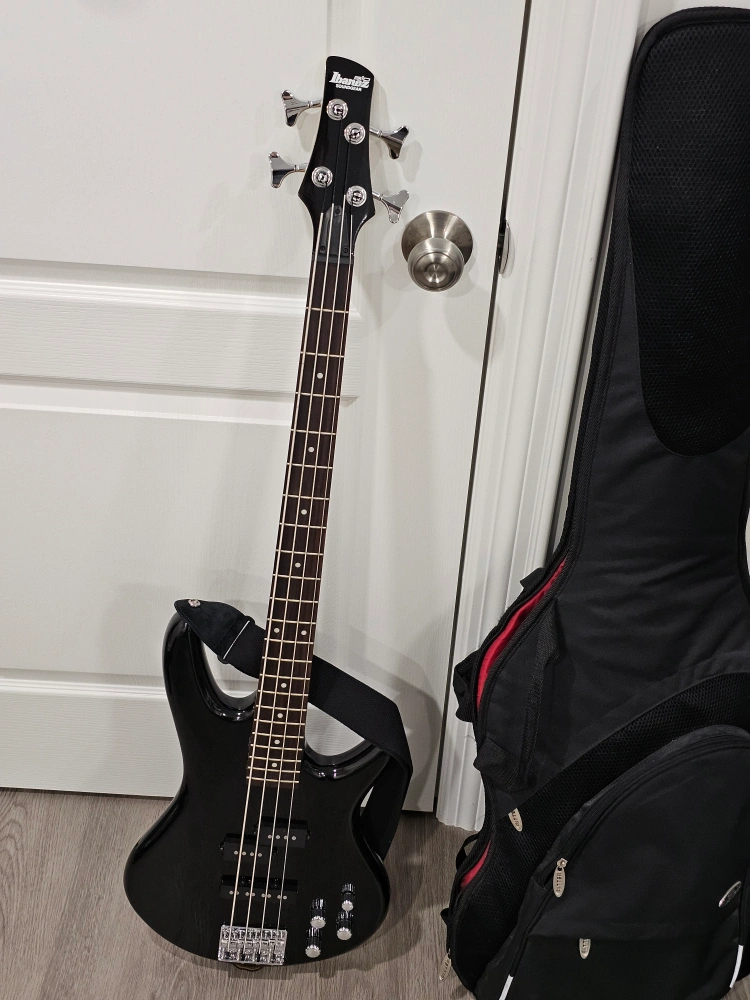Ibanez GSR200 Black electric bass guitar (4-string, 4 knobs), with a bag.