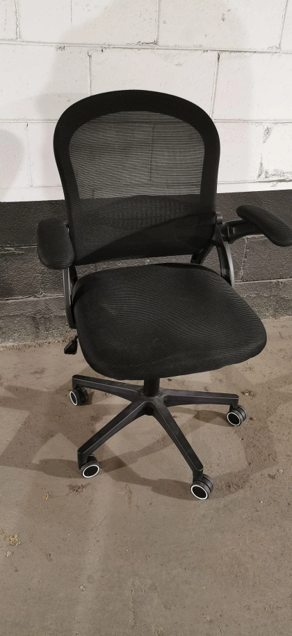 Office chair with mesh back and adjustable height. Features armrests and wheels. In good condition.